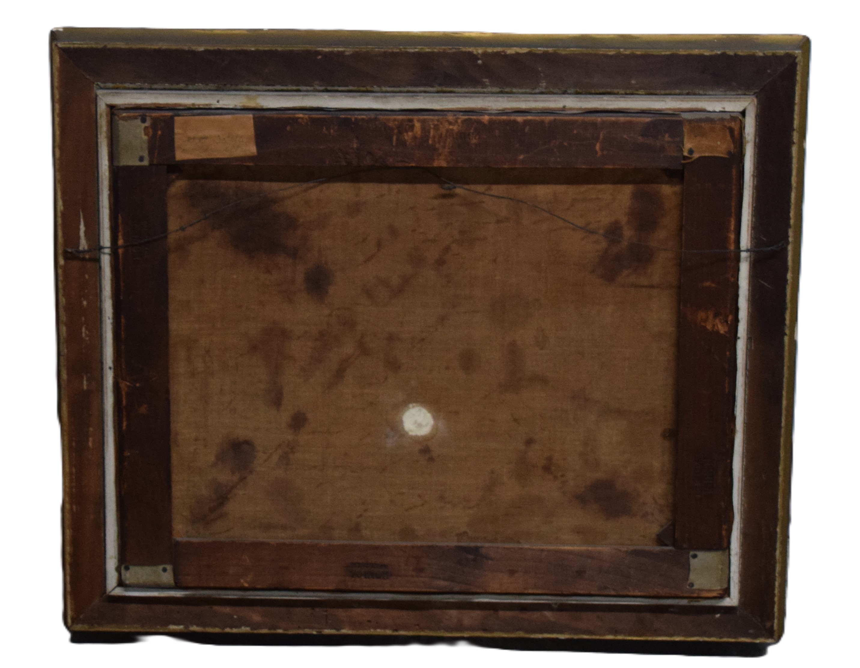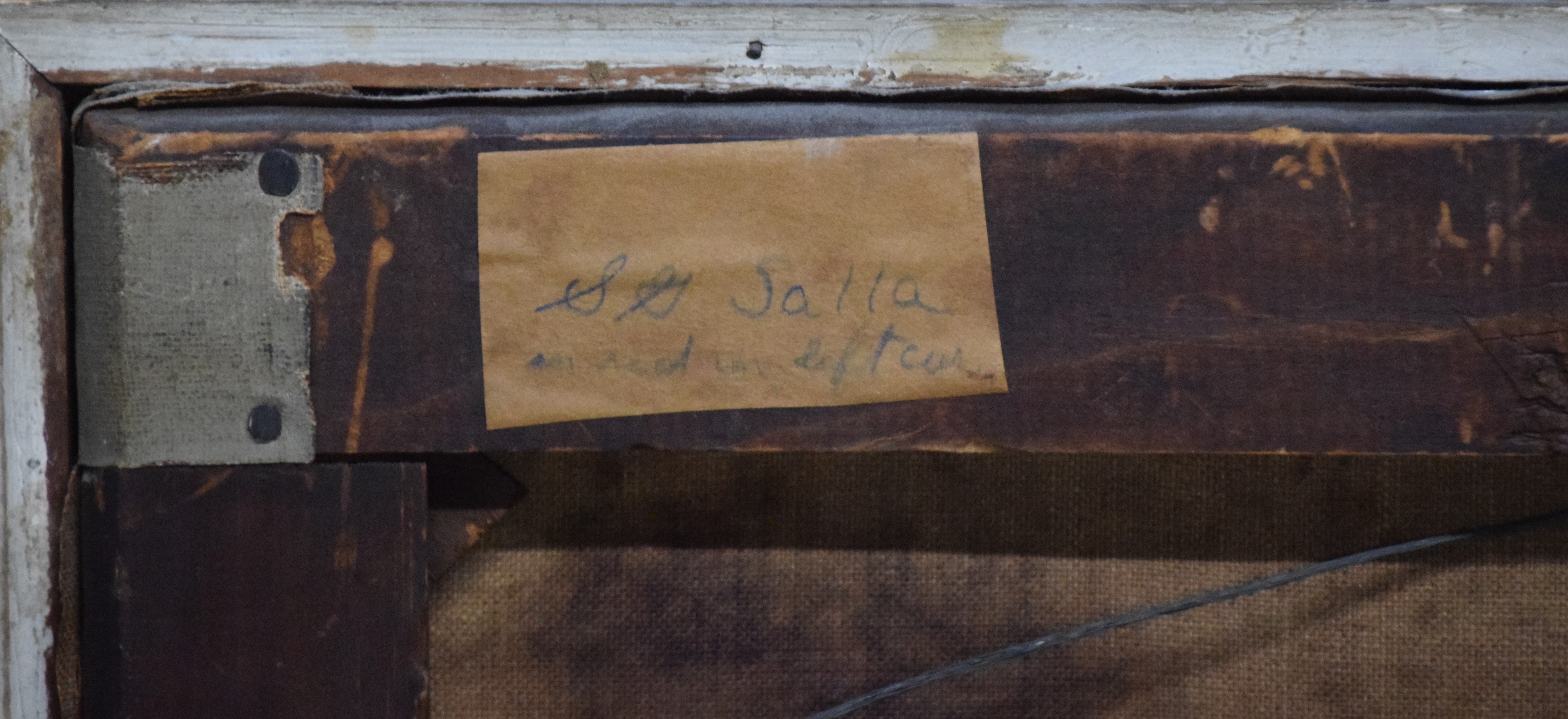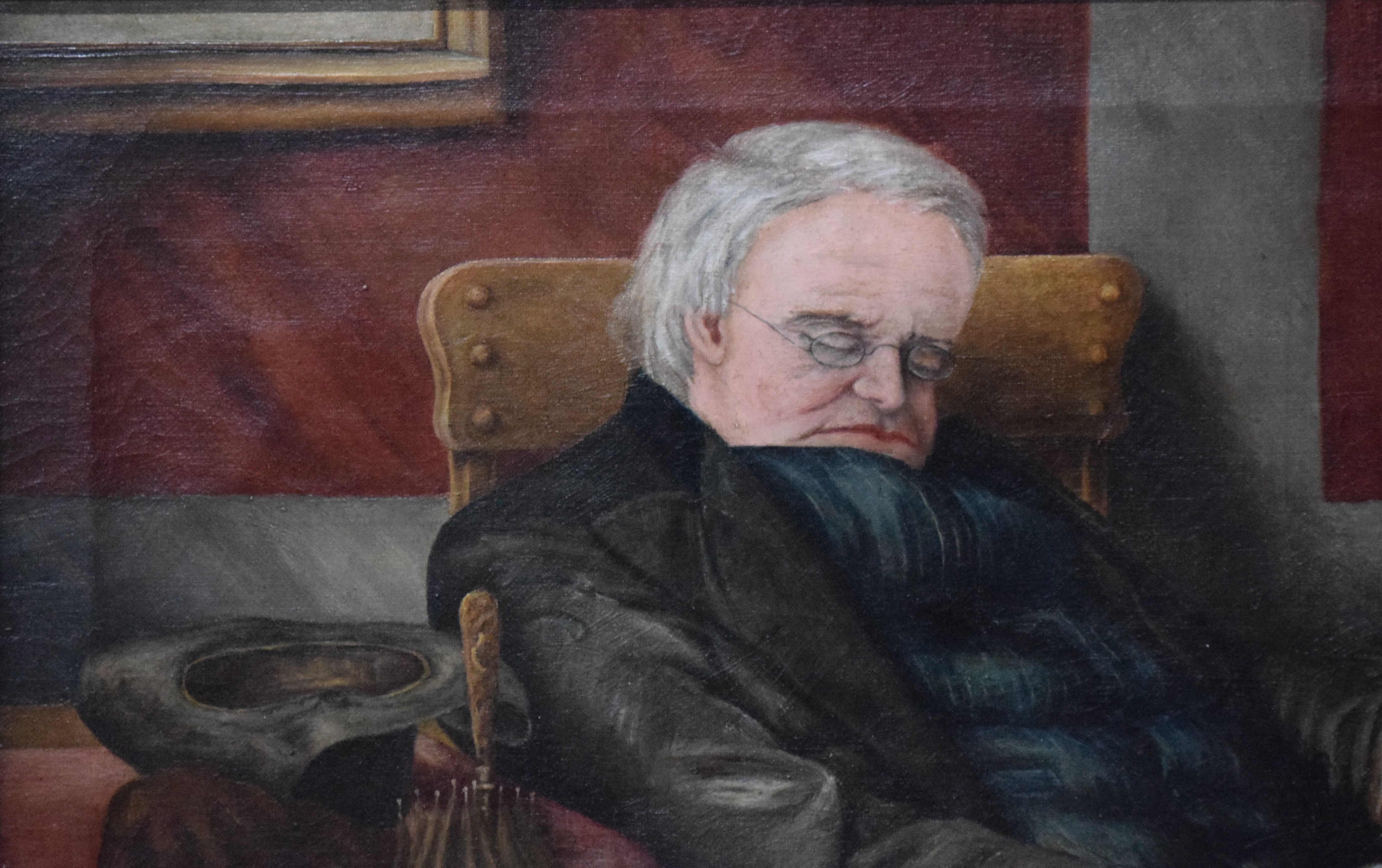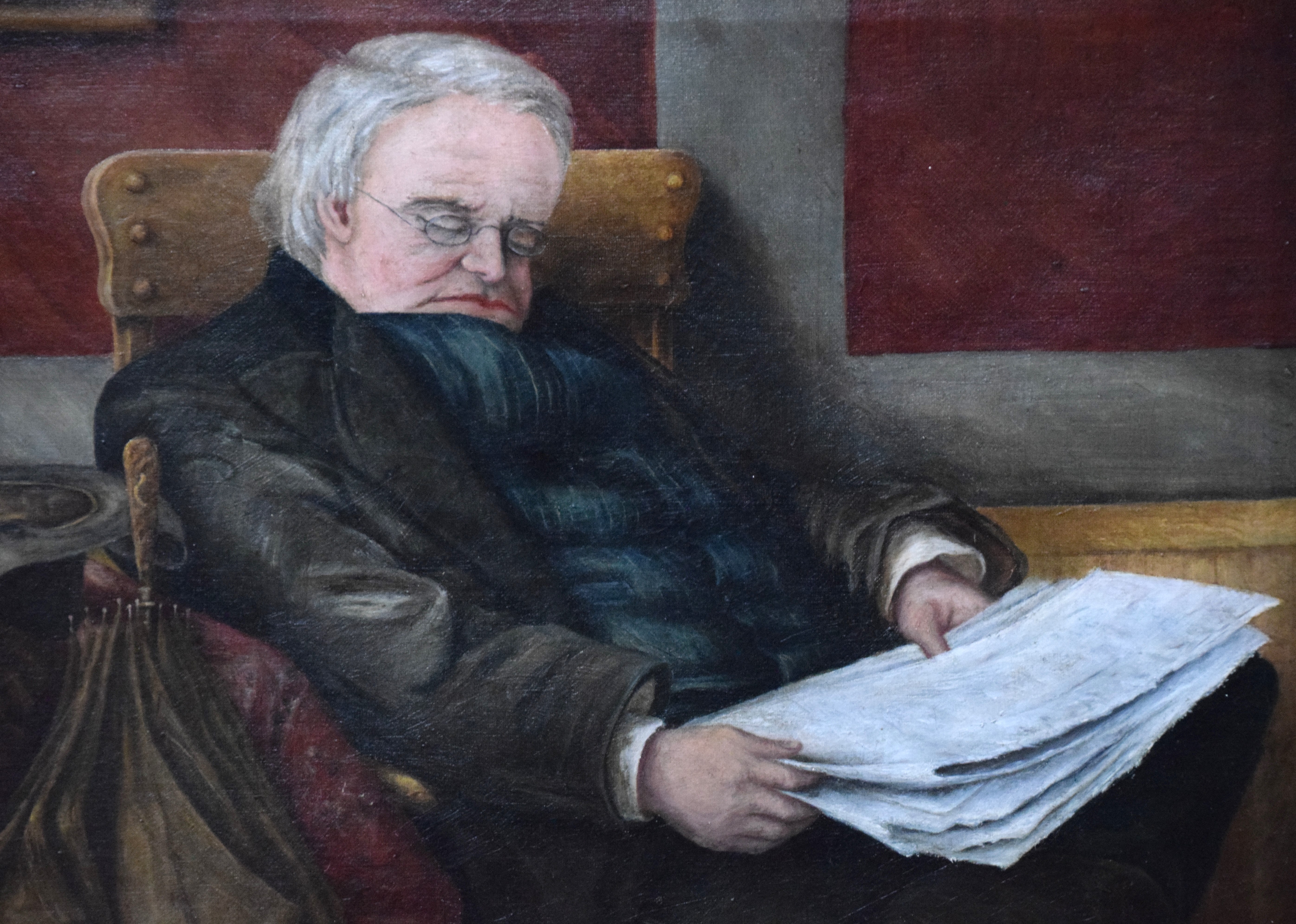 Framed 19th Century oil on canvas portrait of a seated gentleman with newspaper in hand, snoozing, wearing worn shoes. Signed on back S.G. Salla. Dimensions: 15.5″ x 19.5″ Image size; 20.5′ x 25″ Overall