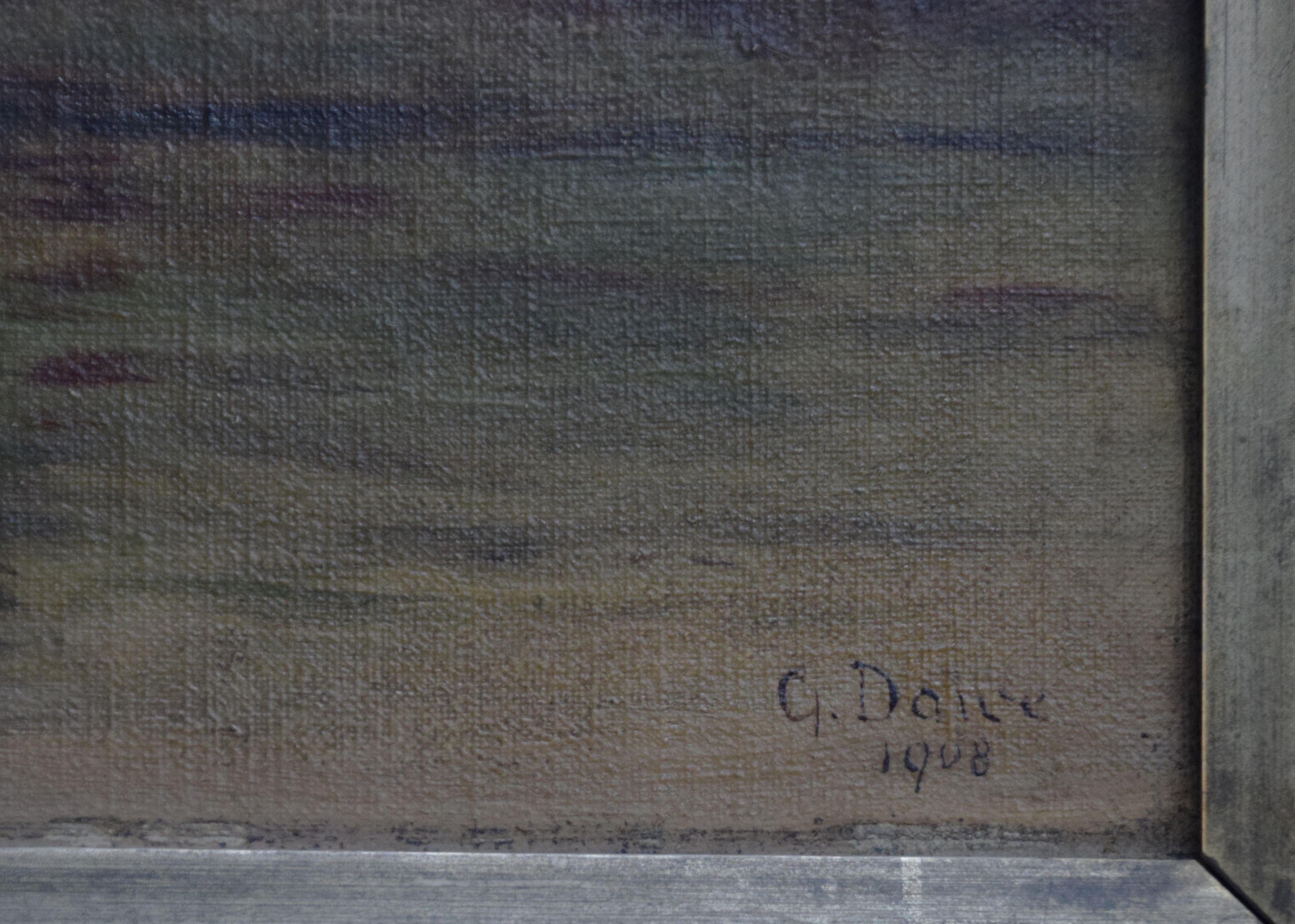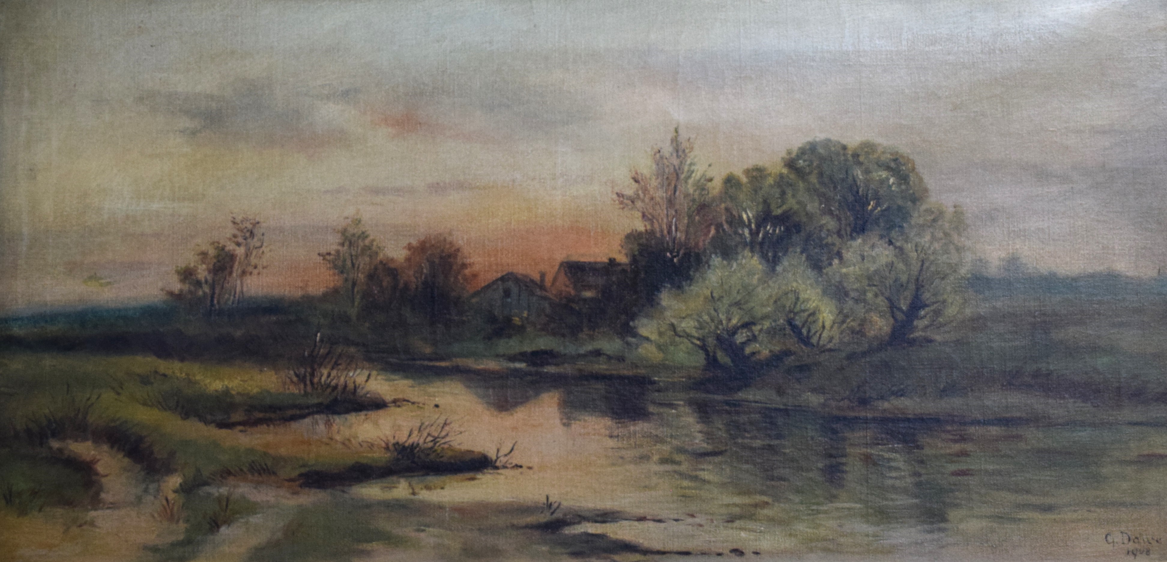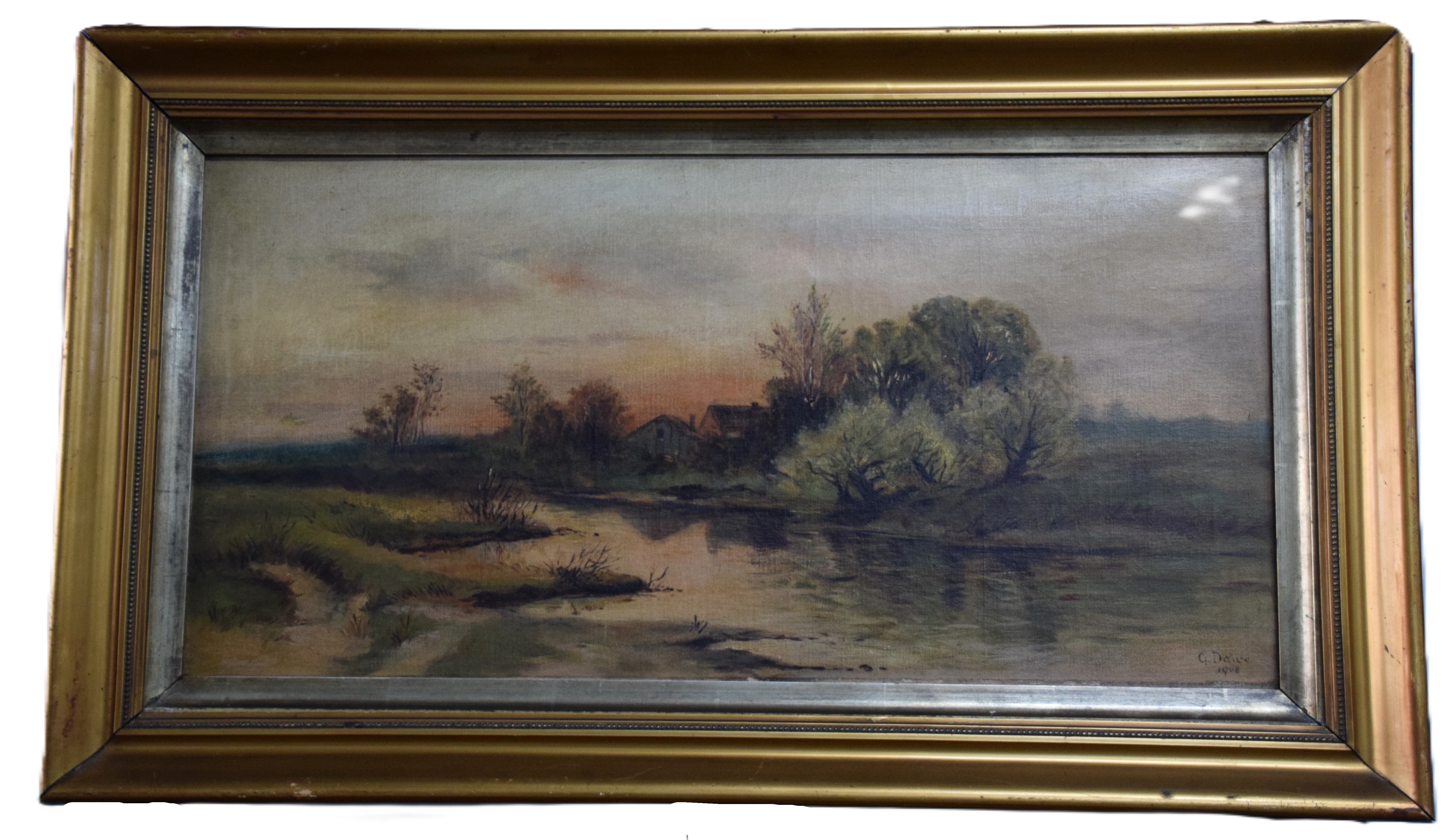 Framed New Hampshire landscape of a river/stream with a homestead. Signed lower right, G. Daire (Darce?), 1908. Dimensions: 12″ x 23.5″ Image size; 17″ x 29″ Overall