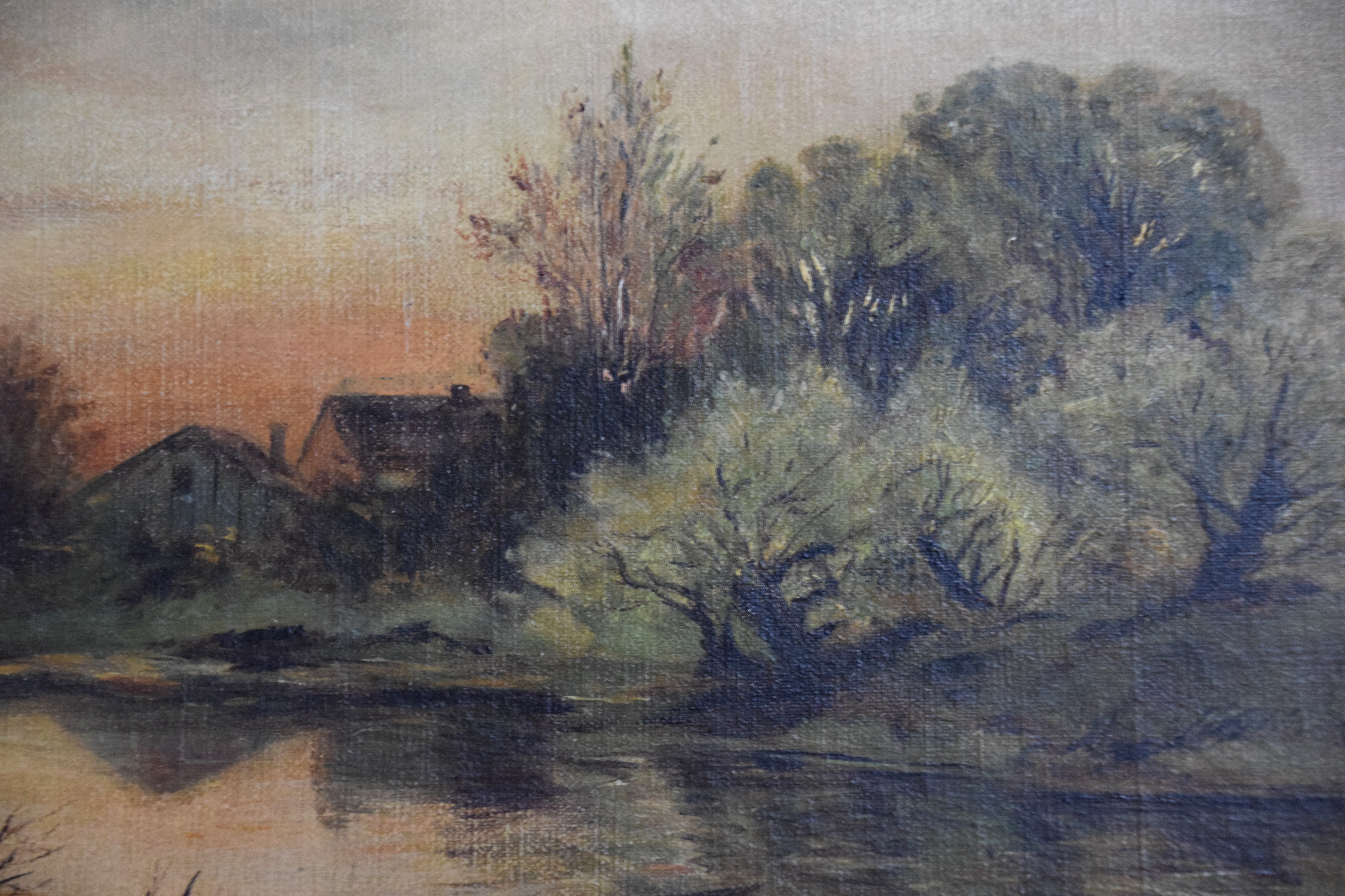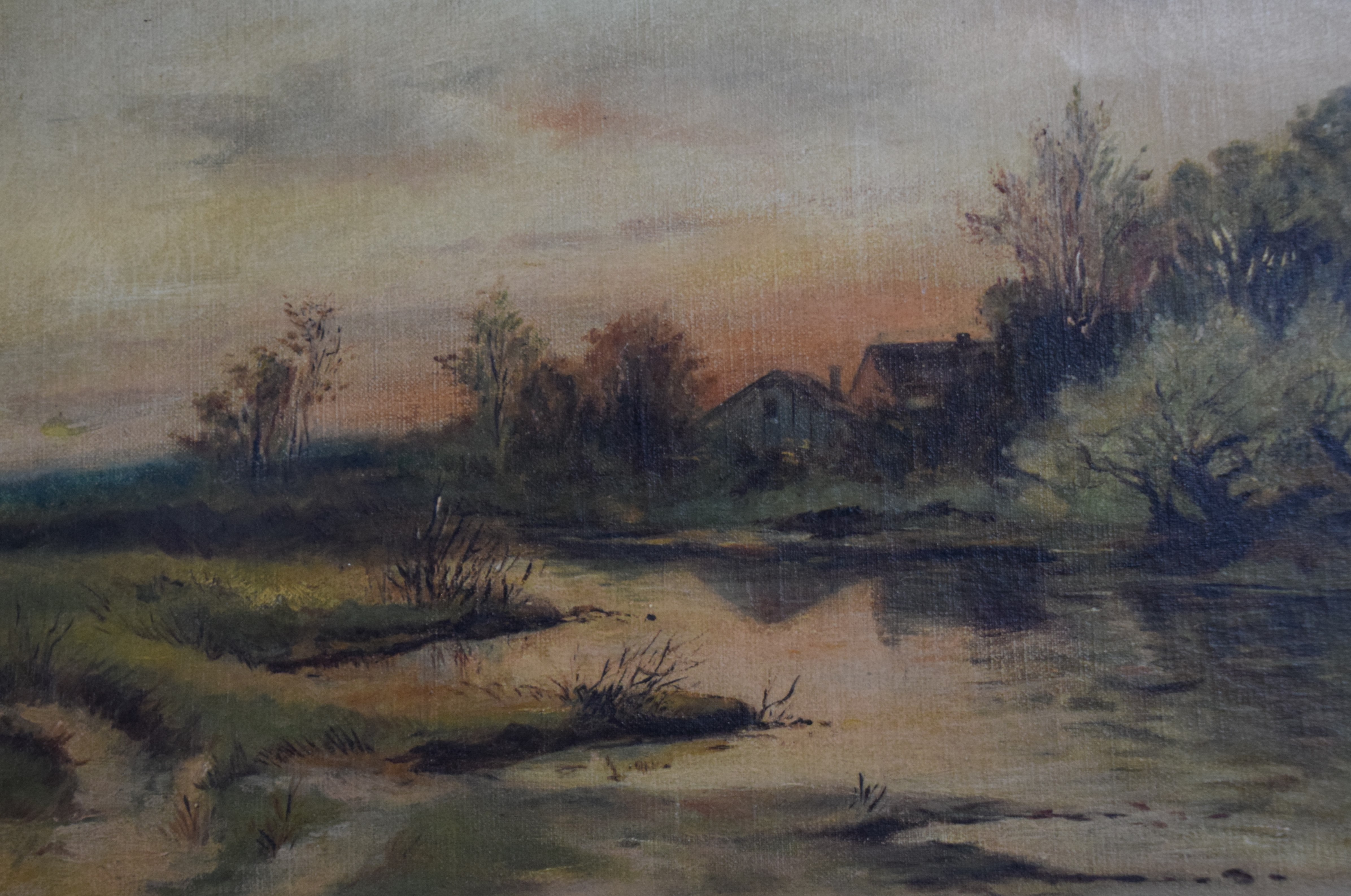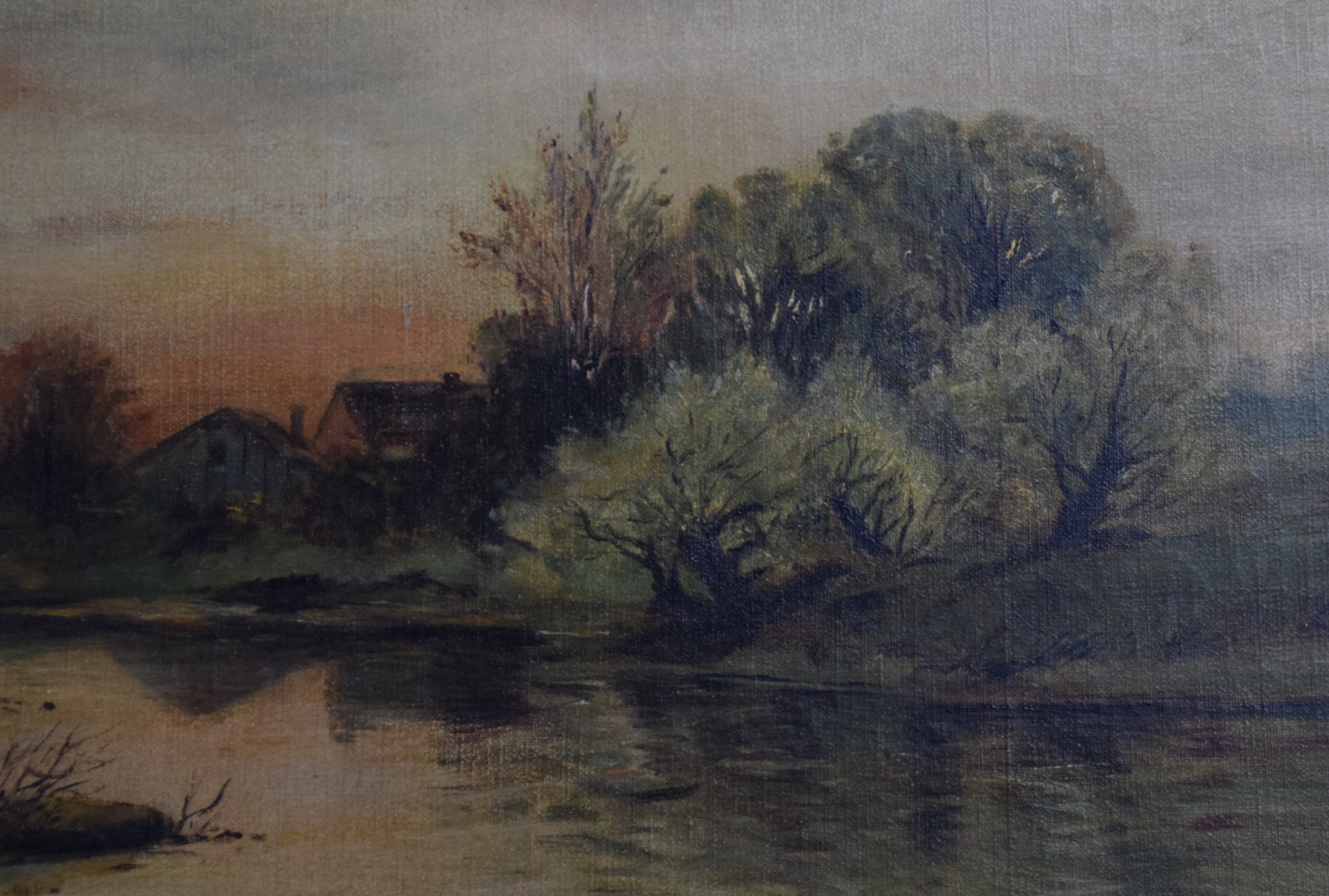 Framed New Hampshire landscape of a river/stream with a homestead. Signed lower right, G. Daire (Darce?), 1908. Dimensions: 12″ x 23.5″ Image size; 17″ x 29″ Overall