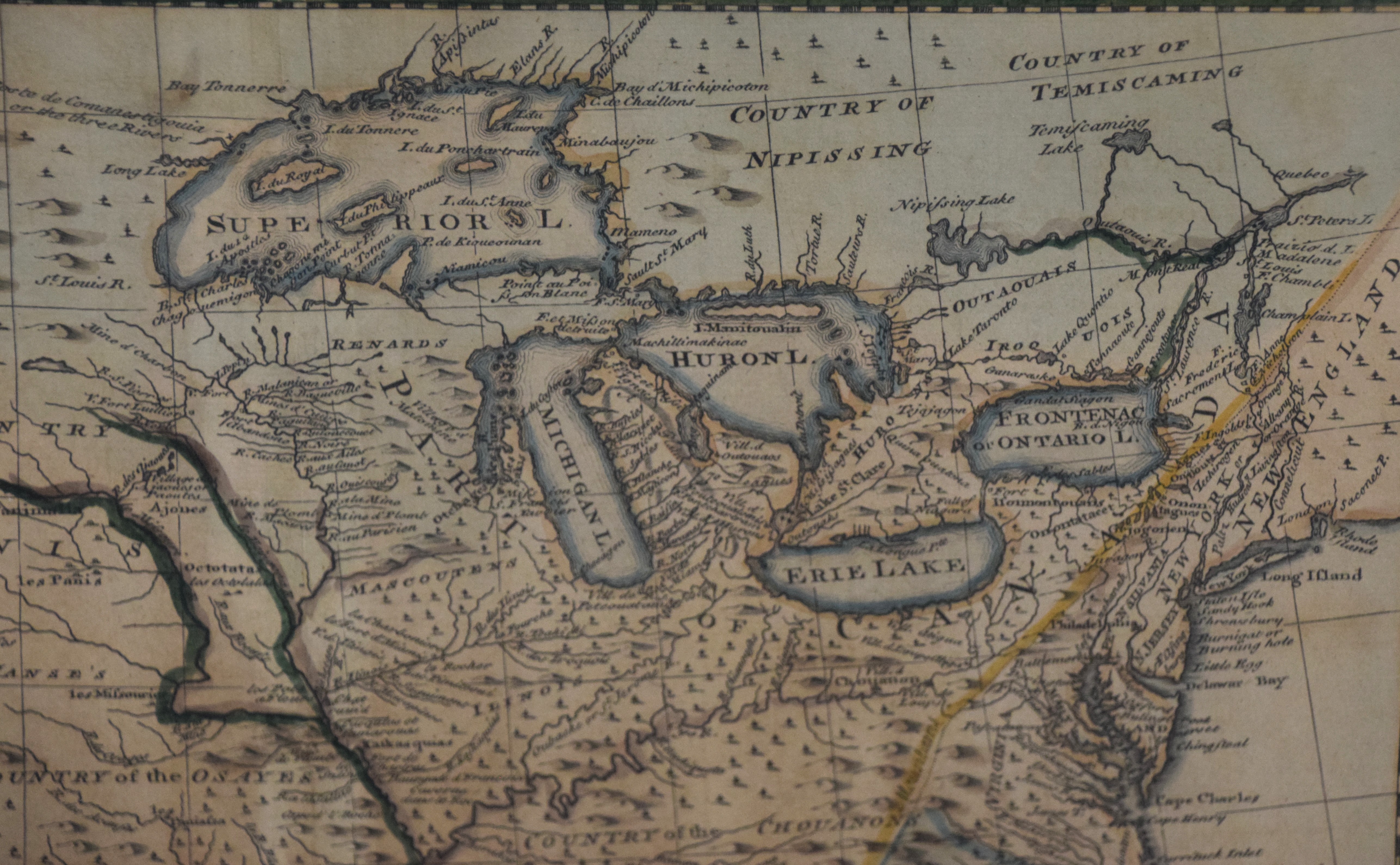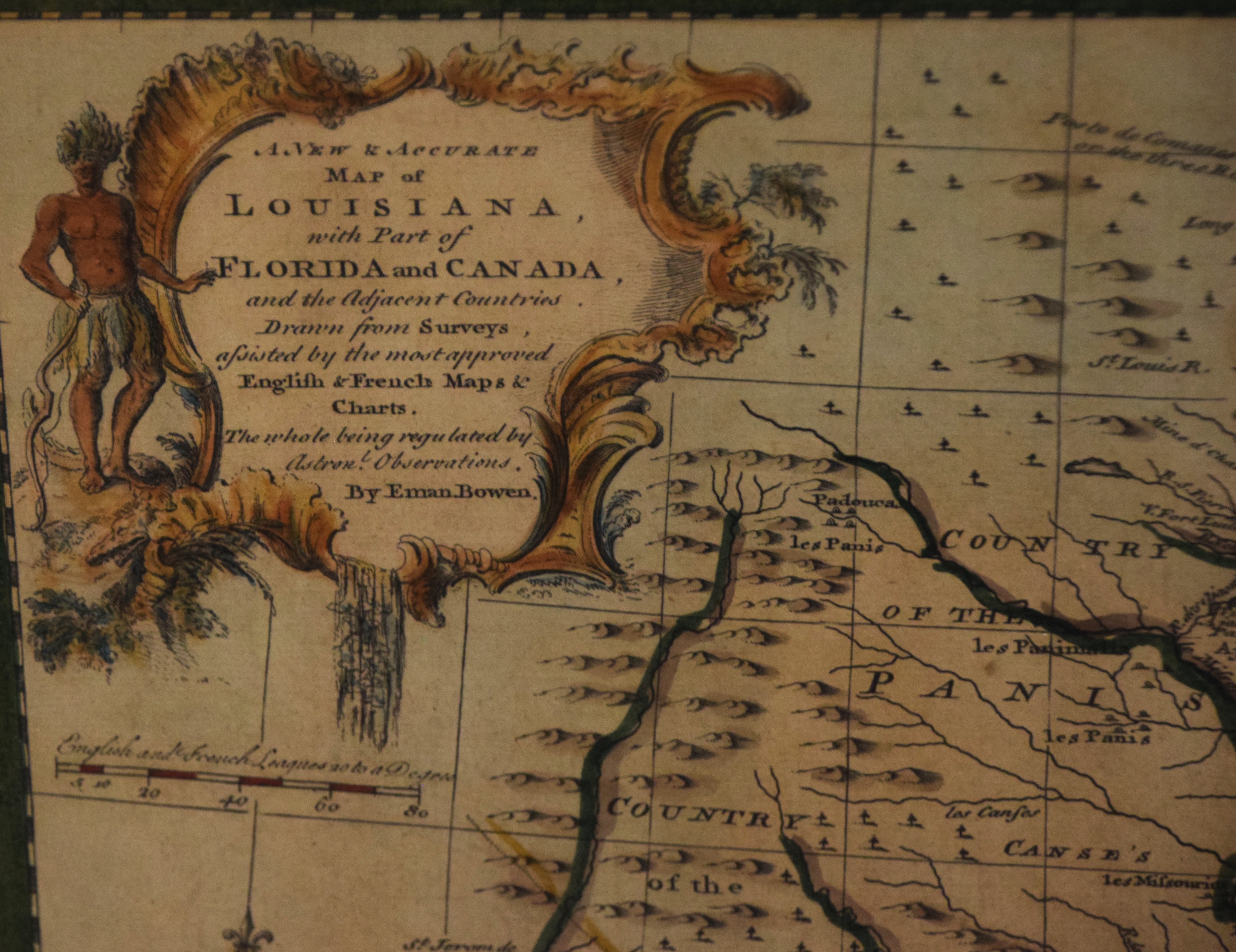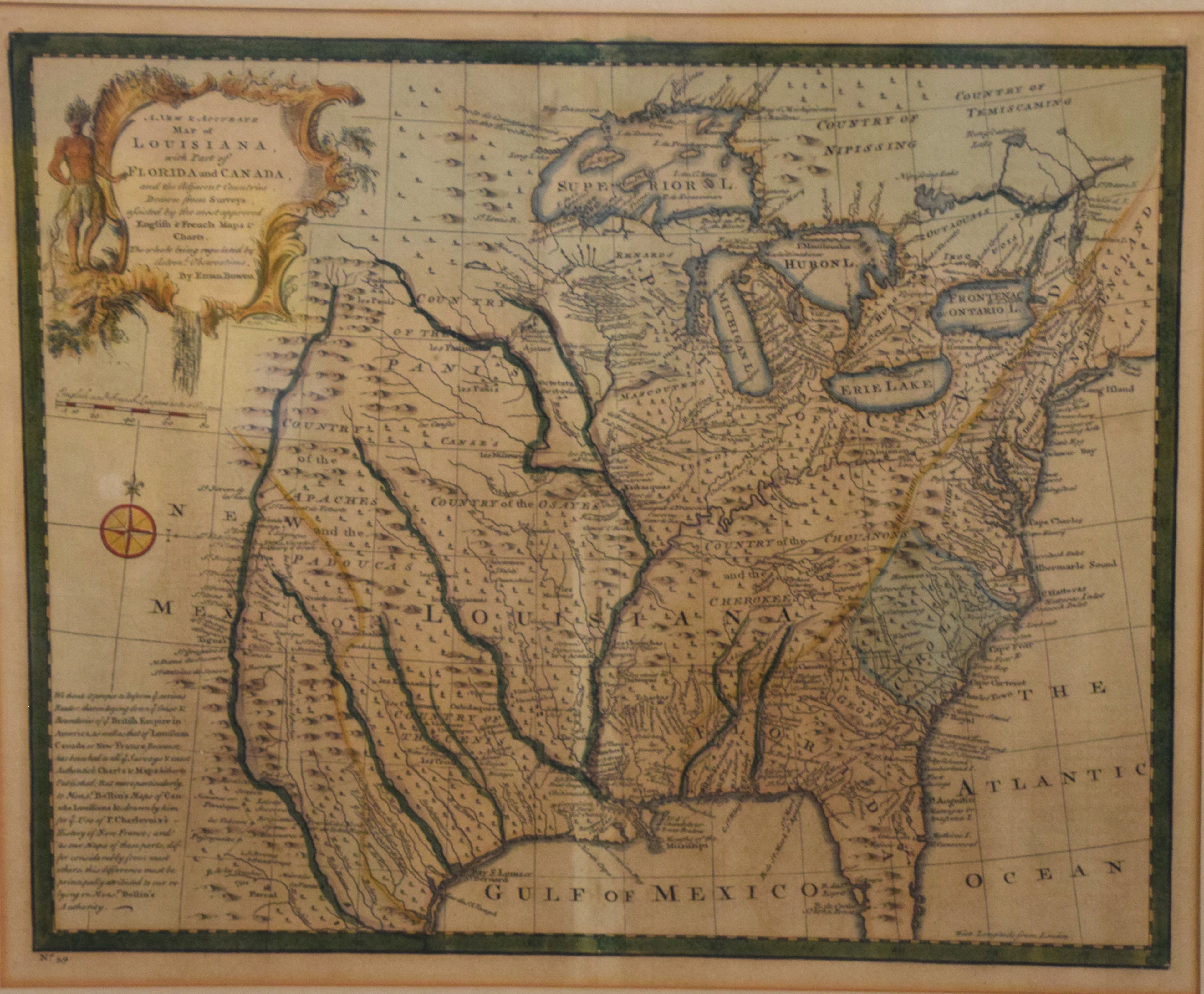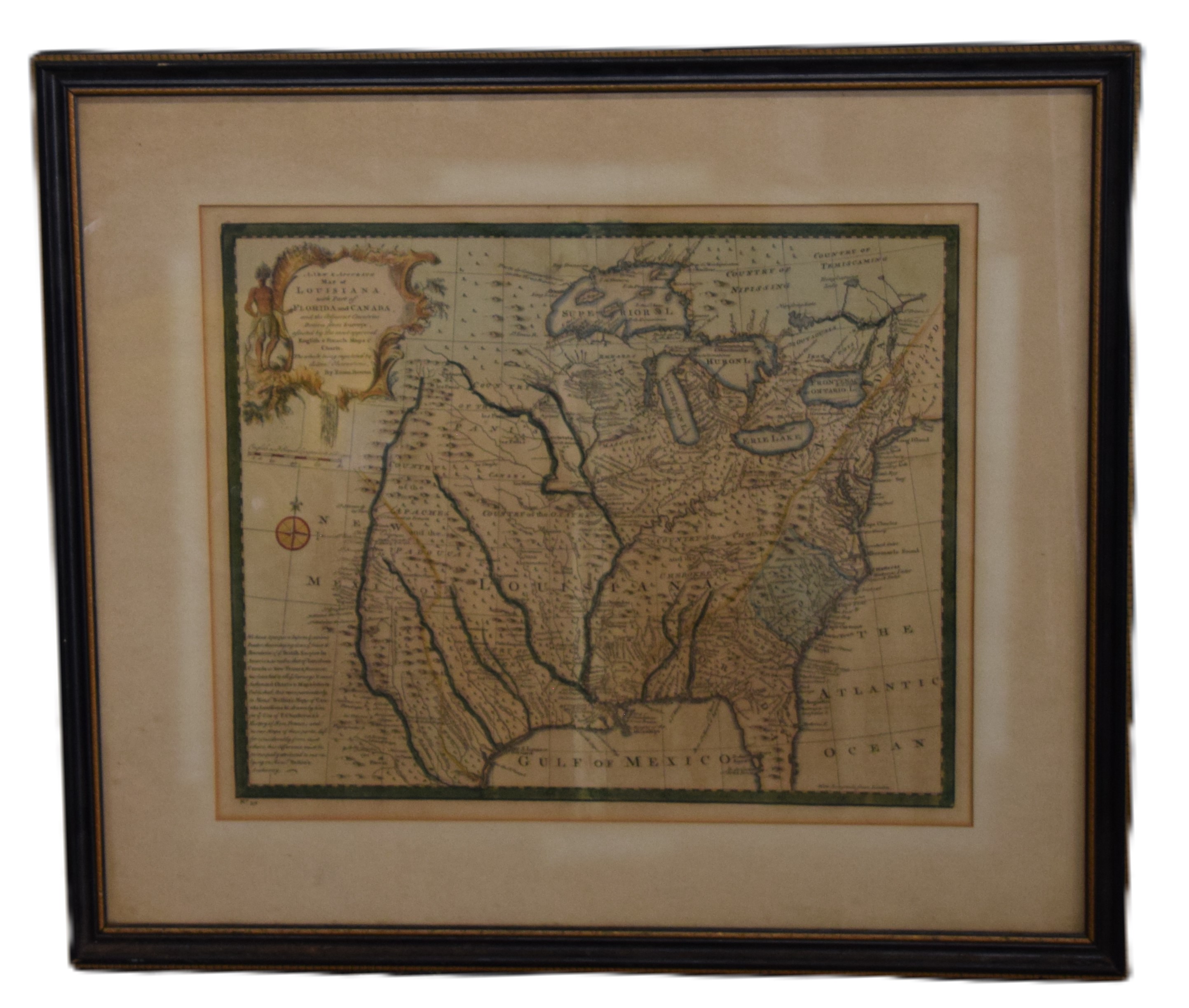“A New & Accurate Map of Louisiana, with Part of Florida and Canada”, and the adjacent countries by Emanual Bowen. Hand colored, framed, depicting the Great Lakes and New France. Published “In The Complete System Of Geography”, item #59 in 1747. Dimensions: 14″ x 17″, 22″ x 24.5″ Overall