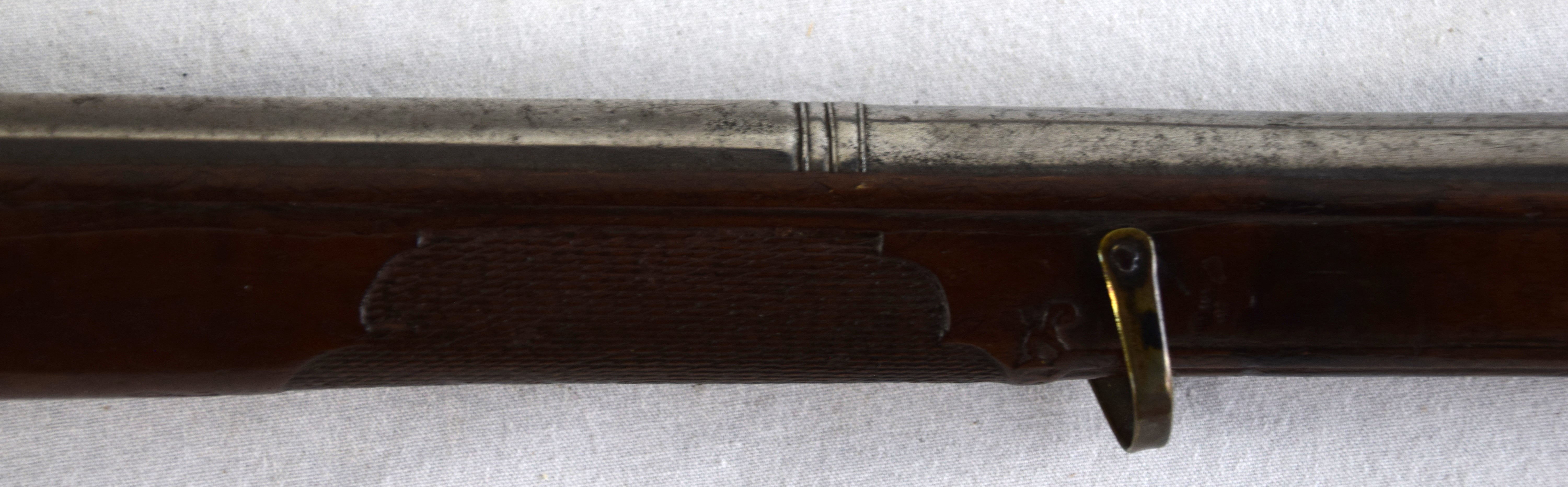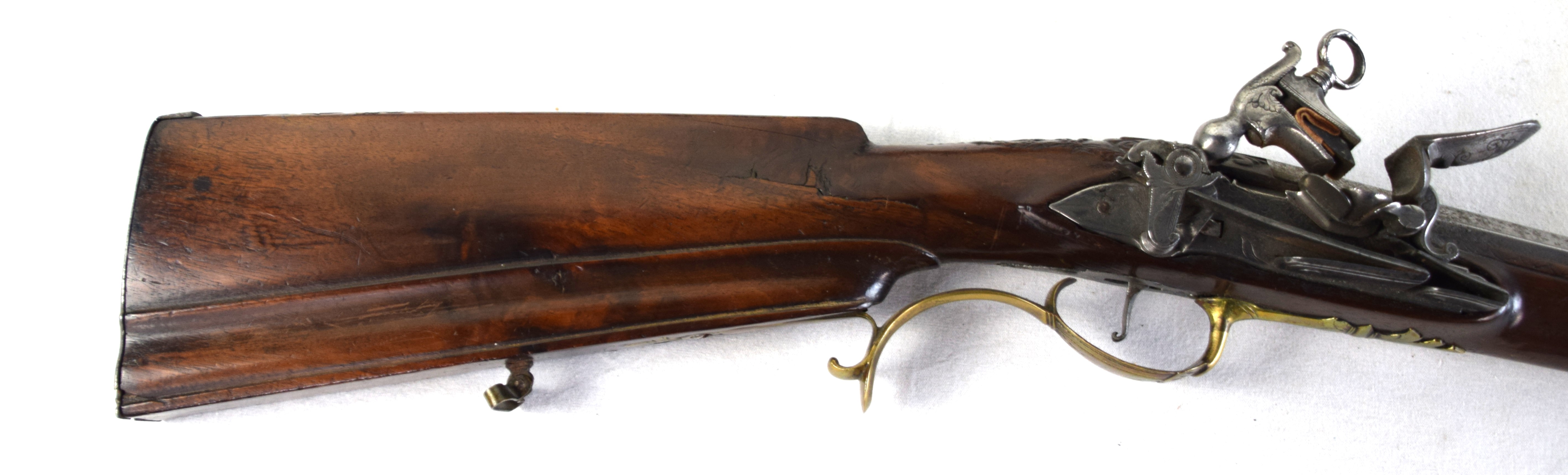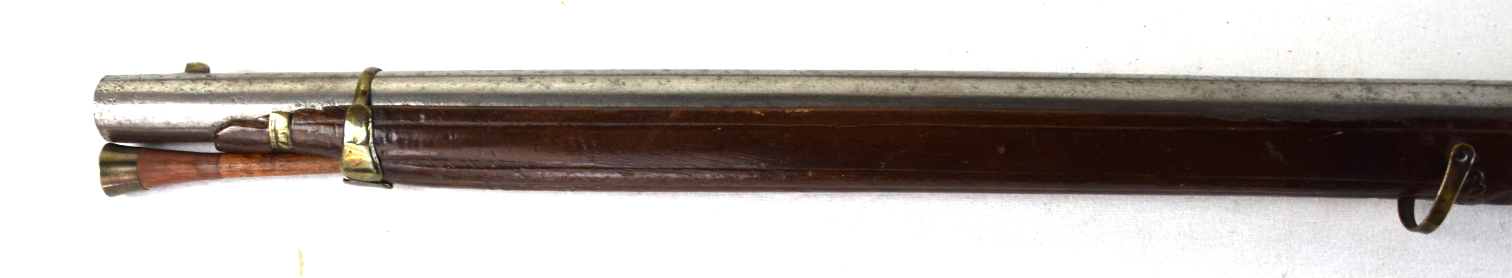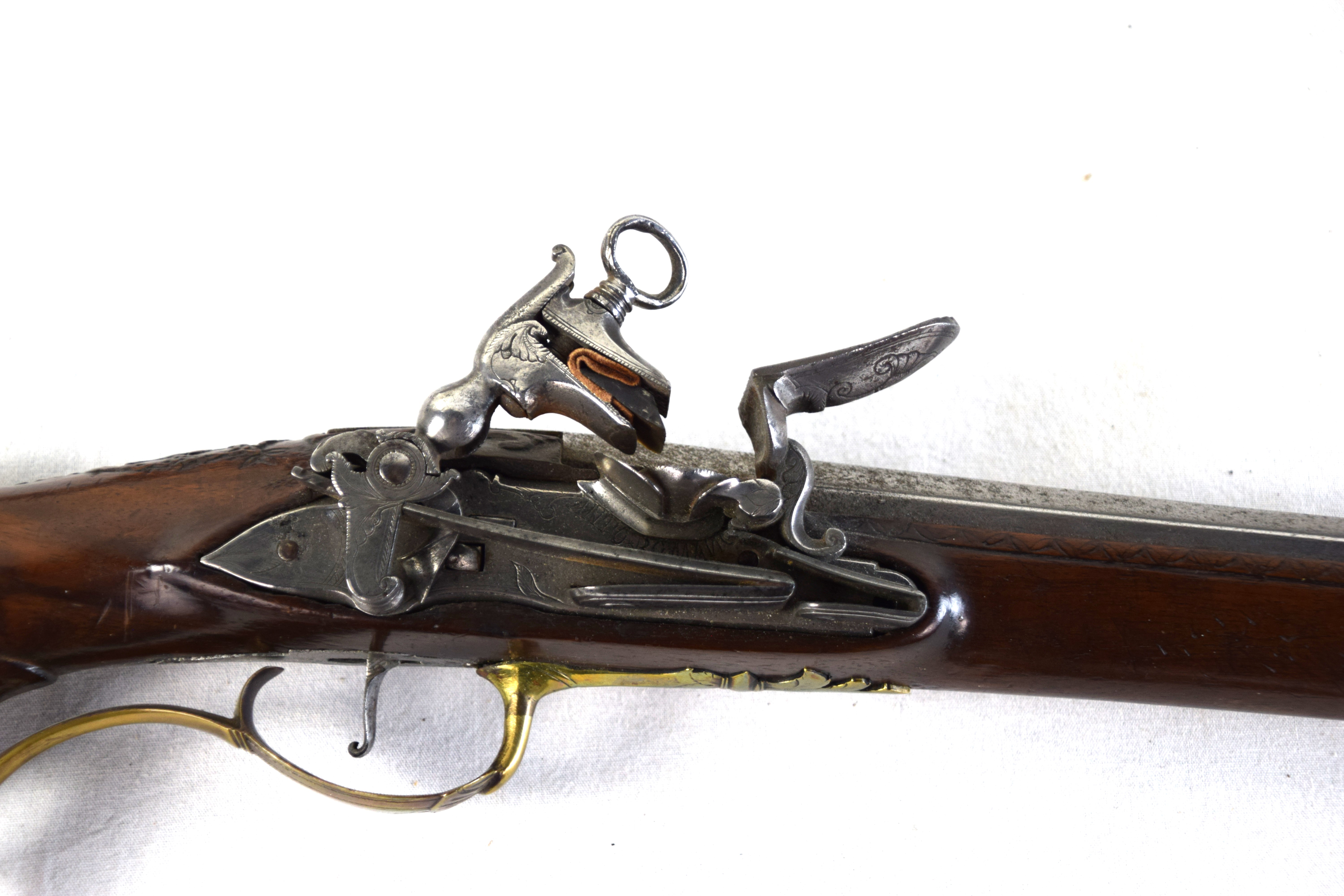 The Spanish light musket/colonial escopeta with Miquelet Lock was a .69 caliber musket used in the mid-seventeenth century by Spanish cavalry on the colonial frontier in both North and South America. This is a Miquelet lock marked “ANTO ROMAN”, finished bright metal with relief carvings in stock around barrel tang. Several of these muskets were still used during the Mexican War of 1848 on both sides, especially with the Texas Militia. Dimensions: 30″ Barrel, 44″ Overall