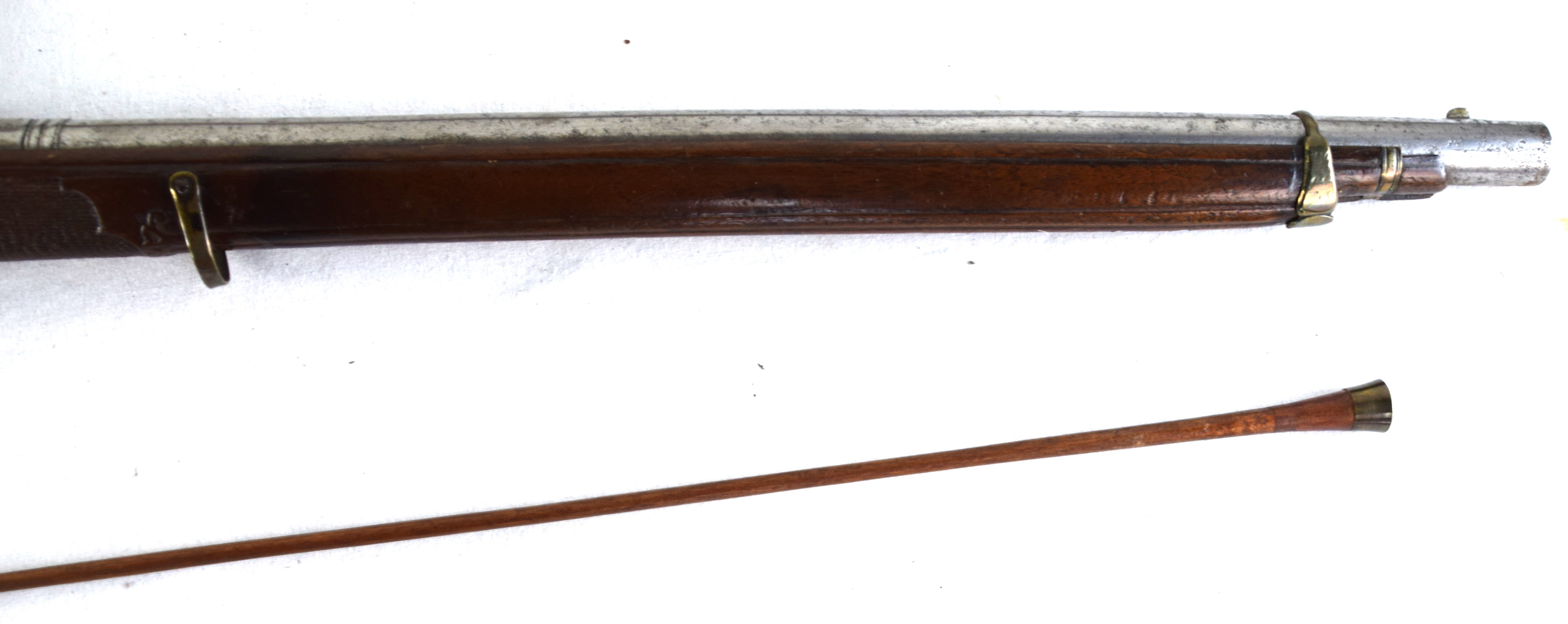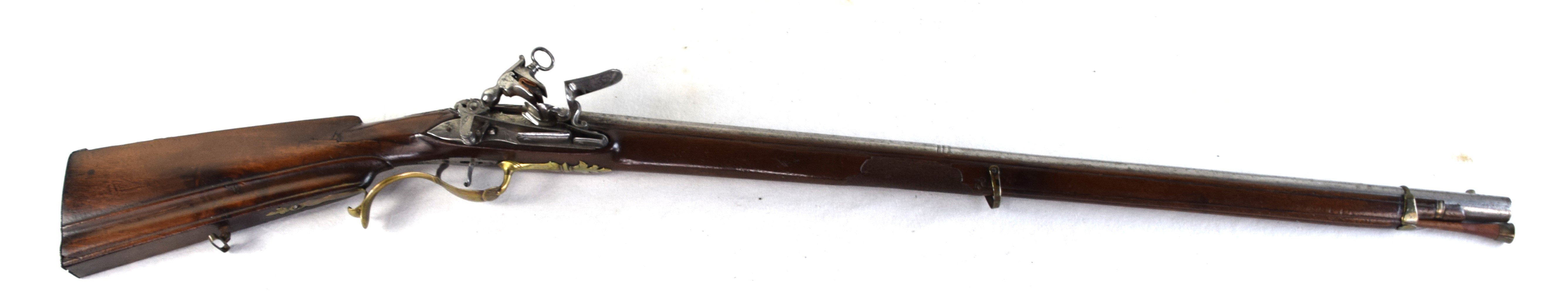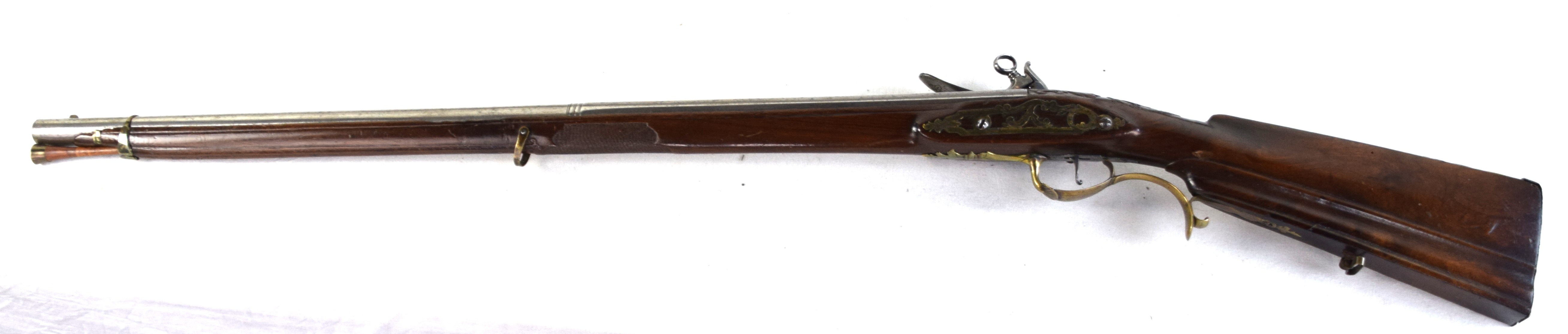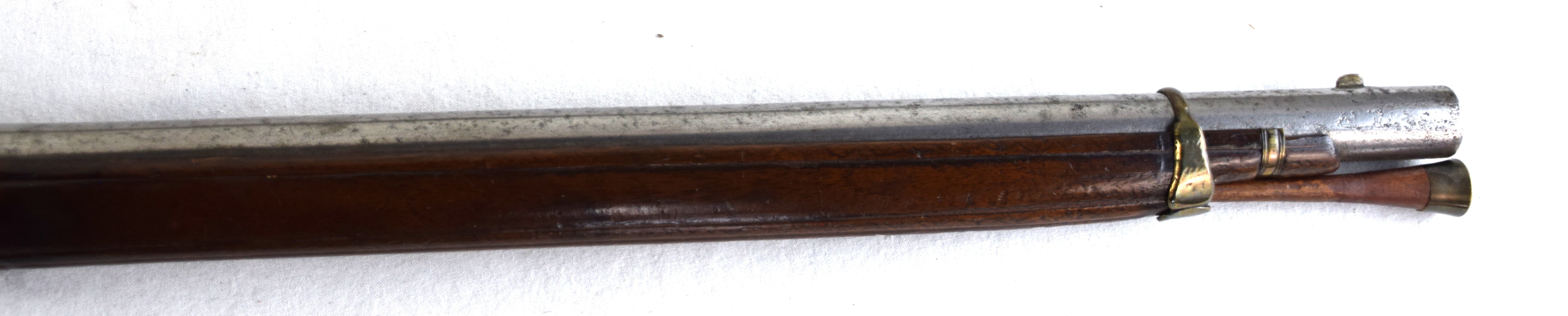The Spanish light musket/colonial escopeta with Miquelet Lock was a .69 caliber musket used in the mid-seventeenth century by Spanish cavalry on the colonial frontier in both North and South America. This is a Miquelet lock marked “ANTO ROMAN”, finished bright metal with relief carvings in stock around barrel tang. Several of these muskets were still used during the Mexican War of 1848 on both sides, especially with the Texas Militia. Dimensions: 30″ Barrel, 44″ Overall