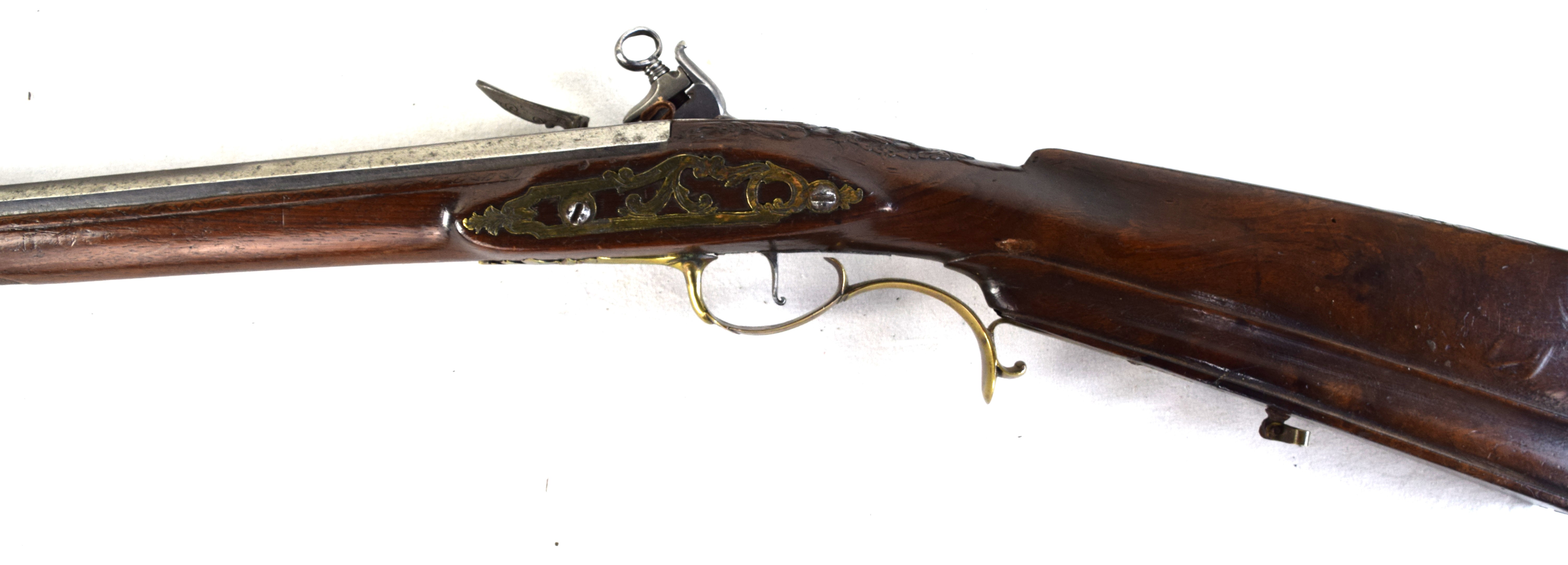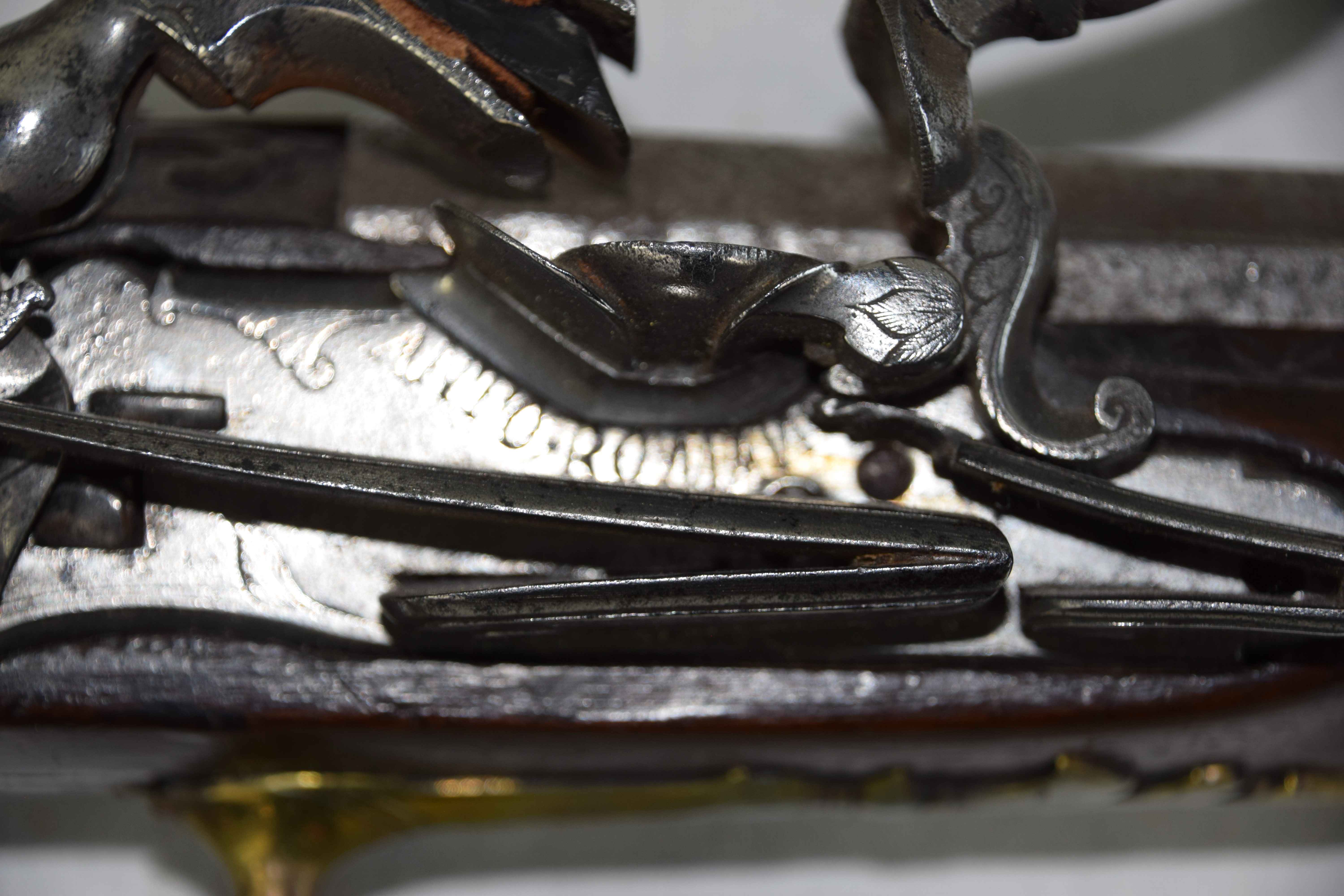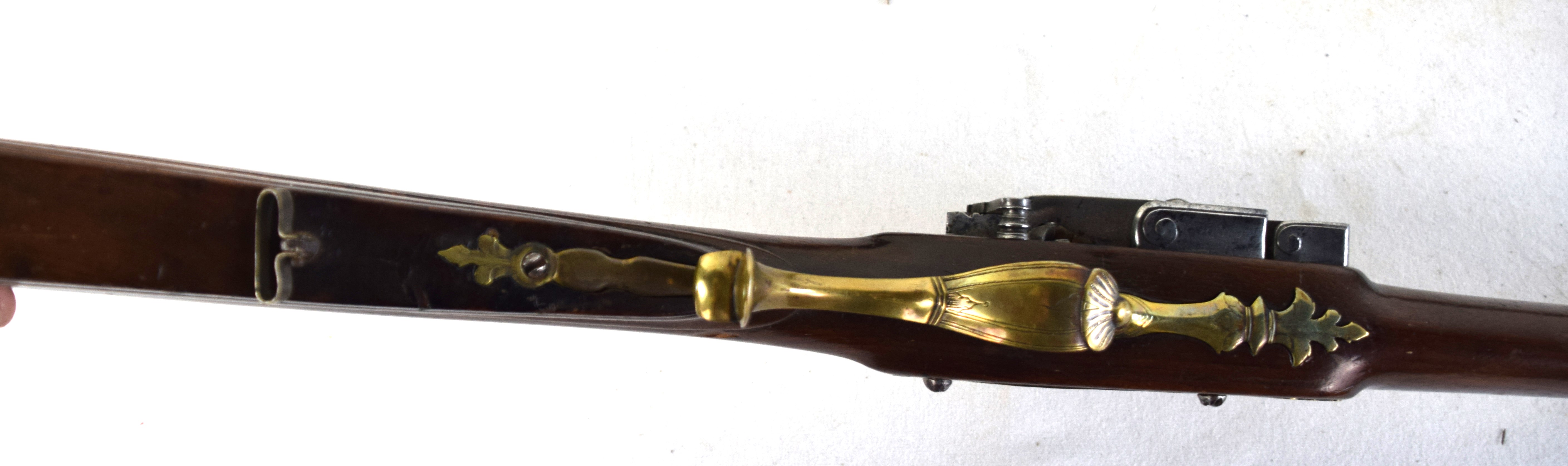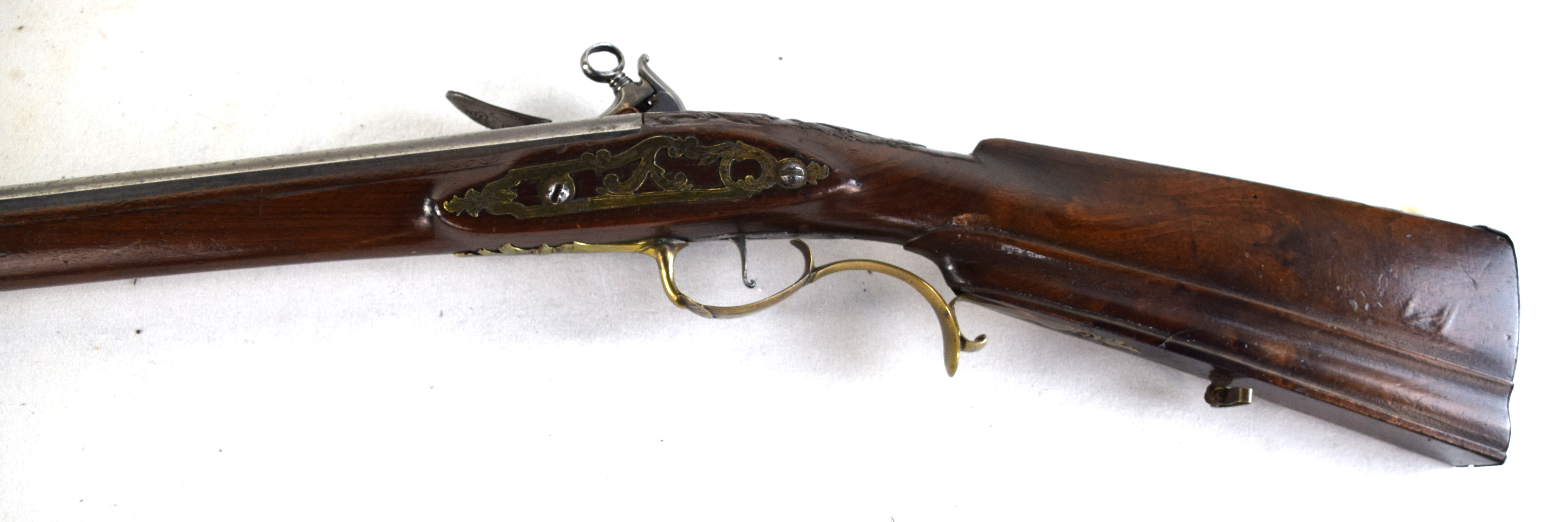 The Spanish light musket/colonial escopeta with Miquelet Lock was a .69 caliber musket used in the mid-seventeenth century by Spanish cavalry on the colonial frontier in both North and South America. This is a Miquelet lock marked “ANTO ROMAN”, finished bright metal with relief carvings in stock around barrel tang. Several of these muskets were still used during the Mexican War of 1848 on both sides, especially with the Texas Militia. Dimensions: 30″ Barrel, 44″ Overall