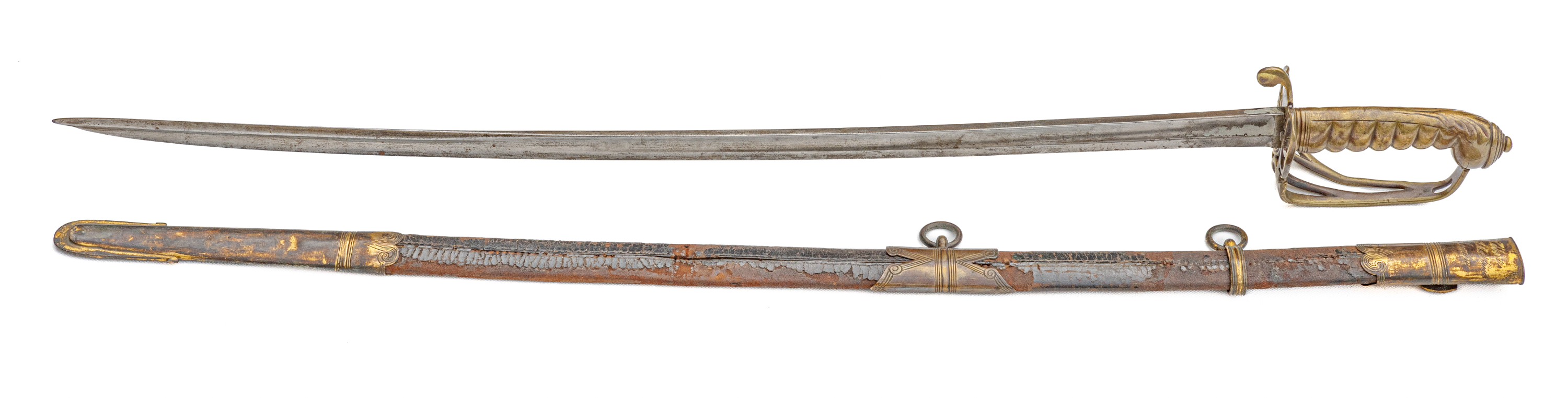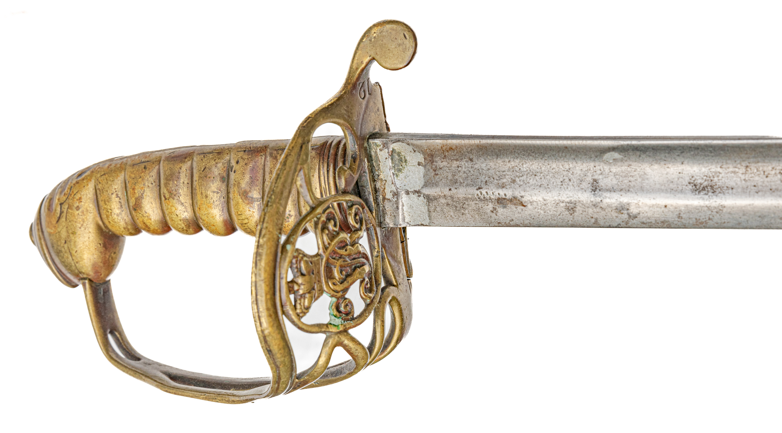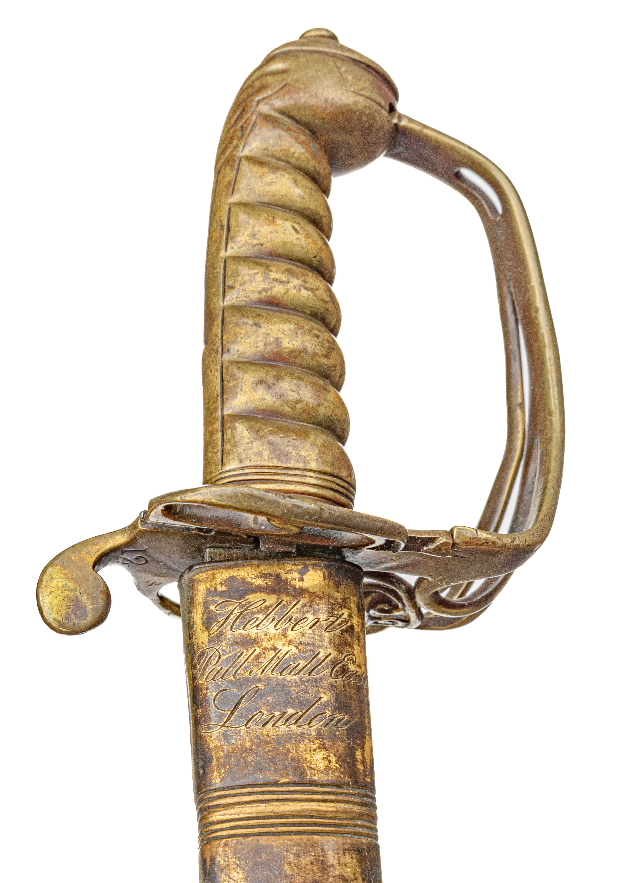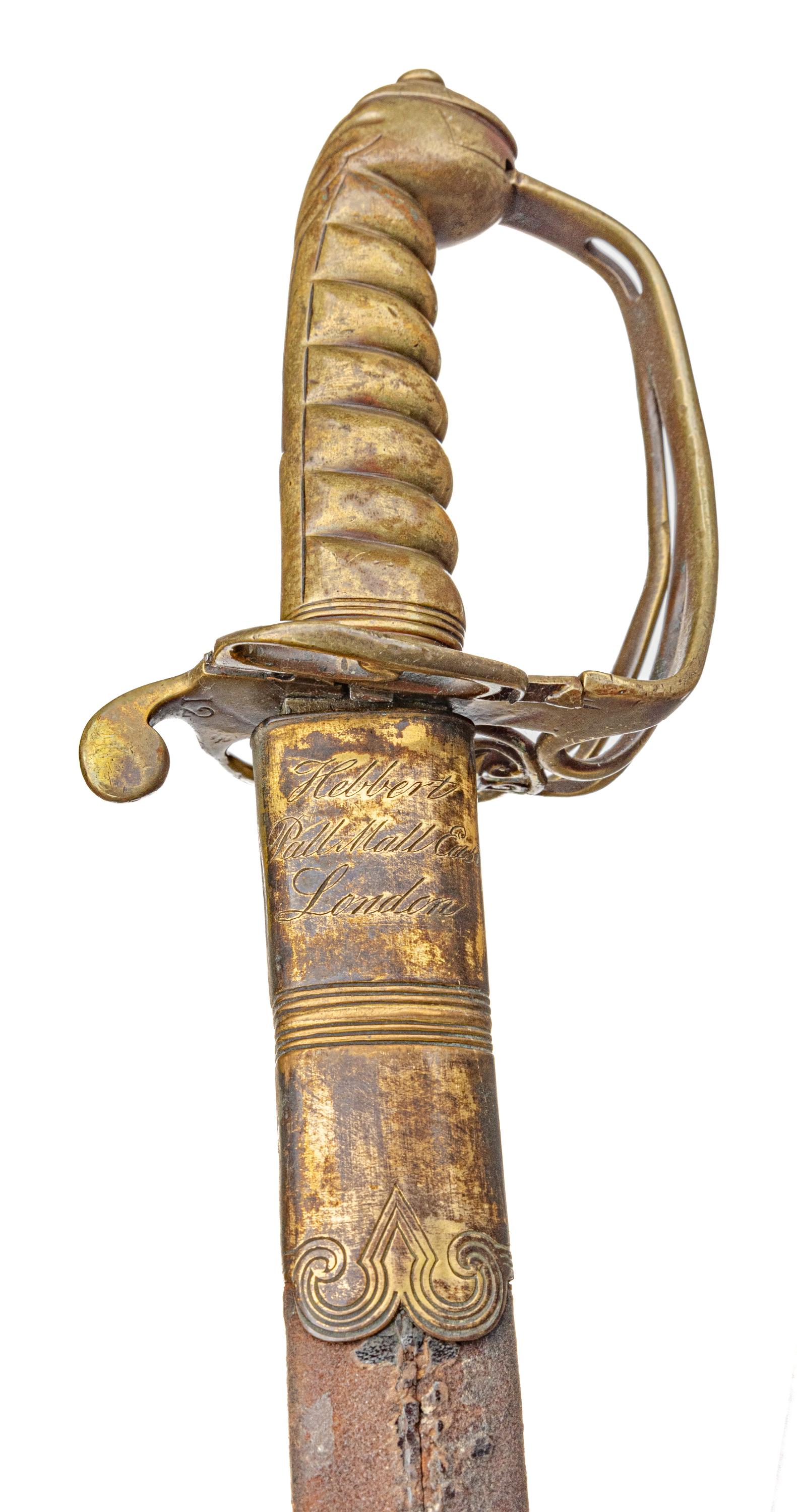 Victorian Infantry Officer’s Sword and Scabbard by Hebbert & Co., Pall Mall East, London, 19th century. Brass hilt with traces of gilding with openwork counter-guard, lined in leather, ray skin covered grip with twisted copper wire wrapping; slightly curved single-edge blade with false edge and single wide fuller, etched foliate scroll and crown over “VR” decoration; black leather scabbard with brass mounts. Dimensions: 28.5″ Blade, 34″ Overall