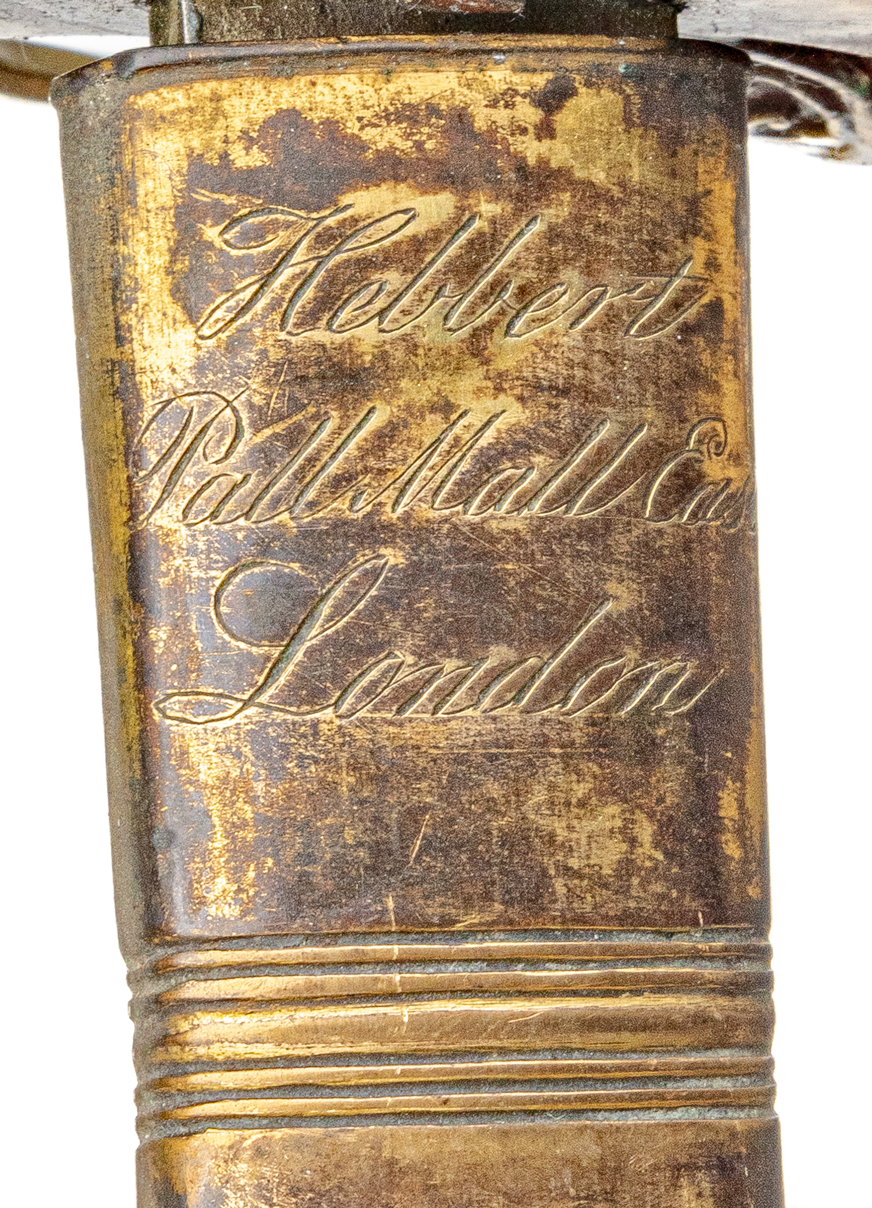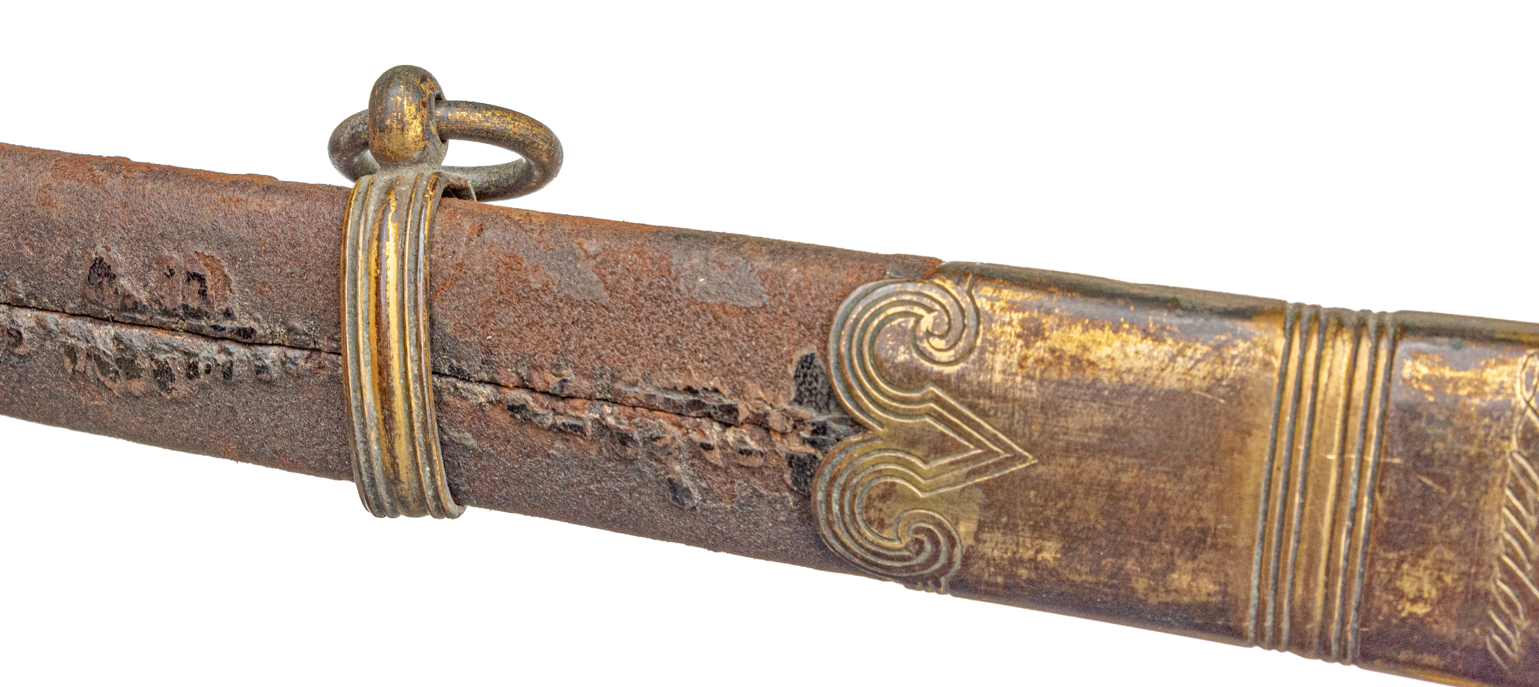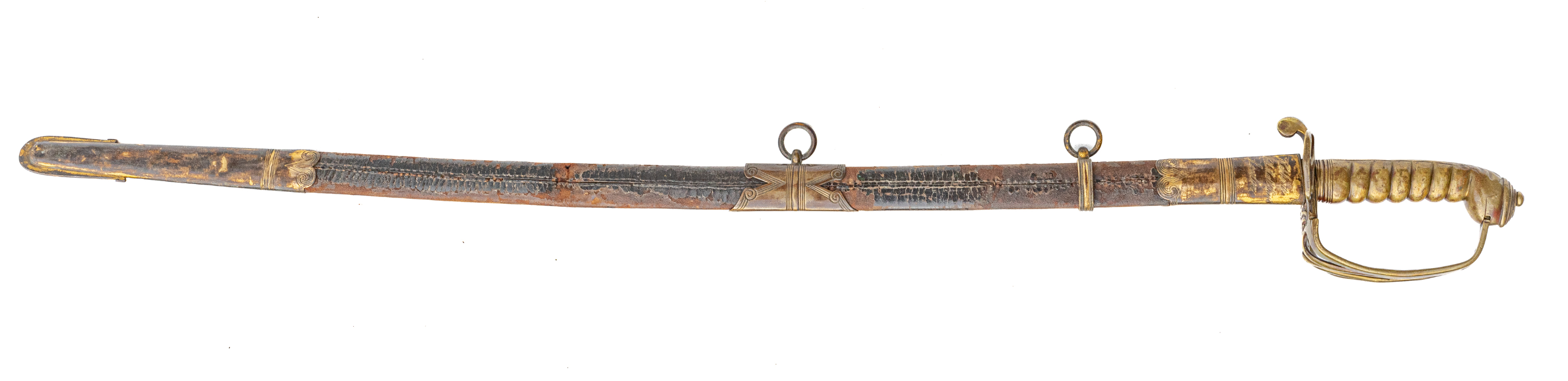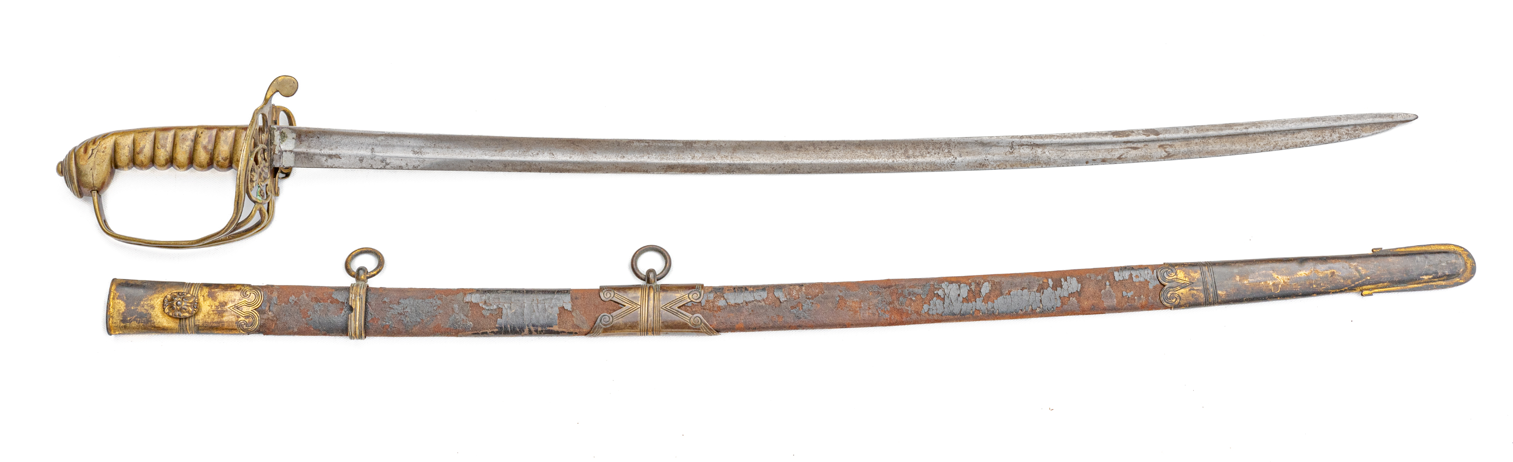 Victorian Infantry Officer’s Sword and Scabbard by Hebbert & Co., Pall Mall East, London, 19th century. Brass hilt with traces of gilding with openwork counter-guard, lined in leather, ray skin covered grip with twisted copper wire wrapping; slightly curved single-edge blade with false edge and single wide fuller, etched foliate scroll and crown over “VR” decoration; black leather scabbard with brass mounts. Dimensions: 28.5″ Blade, 34″ Overall