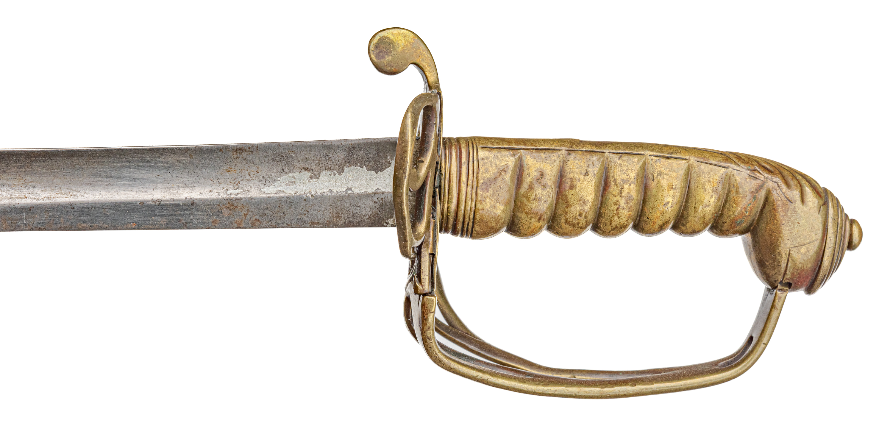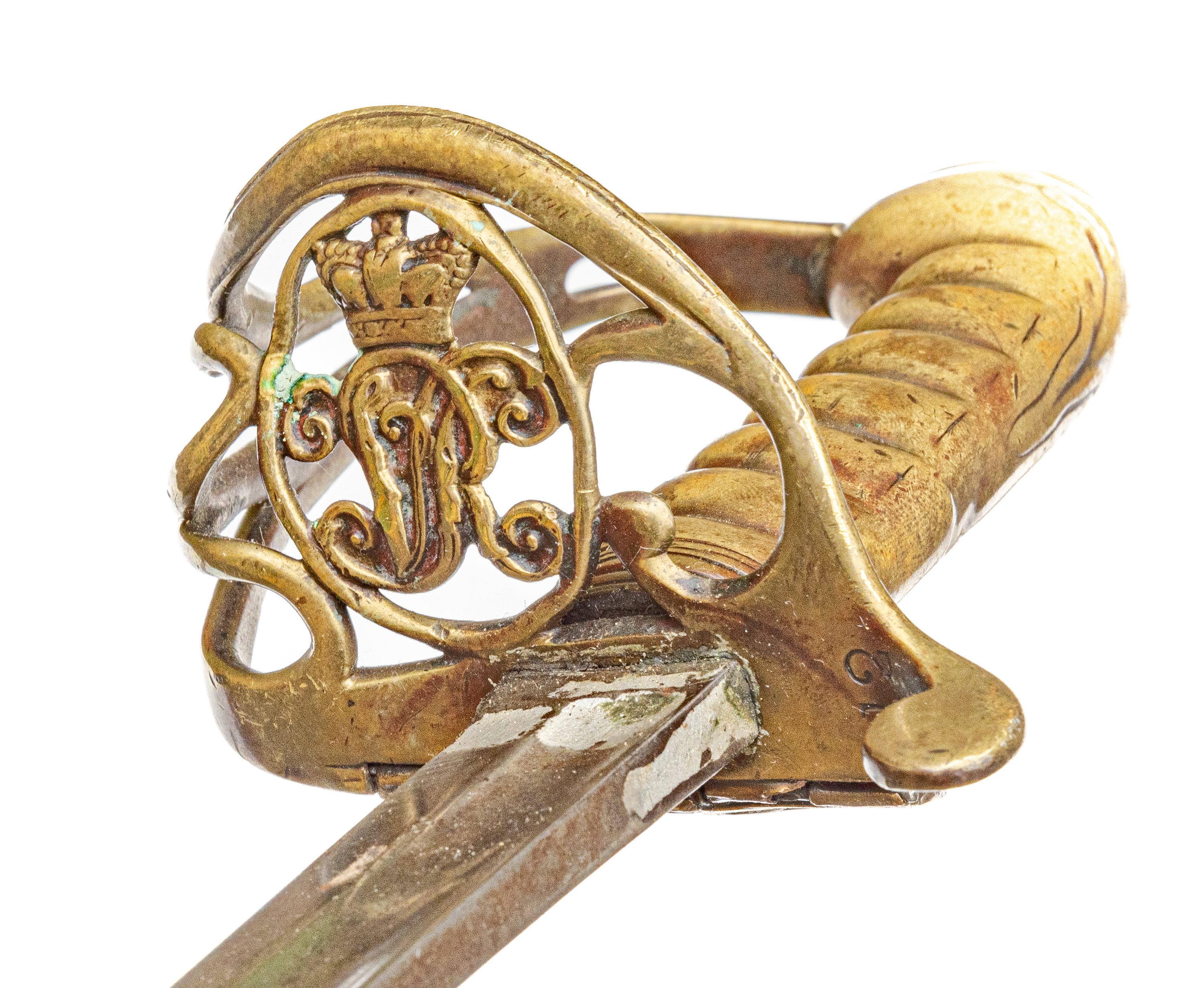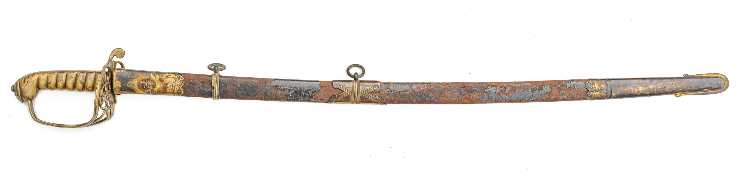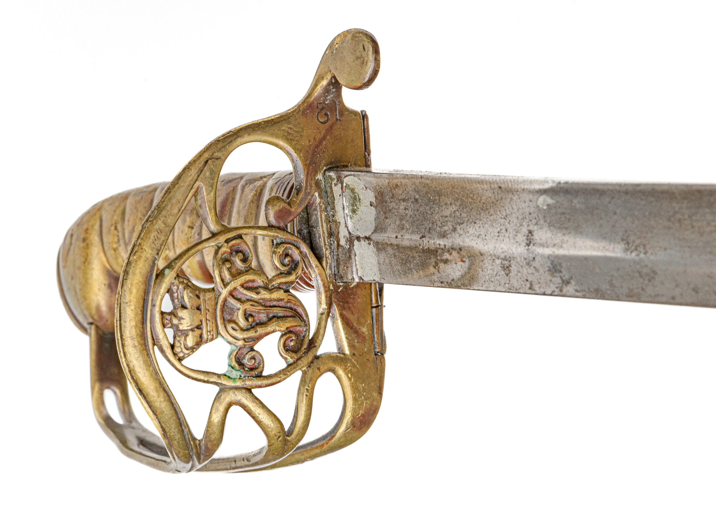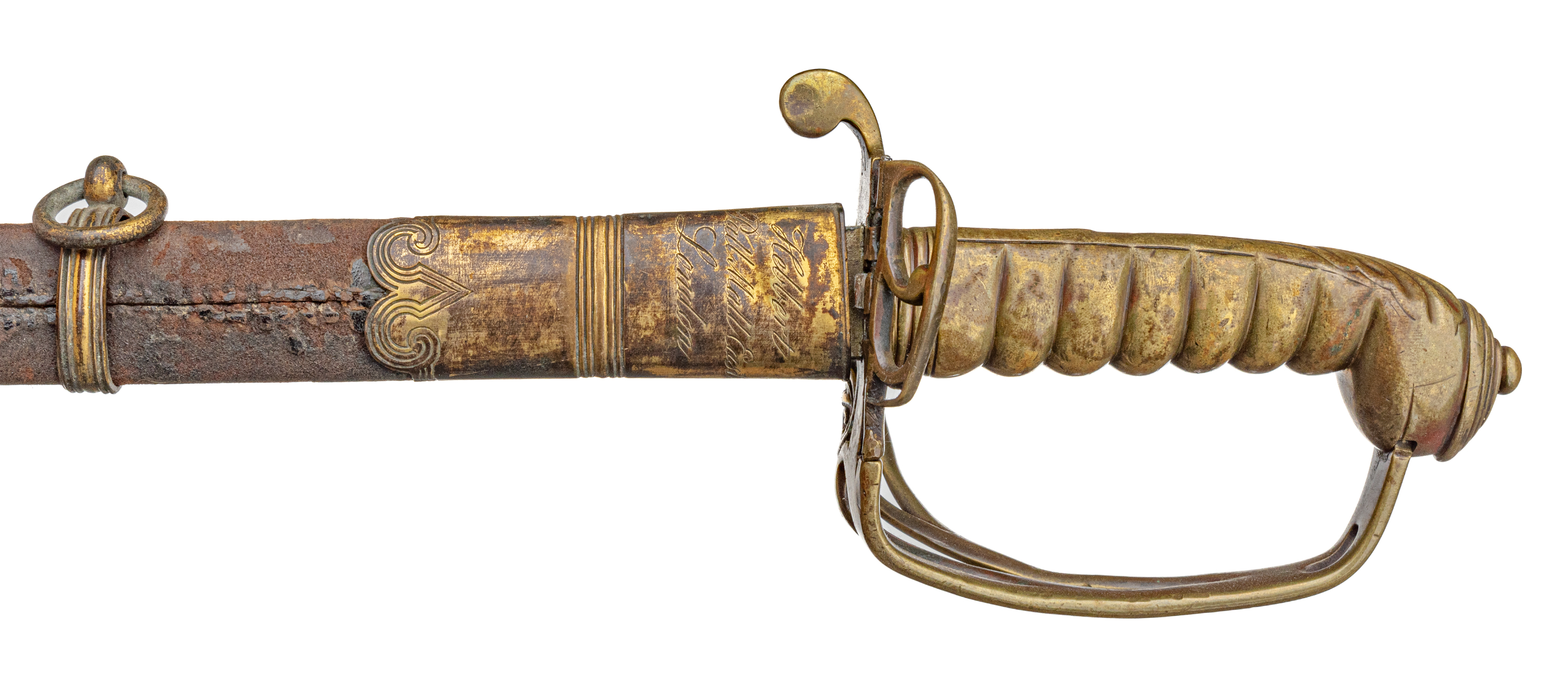 Victorian Infantry Officer’s Sword and Scabbard by Hebbert & Co., Pall Mall East, London, 19th century. Brass hilt with traces of gilding with openwork counter-guard, lined in leather, ray skin covered grip with twisted copper wire wrapping; slightly curved single-edge blade with false edge and single wide fuller, etched foliate scroll and crown over “VR” decoration; black leather scabbard with brass mounts. Dimensions: 28.5″ Blade, 34″ Overall