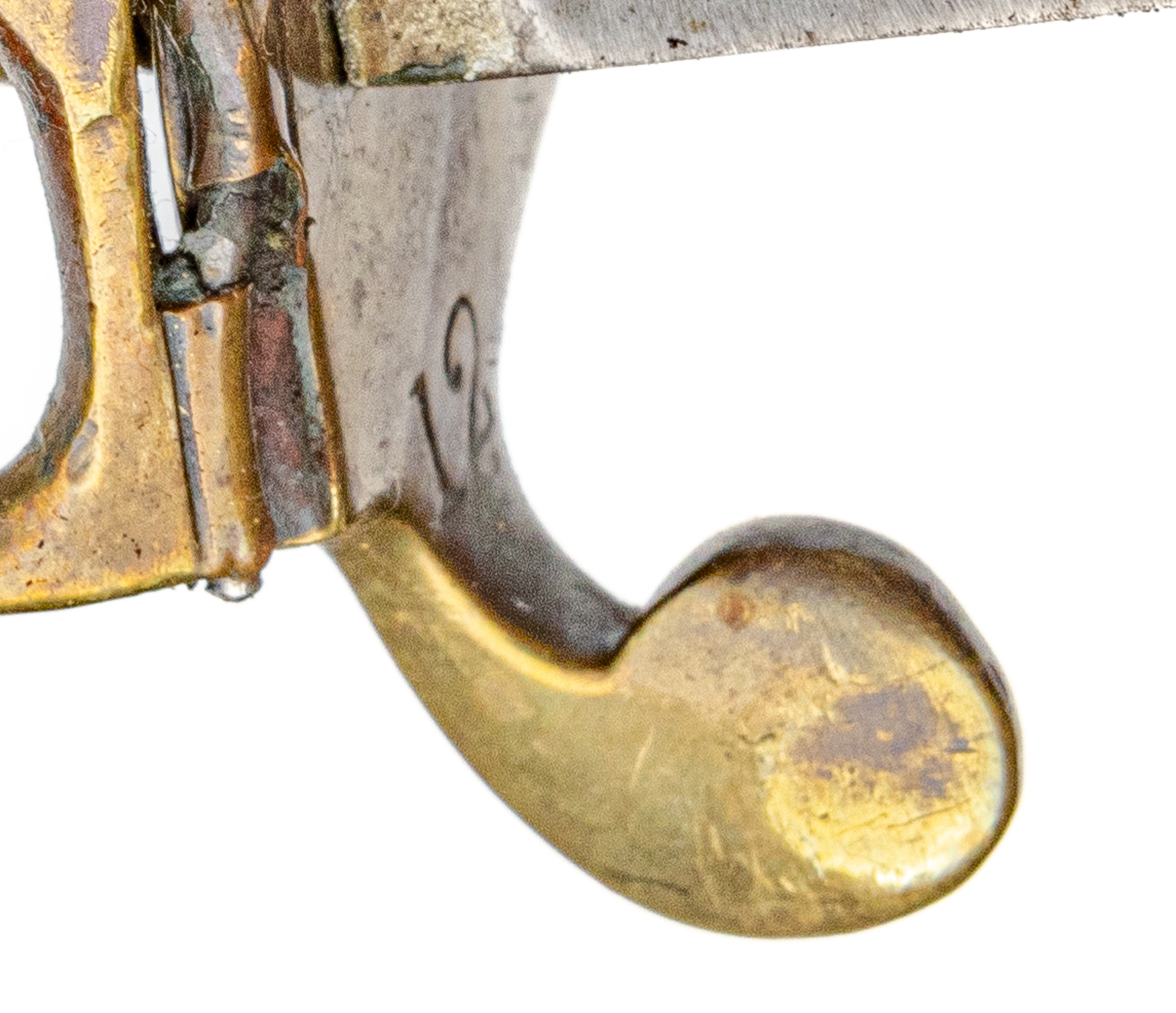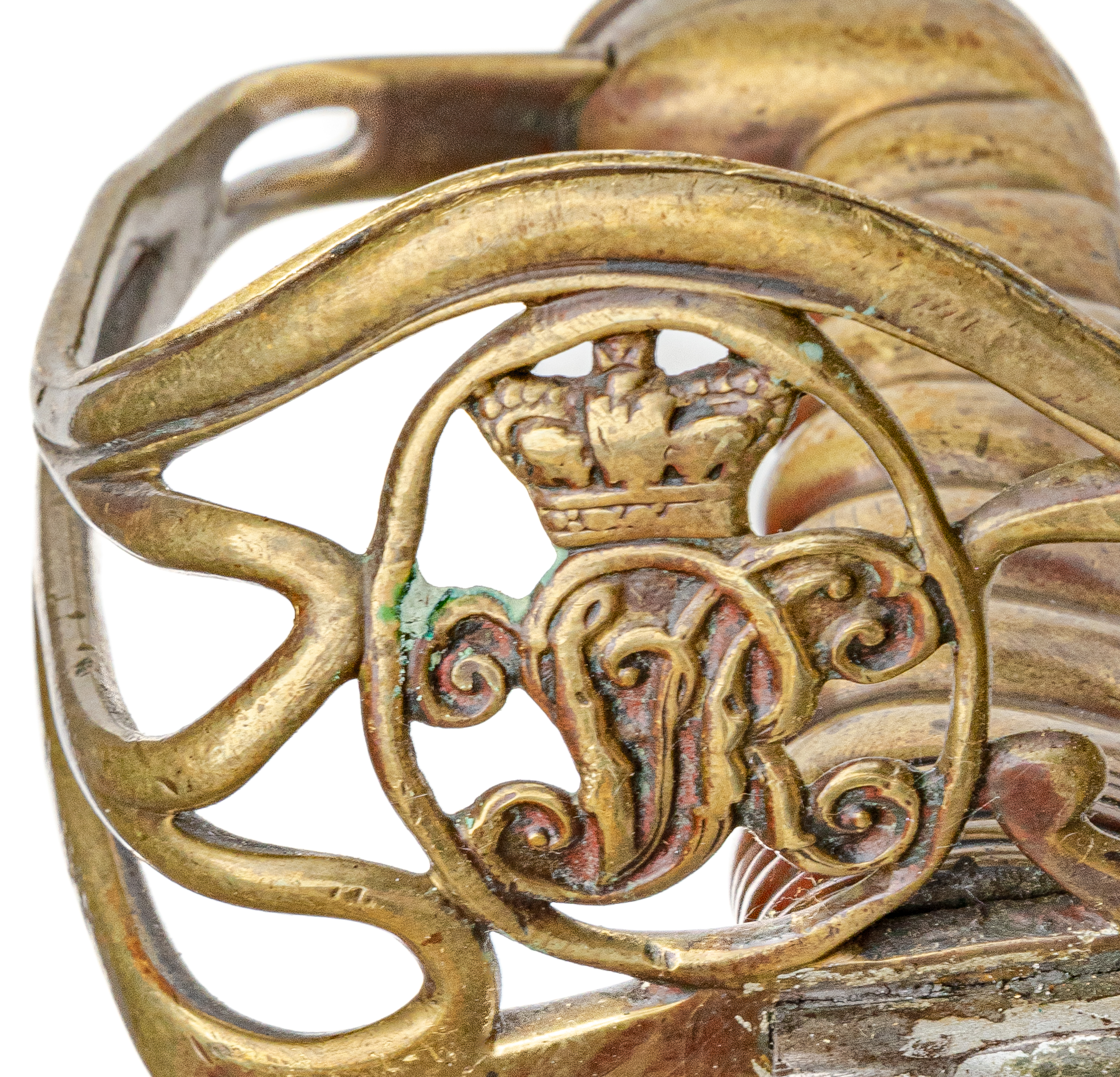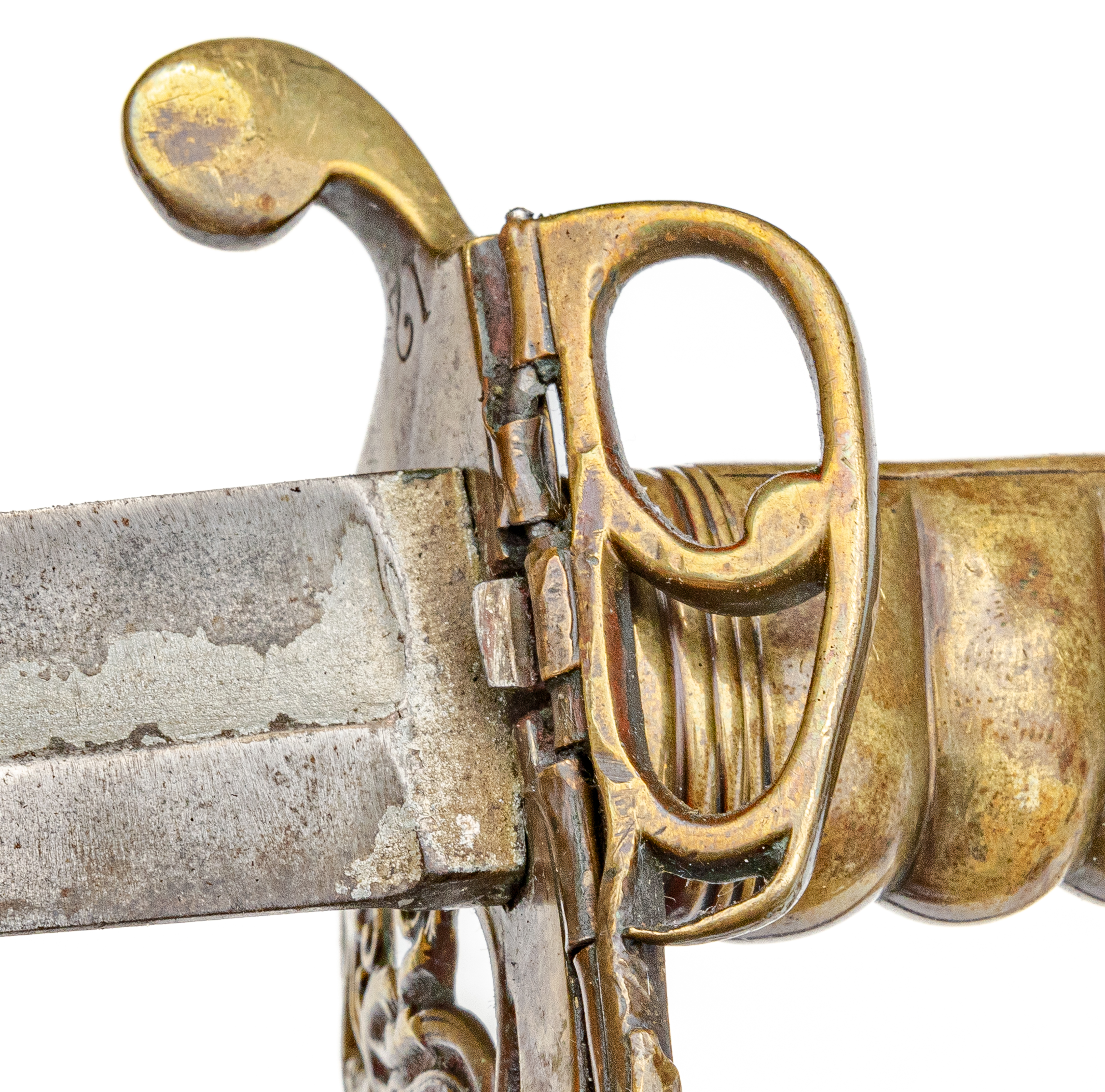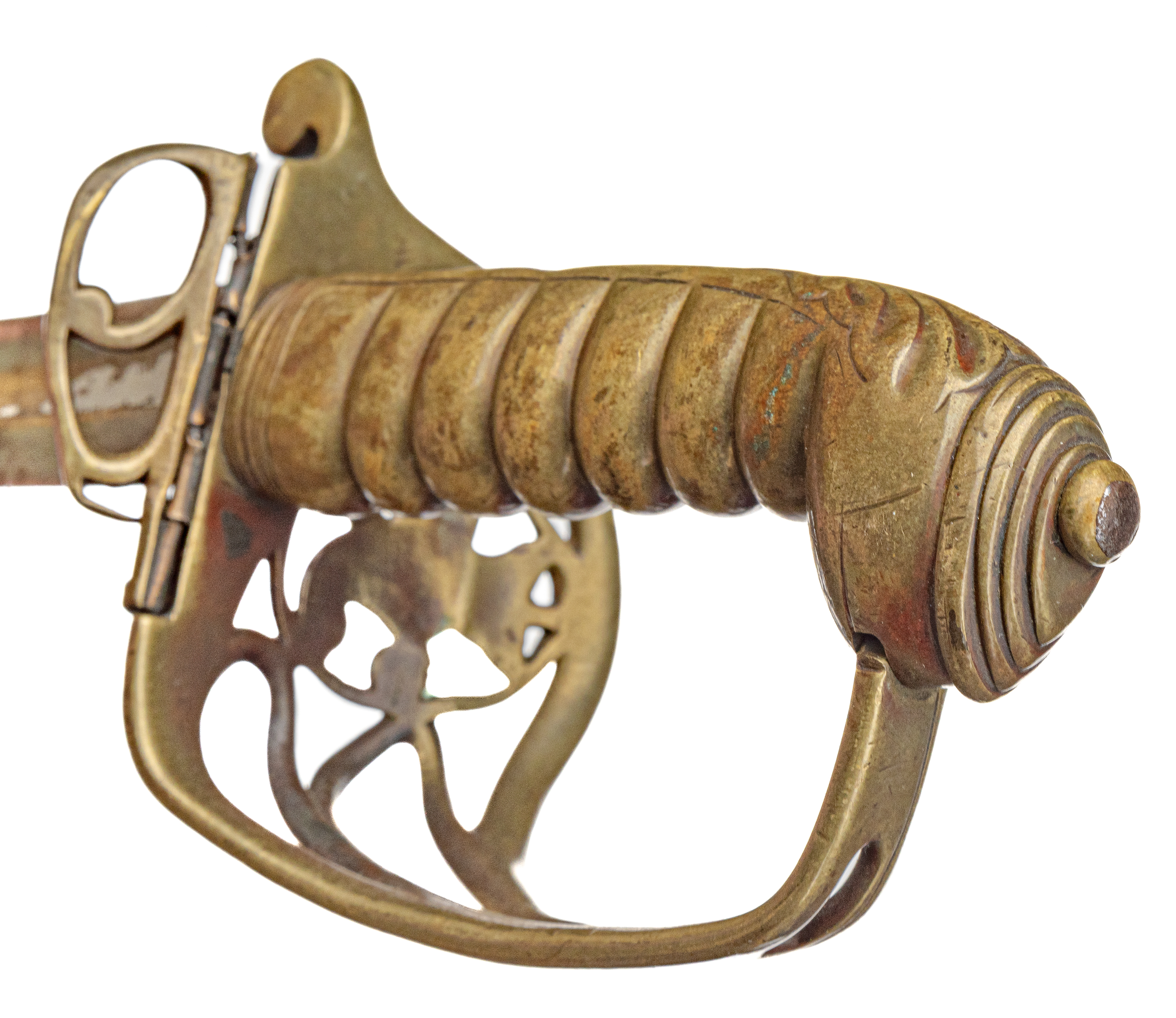 Victorian Infantry Officer’s Sword and Scabbard by Hebbert & Co., Pall Mall East, London, 19th century. Brass hilt with traces of gilding with openwork counter-guard, lined in leather, ray skin covered grip with twisted copper wire wrapping; slightly curved single-edge blade with false edge and single wide fuller, etched foliate scroll and crown over “VR” decoration; black leather scabbard with brass mounts. Dimensions: 28.5″ Blade, 34″ Overall
