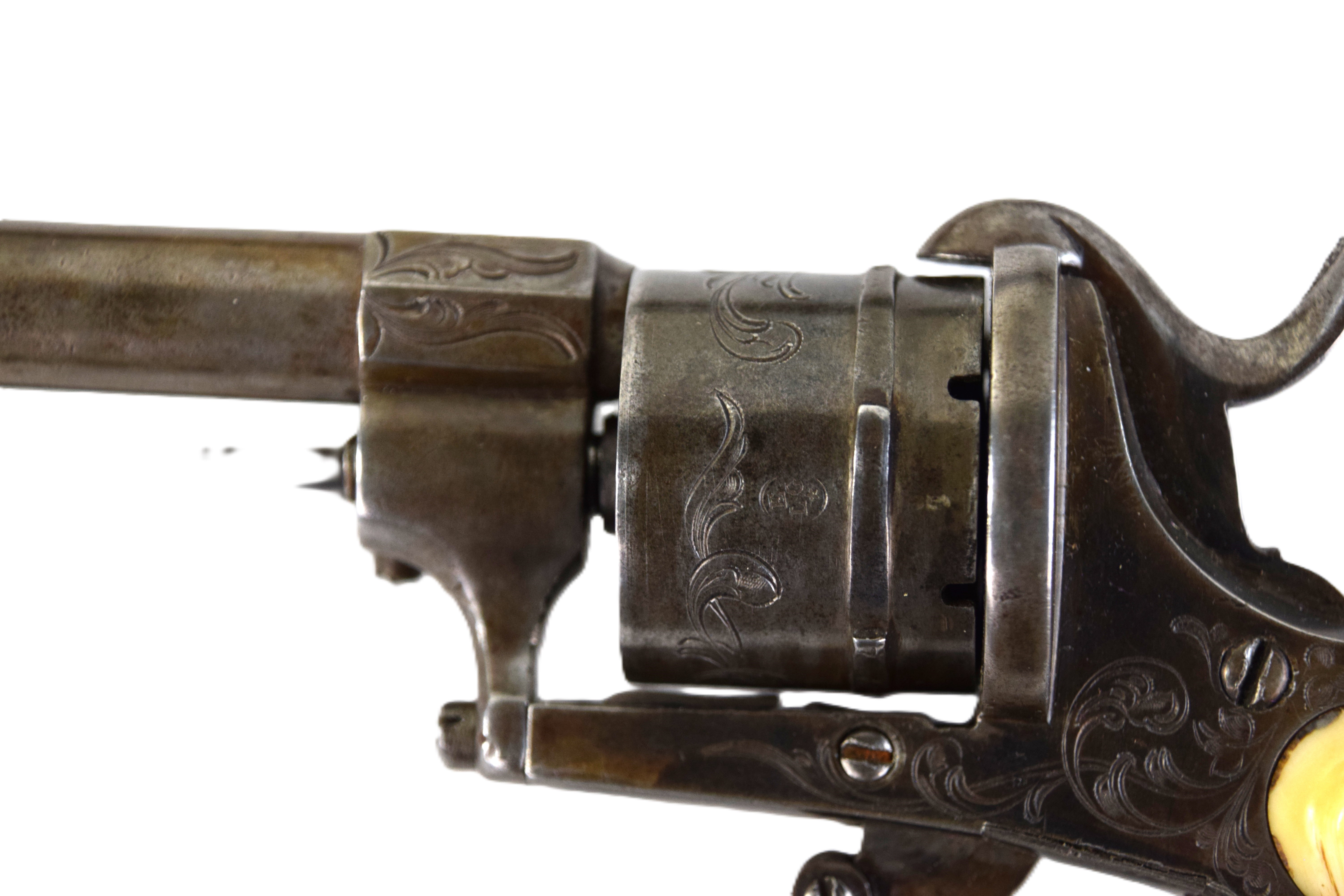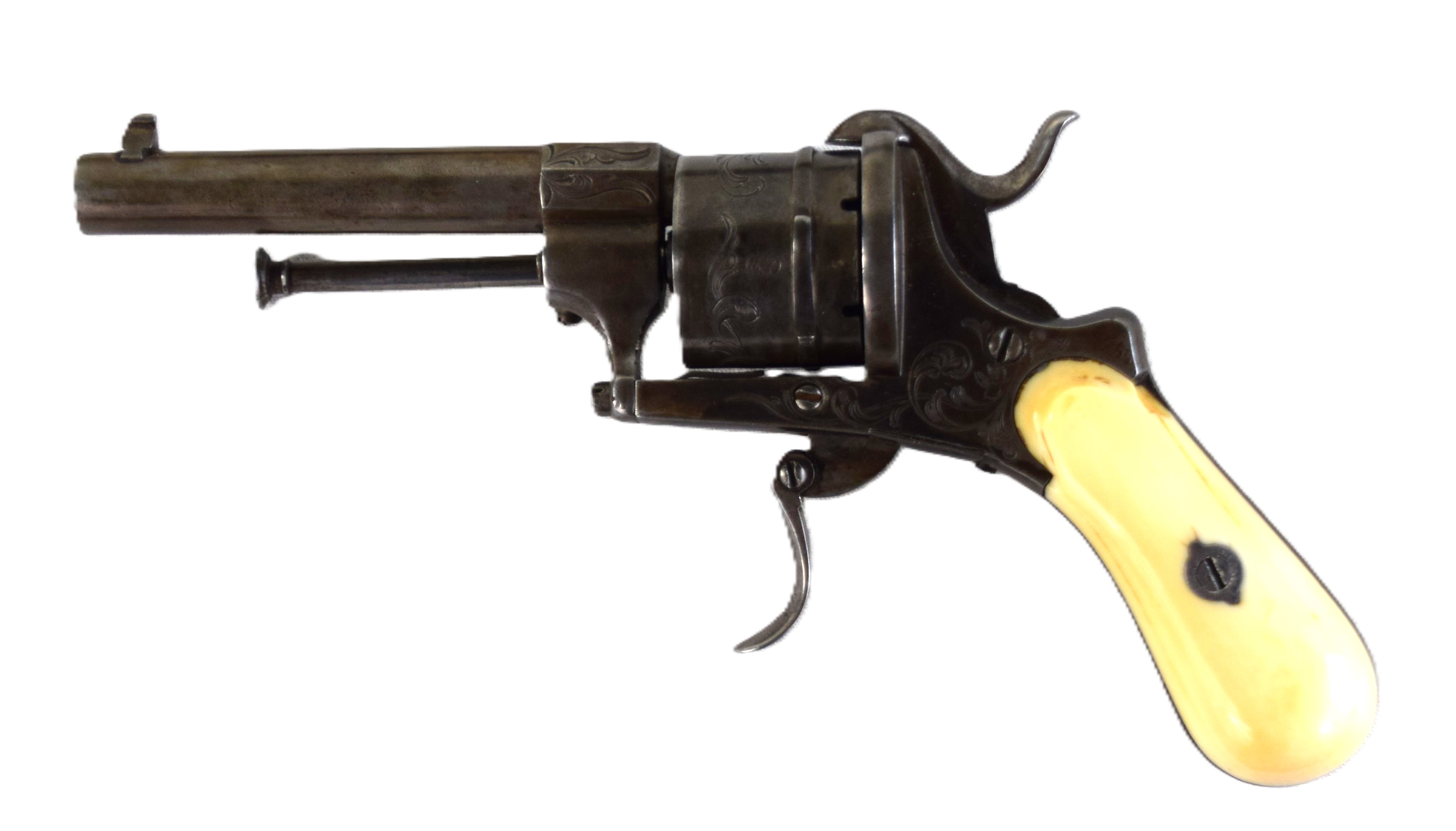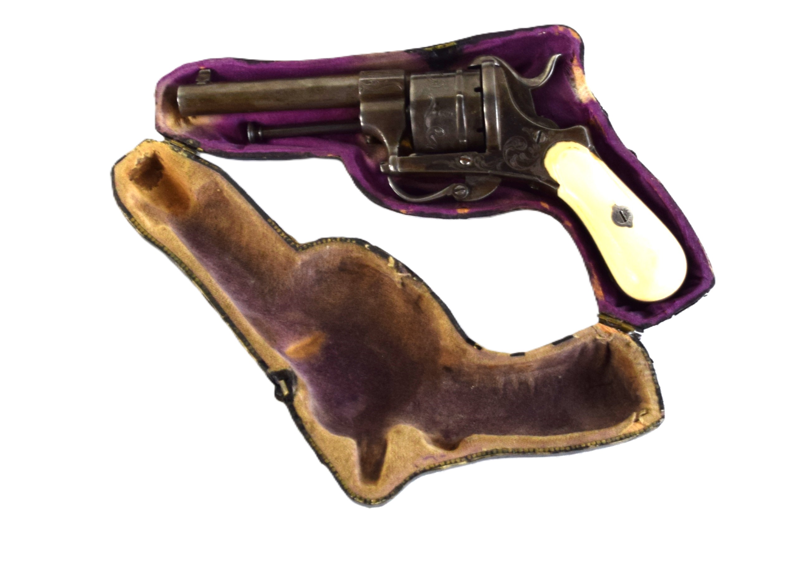 Rare boxed with an original leather case, Belgian pin-fire 6 shot revolver, circa 1860s. There are floral patterns on drum and ivory handle. The drum is marked with the E / L G / * in an Oval proof. Several Belgian models were exported to New Orleans during the Civil War. Dimensions: 3.5″ Barrel, 9″ Overall