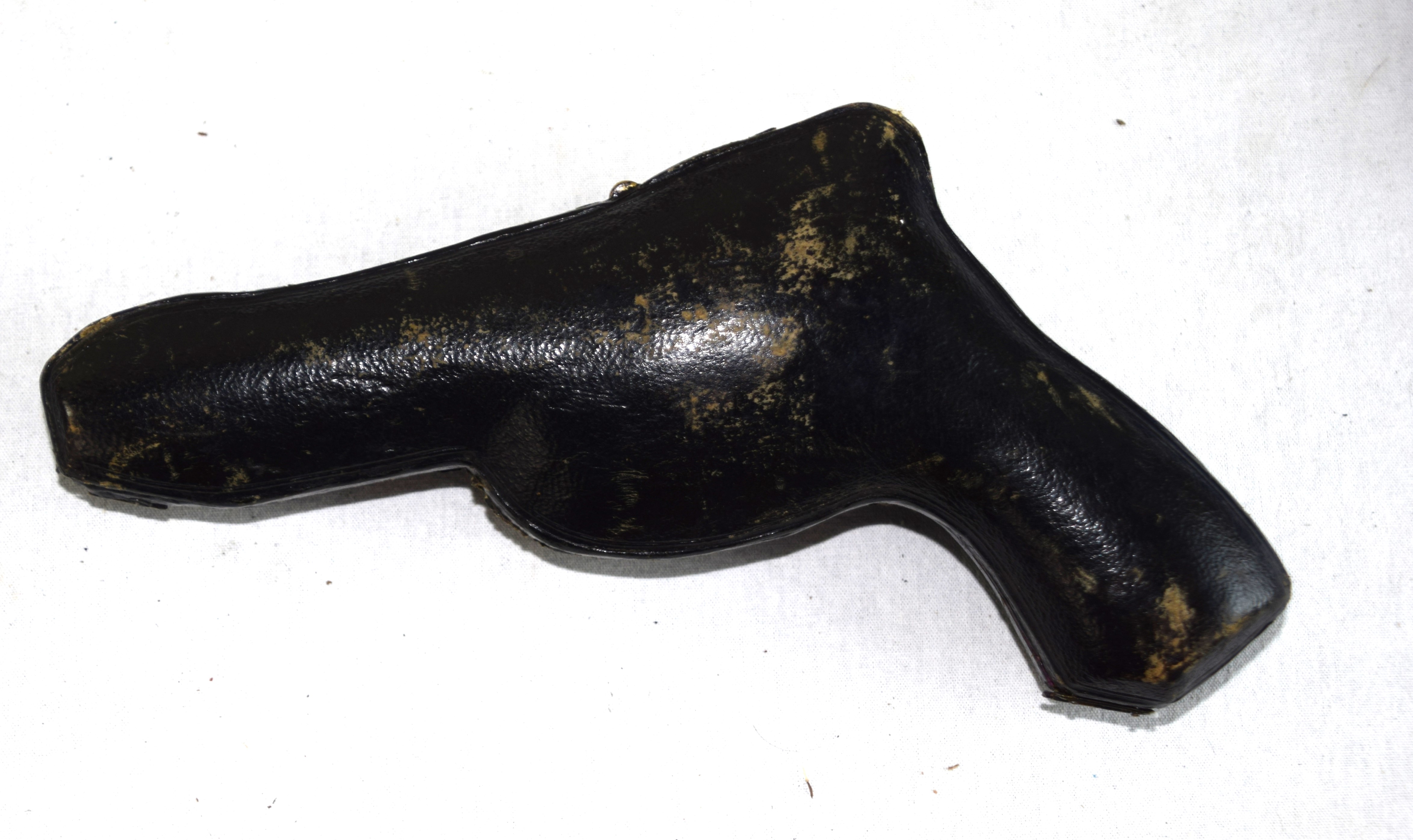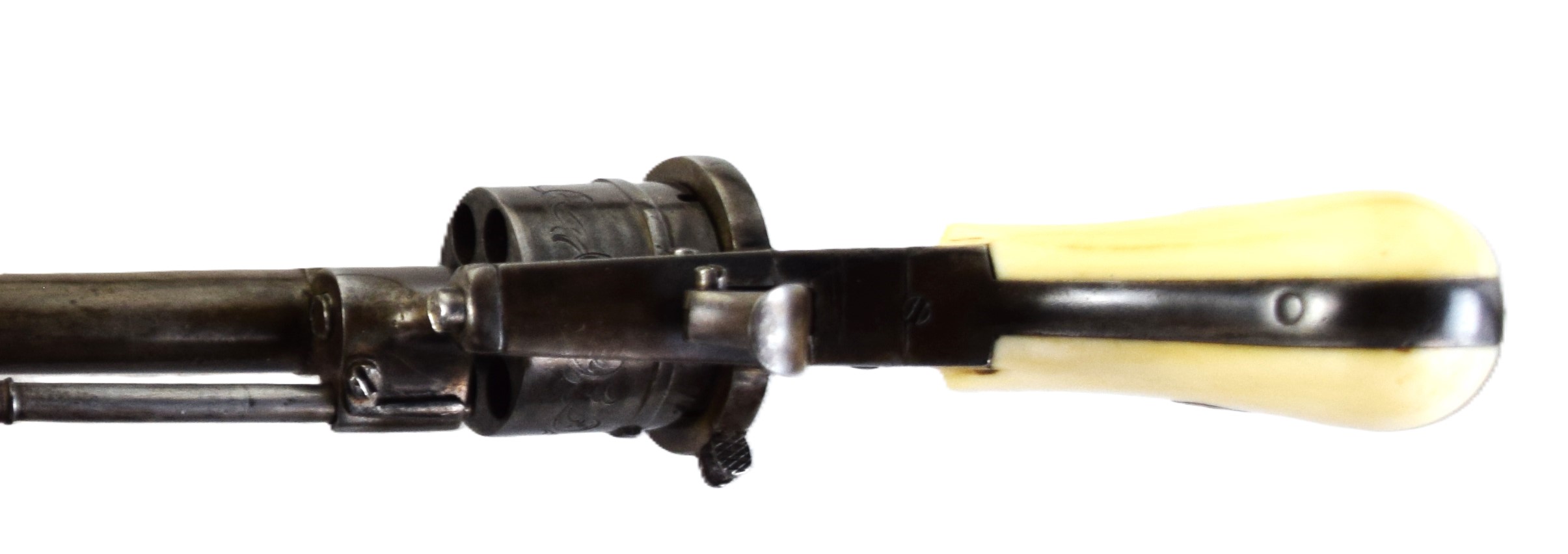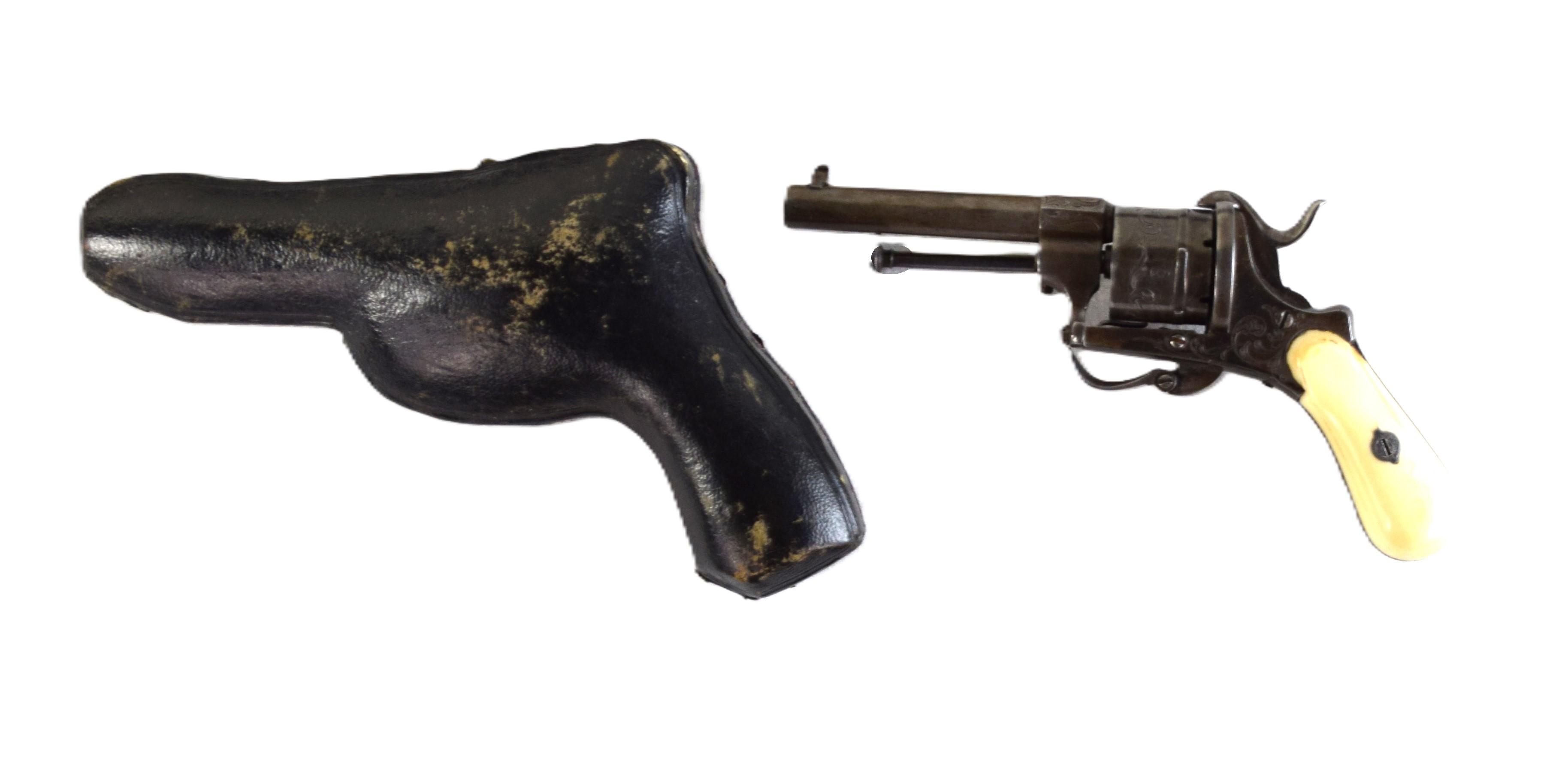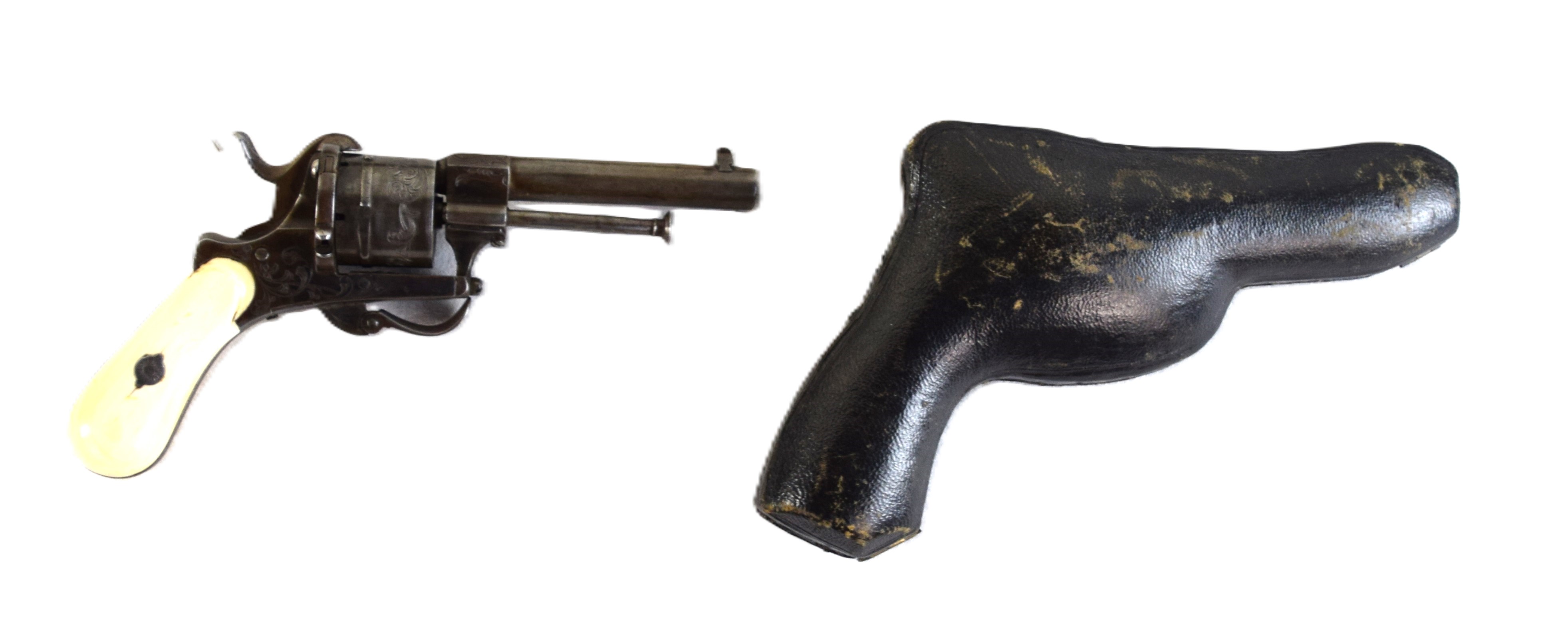 Rare boxed with an original leather case, Belgian pin-fire 6 shot revolver, circa 1860s. There are floral patterns on drum and ivory handle. The drum is marked with the E / L G / * in an Oval proof. Several Belgian models were exported to New Orleans during the Civil War. Dimensions: 3.5″ Barrel, 9″ Overall