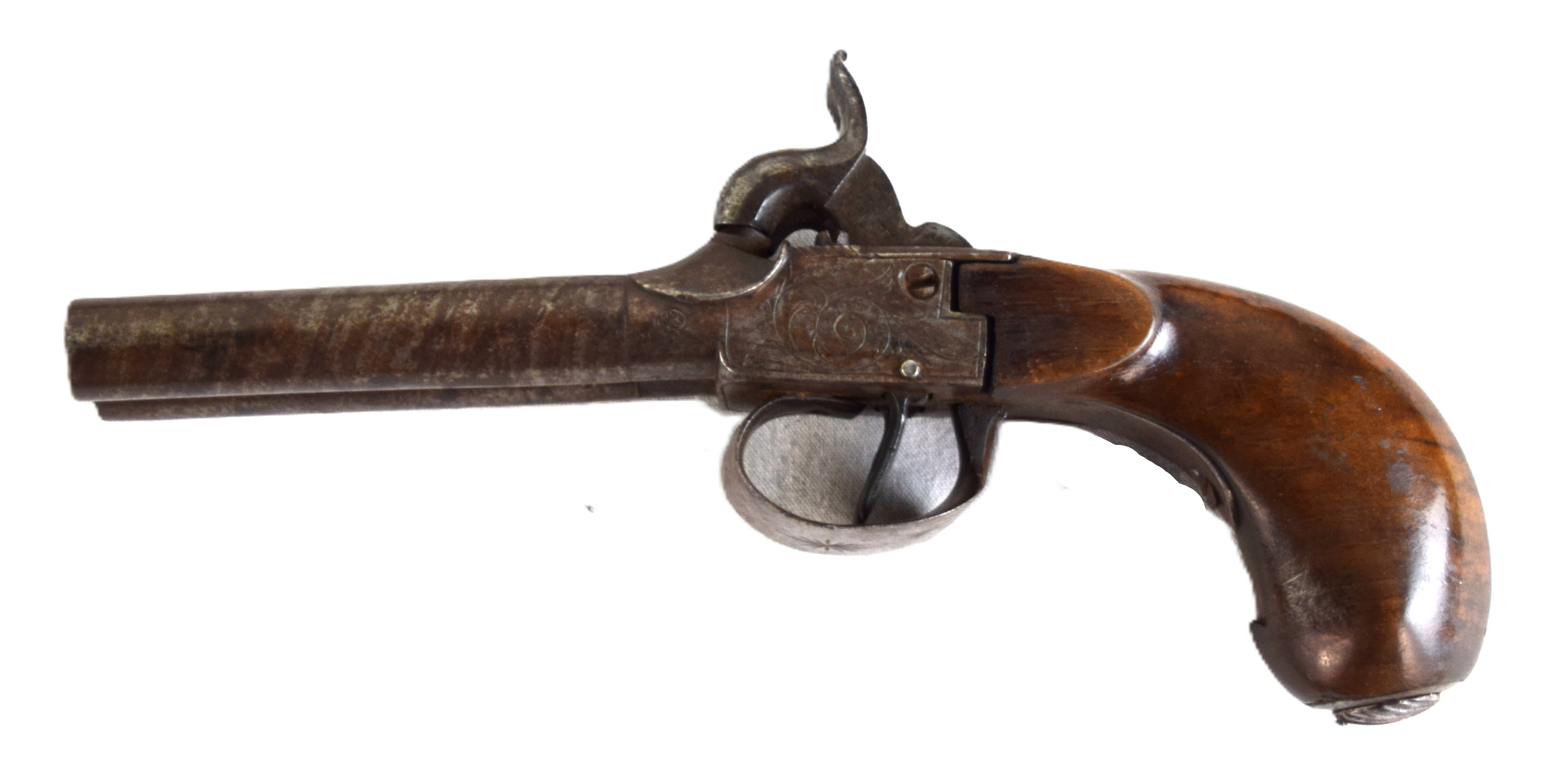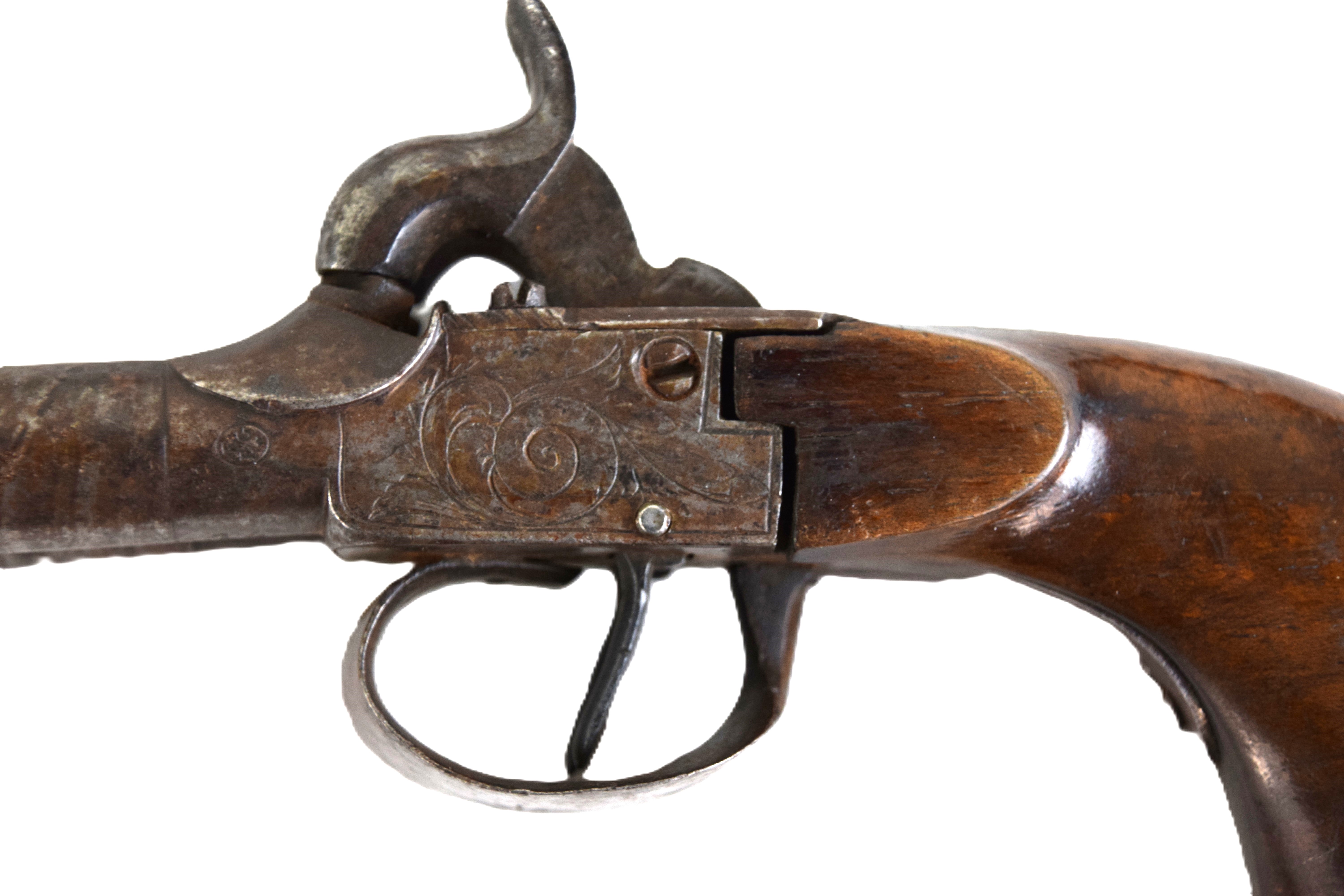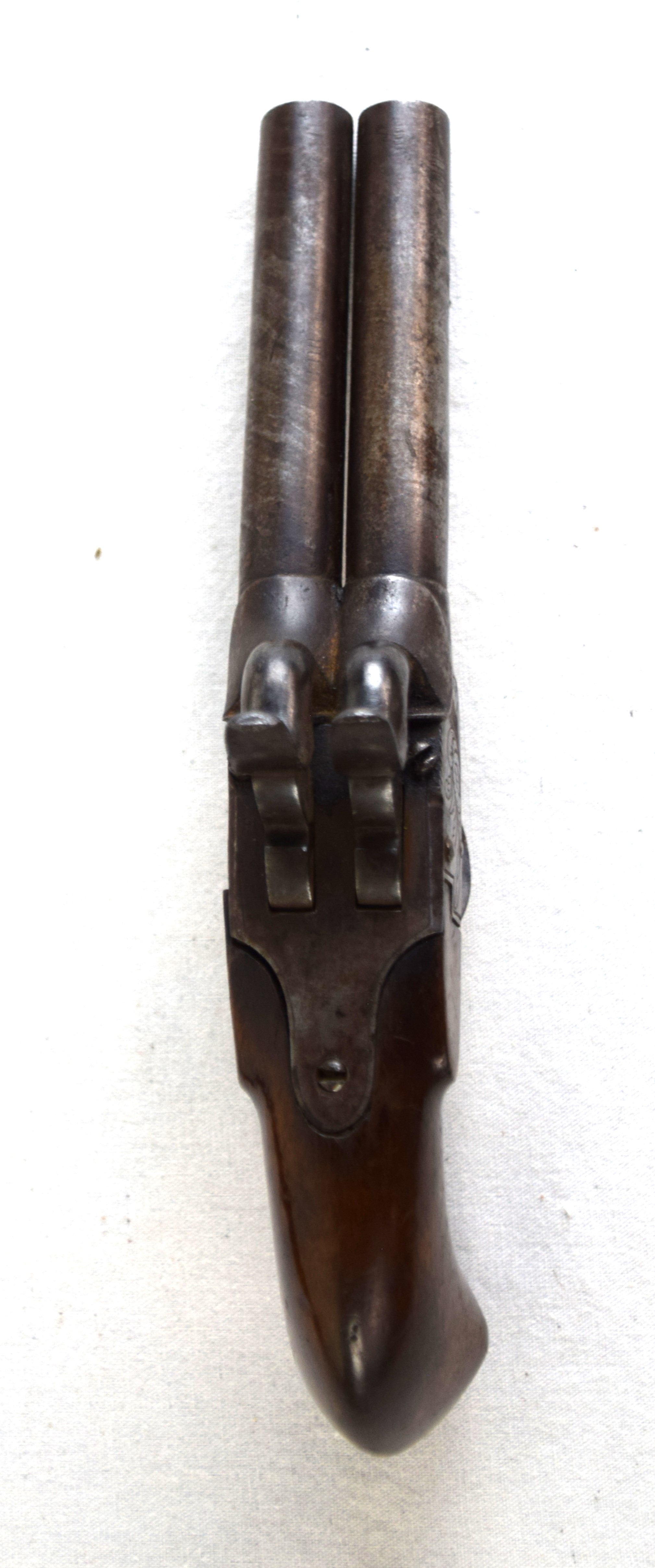 Double barrel and trigger percussion pistol with Damascus barrels. This double barreled pocket percussion pistol was made in Liège, Belgium, almost certainly for the European and American export markets. The left side of the frame is marked with the E / L G / * in an Oval proof. These were quite popular for self-protection, and having two barrels definitely would give the owner increased protection. Dimensions: 3.5″ Barrels, 9″ Overall