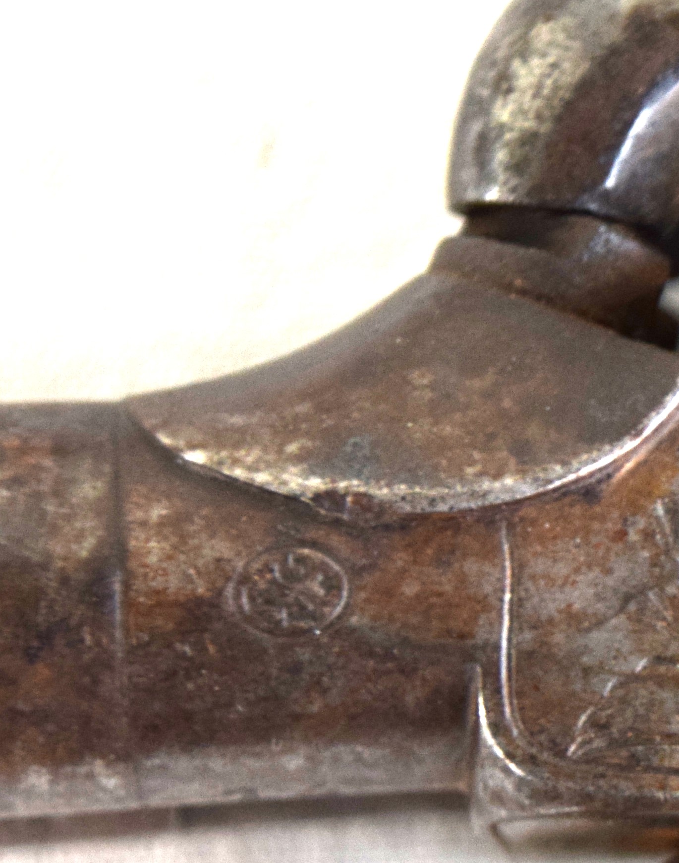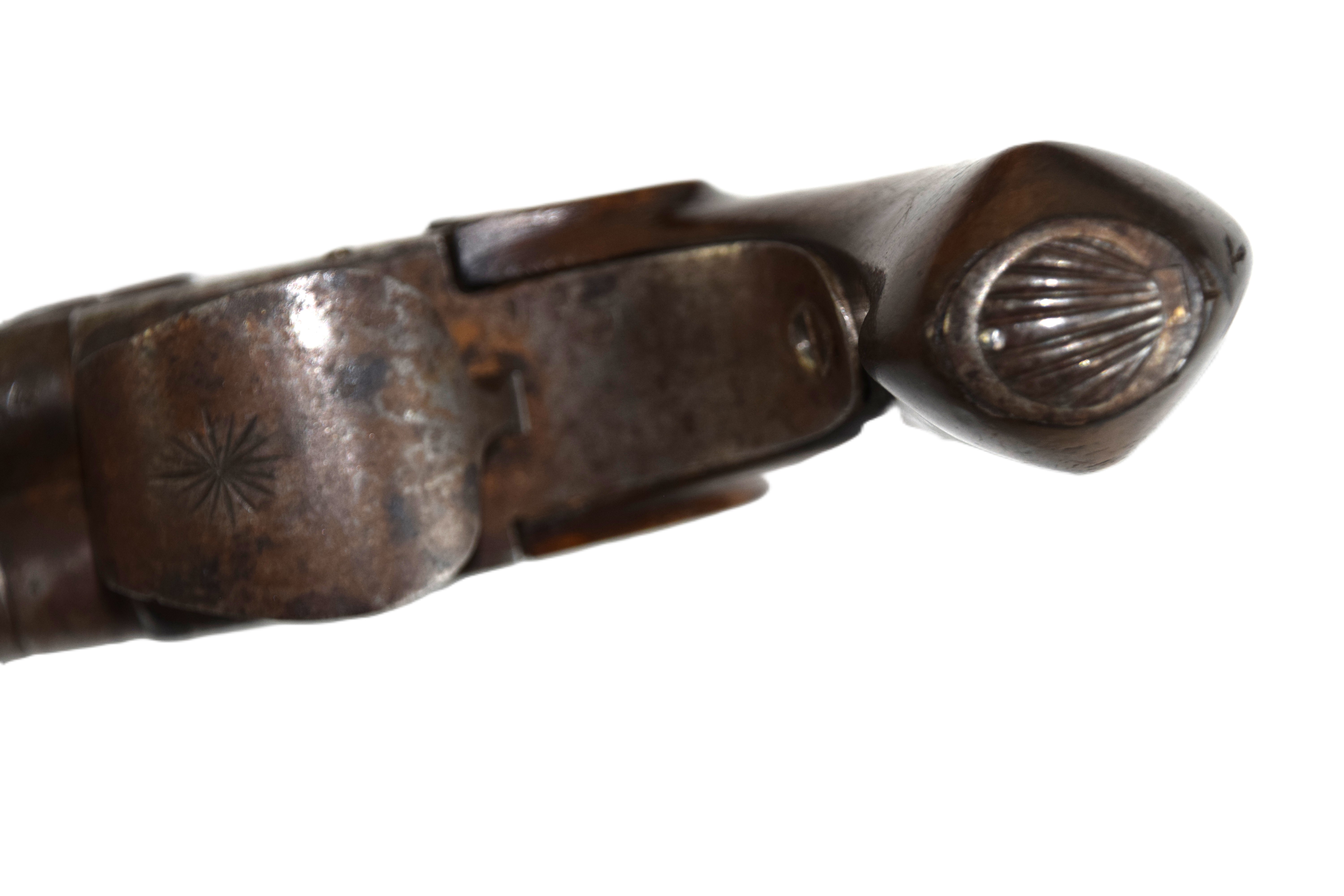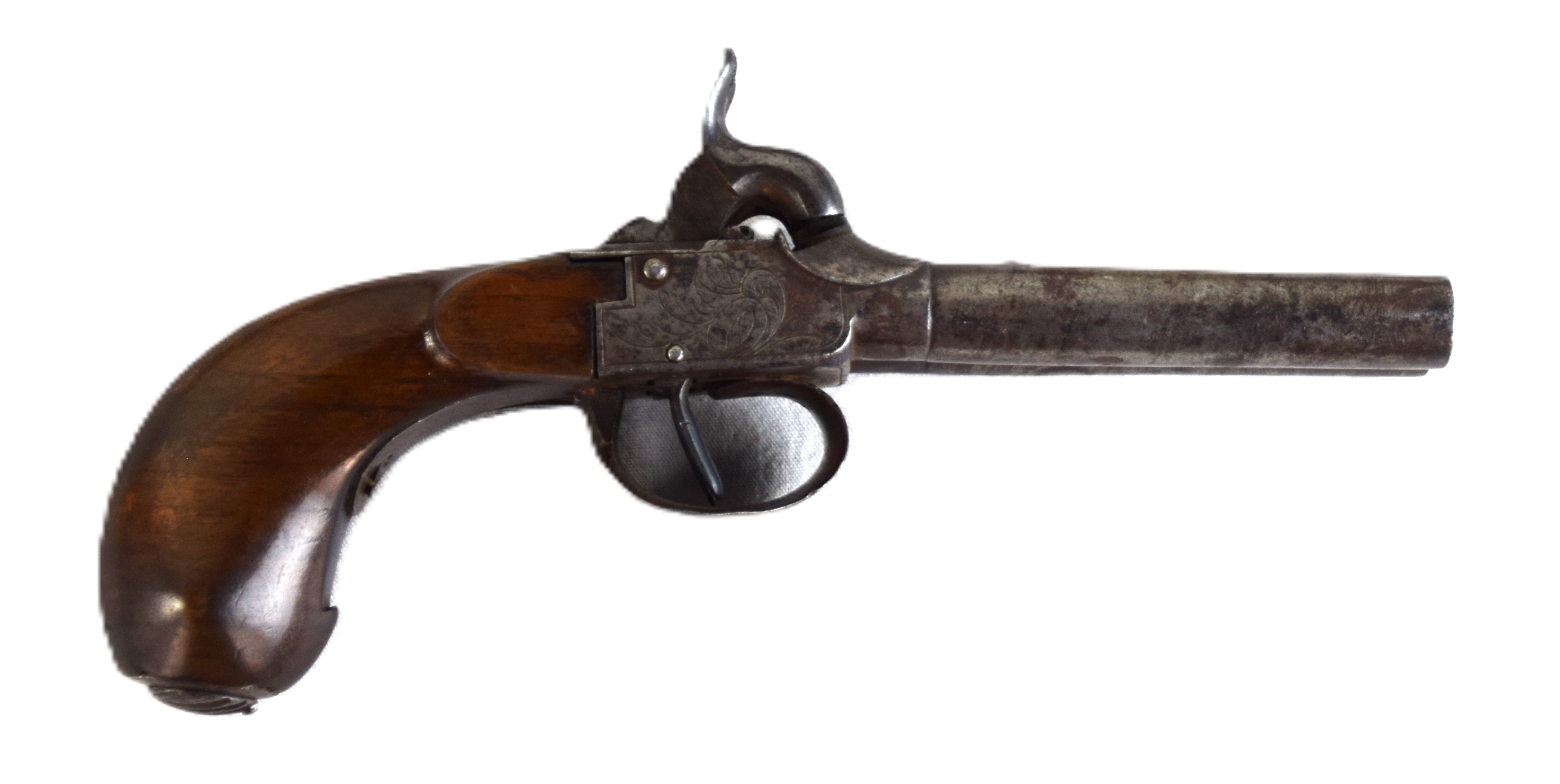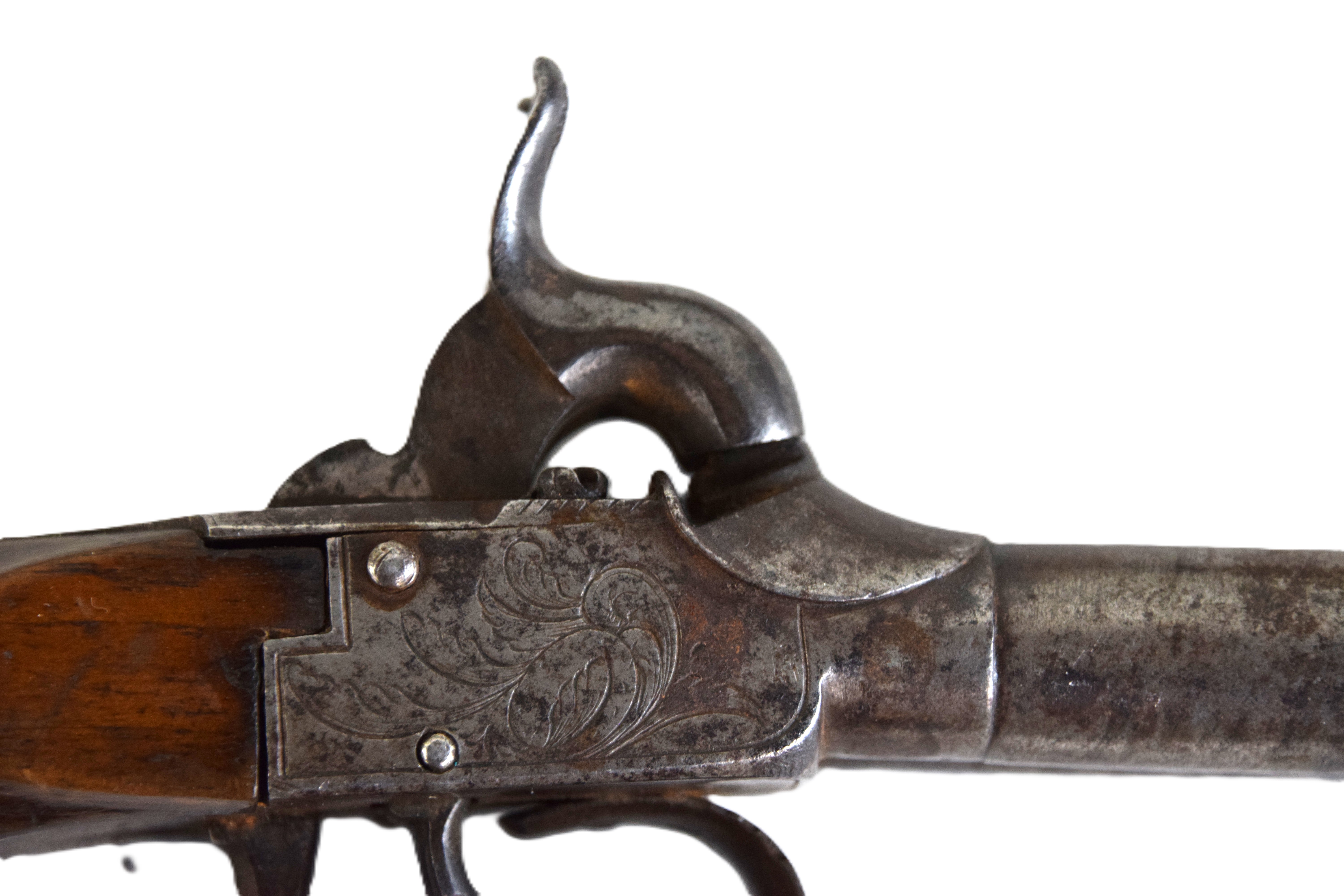 Double barrel and trigger percussion pistol with Damascus barrels. This double barreled pocket percussion pistol was made in Liège, Belgium, almost certainly for the European and American export markets. The left side of the frame is marked with the E / L G / * in an Oval proof. These were quite popular for self-protection, and having two barrels definitely would give the owner increased protection. Dimensions: 3.5″ Barrels, 9″ Overall