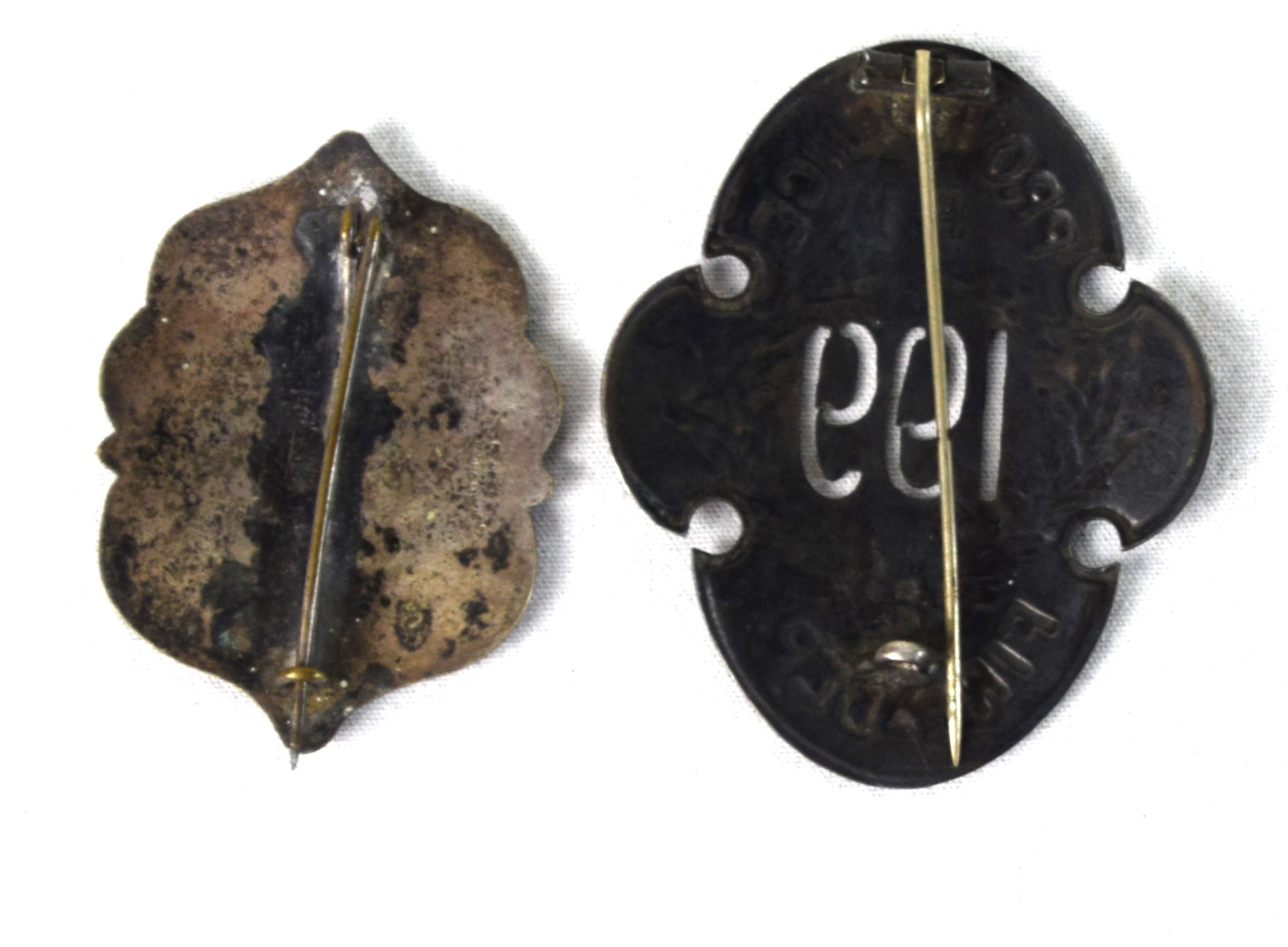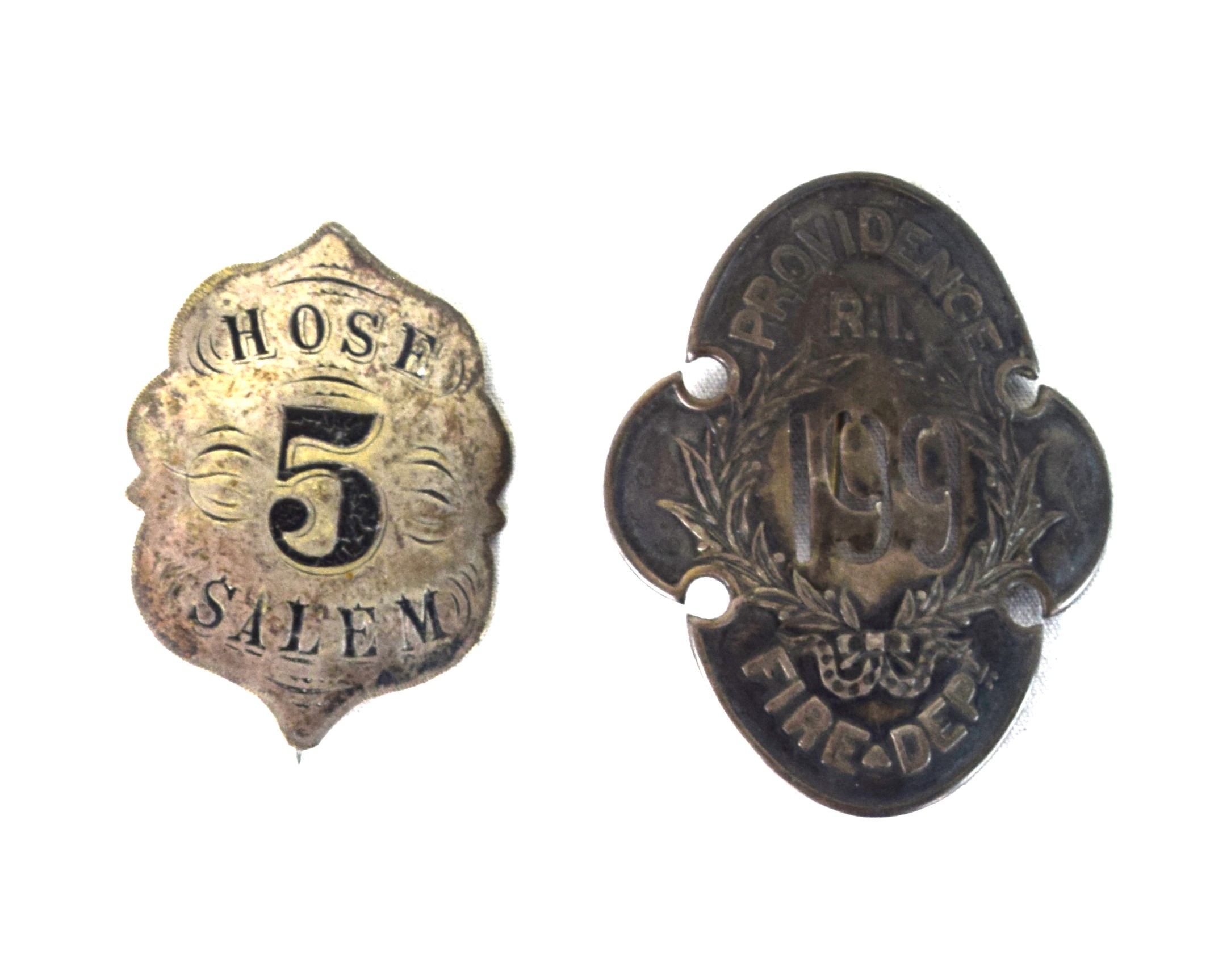 Two very early fireman badges, one marked ” Horse 5 Salem” and the other “Providence RI 199 Fire Department”. Possibly silver. Dimensions: 2″ and 3″ H