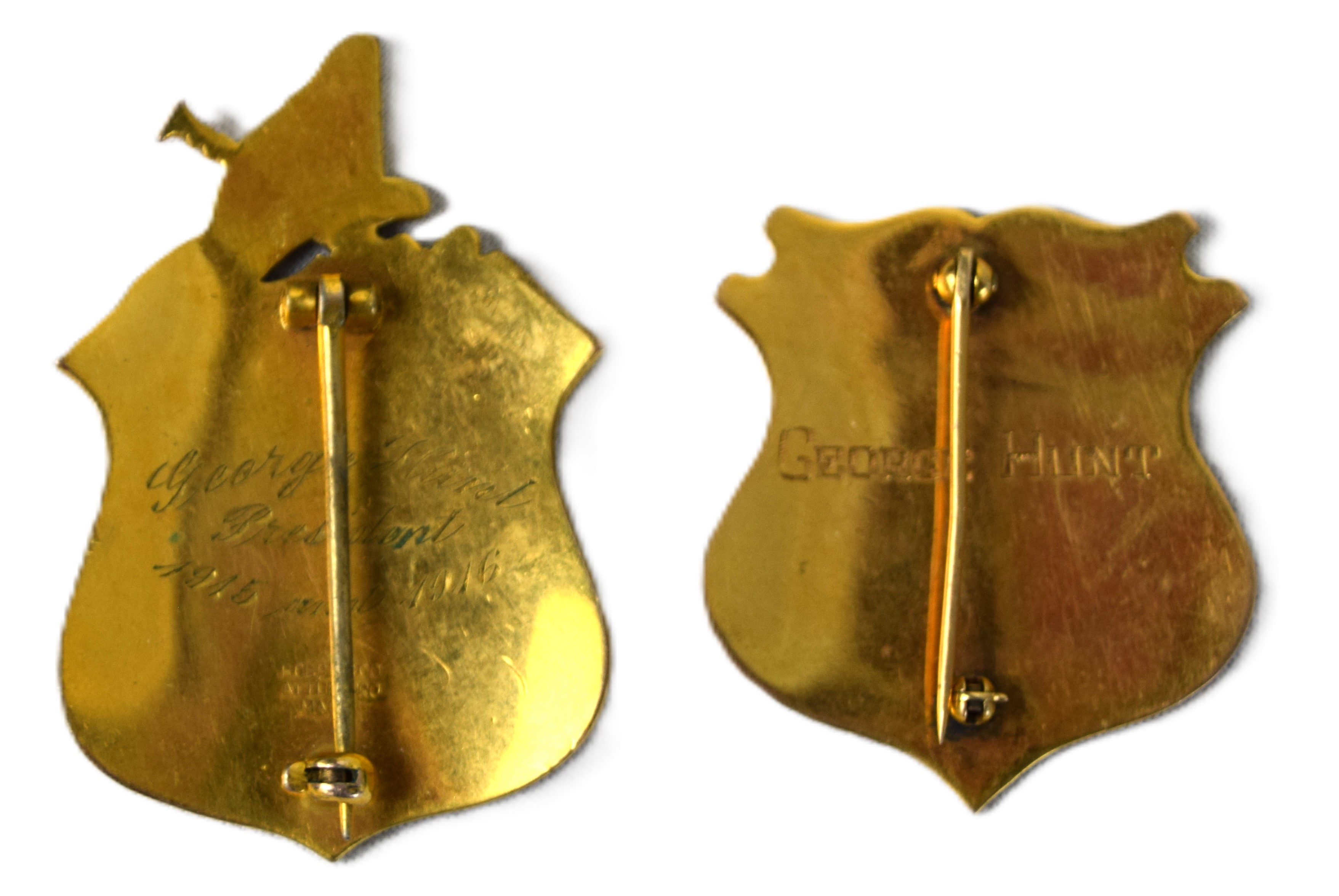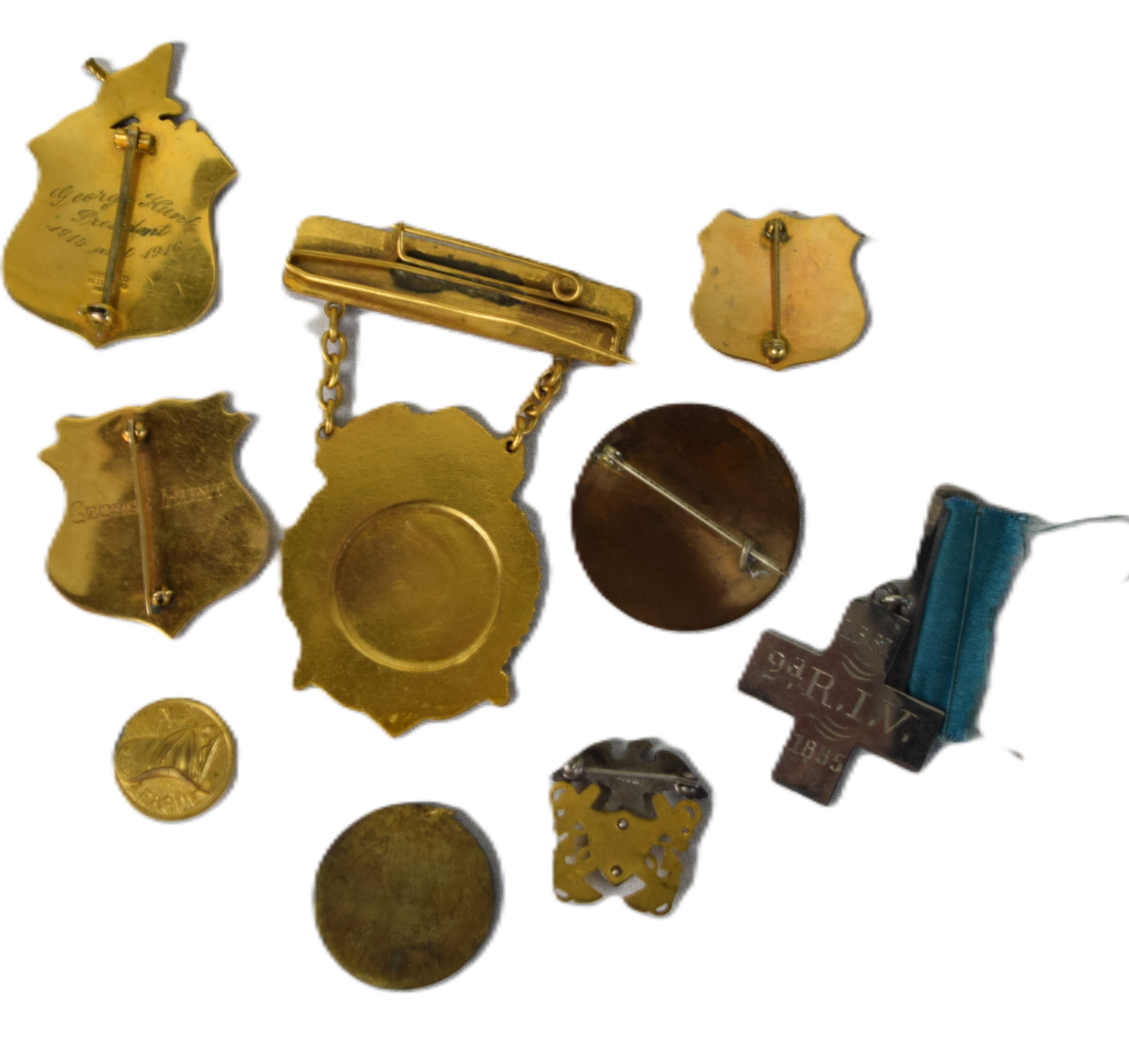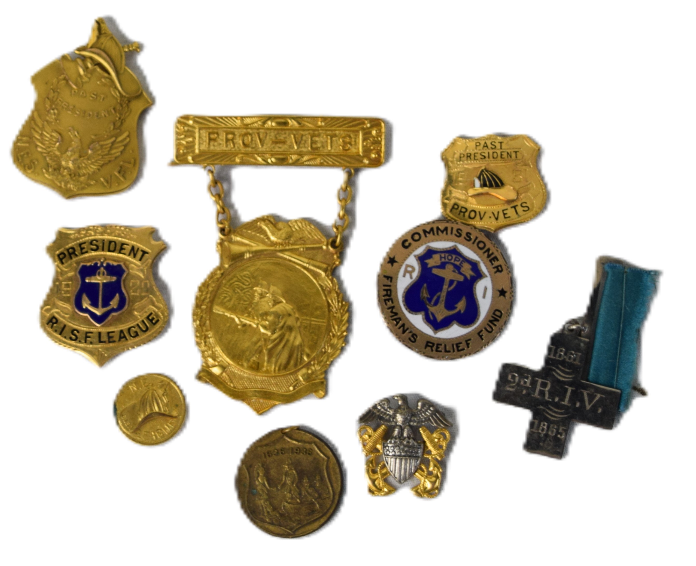 Collection of nine fireman badges, pins and pendants including President of R.I.S.F. League, Fireman’s relief fund, Providence fireman Vets-nine total badges.