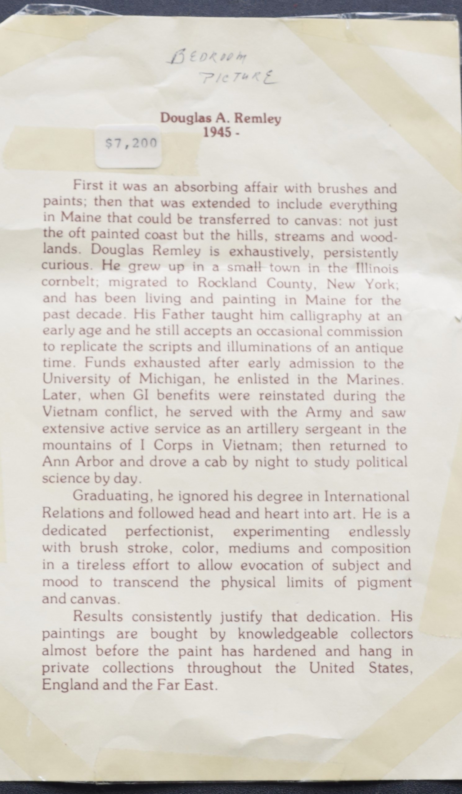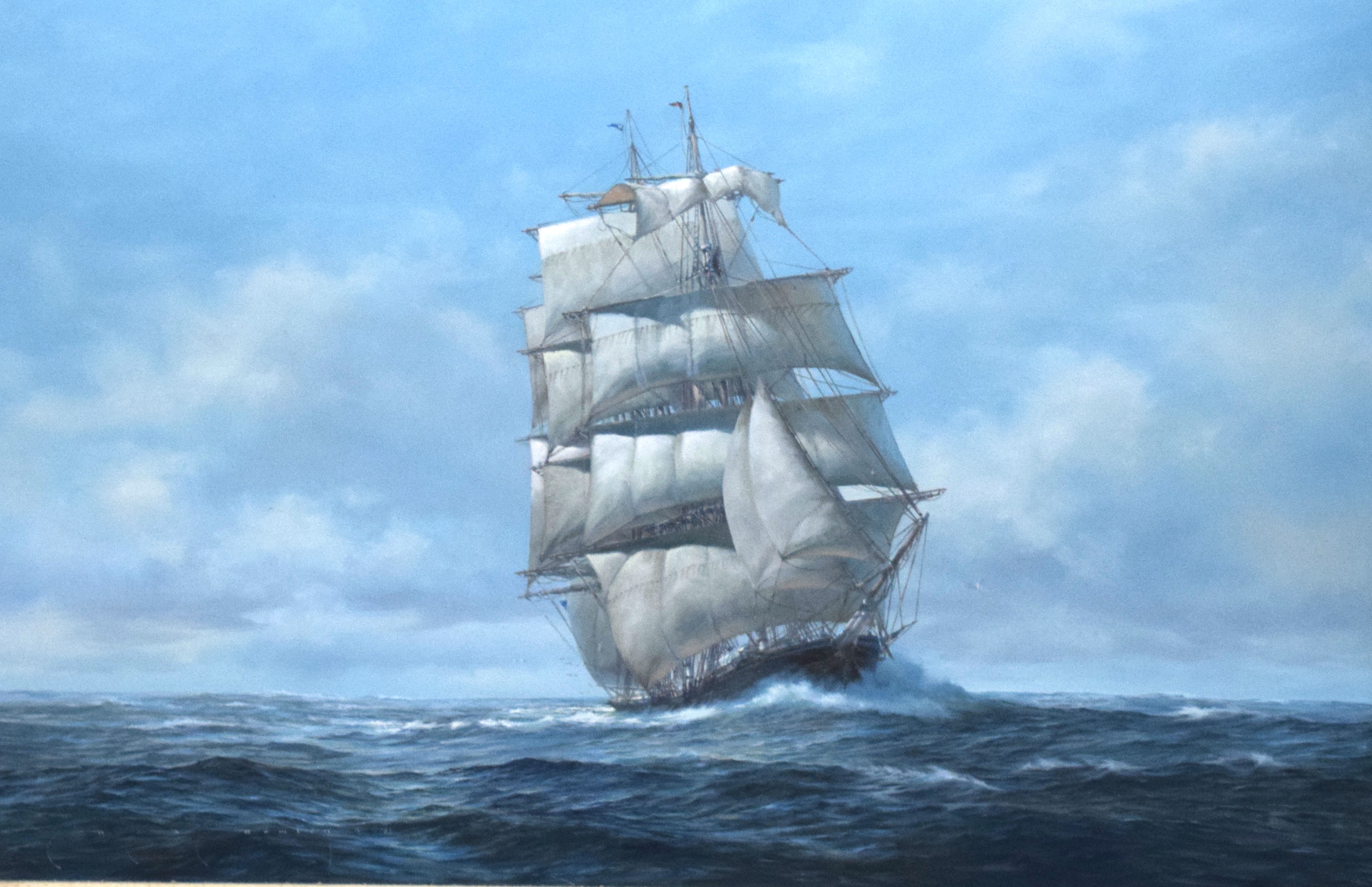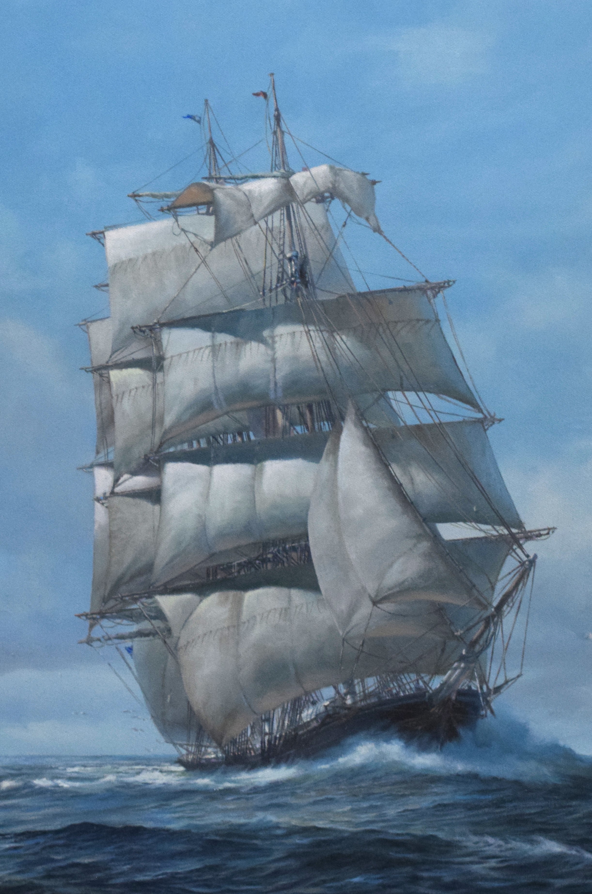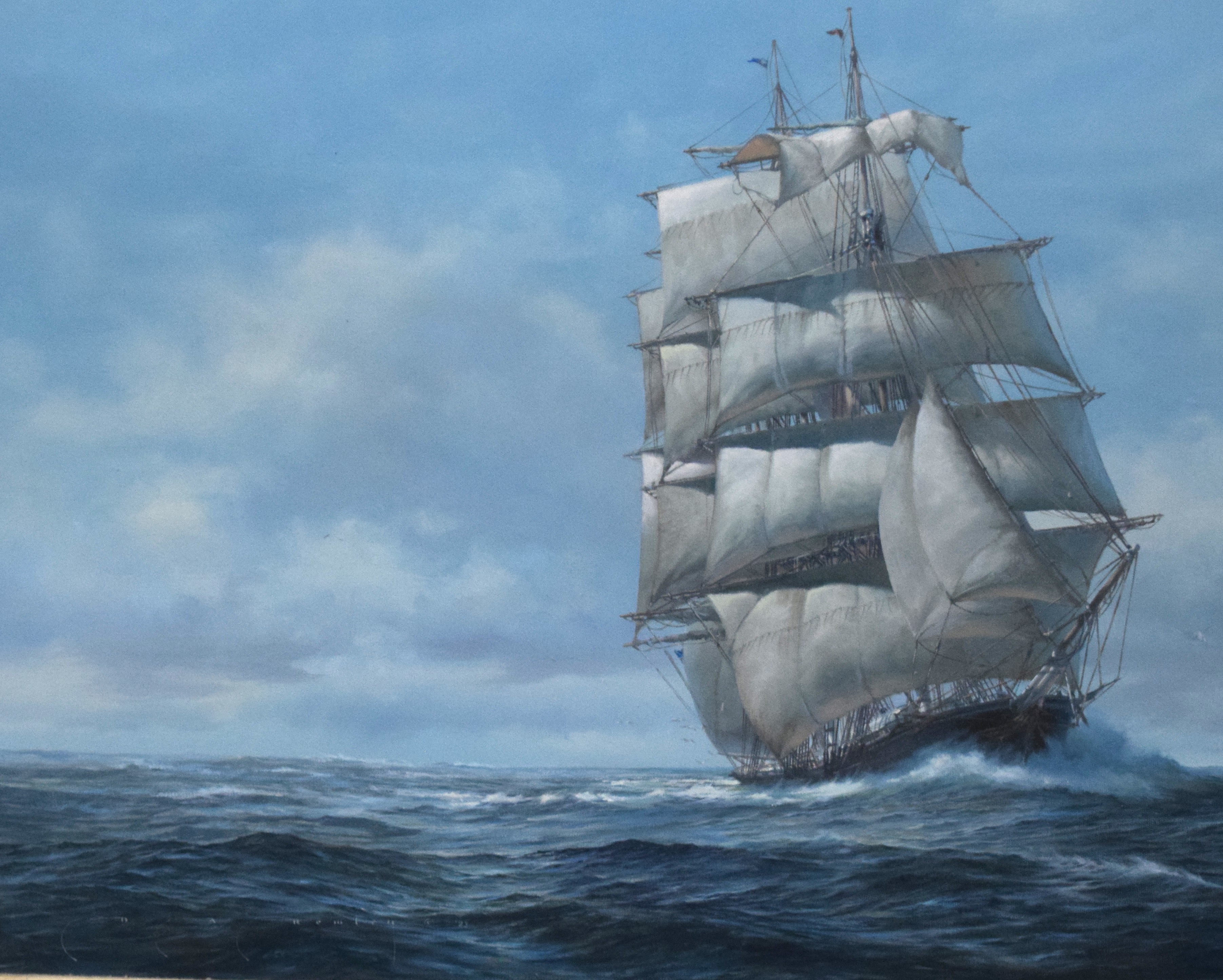 20th century oil on canvas ship painting in full sail by Maine artist Douglas A. Remley (1945-). Artist biography on back. From the Gosselin NH estate which was bought directly from the artist. Dimensions: 24″ x 36″ Image size, 34″ x 44″ Overall.