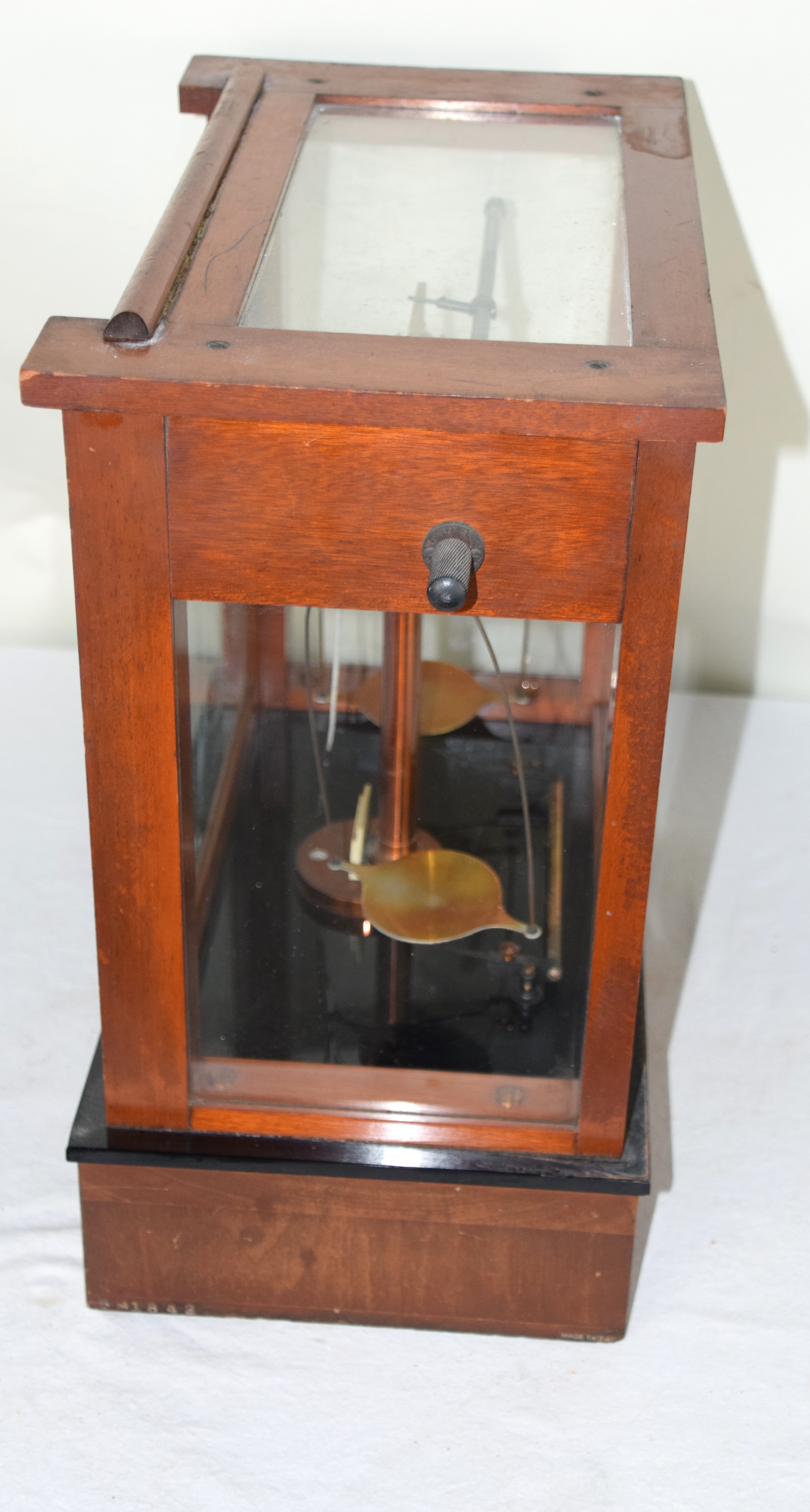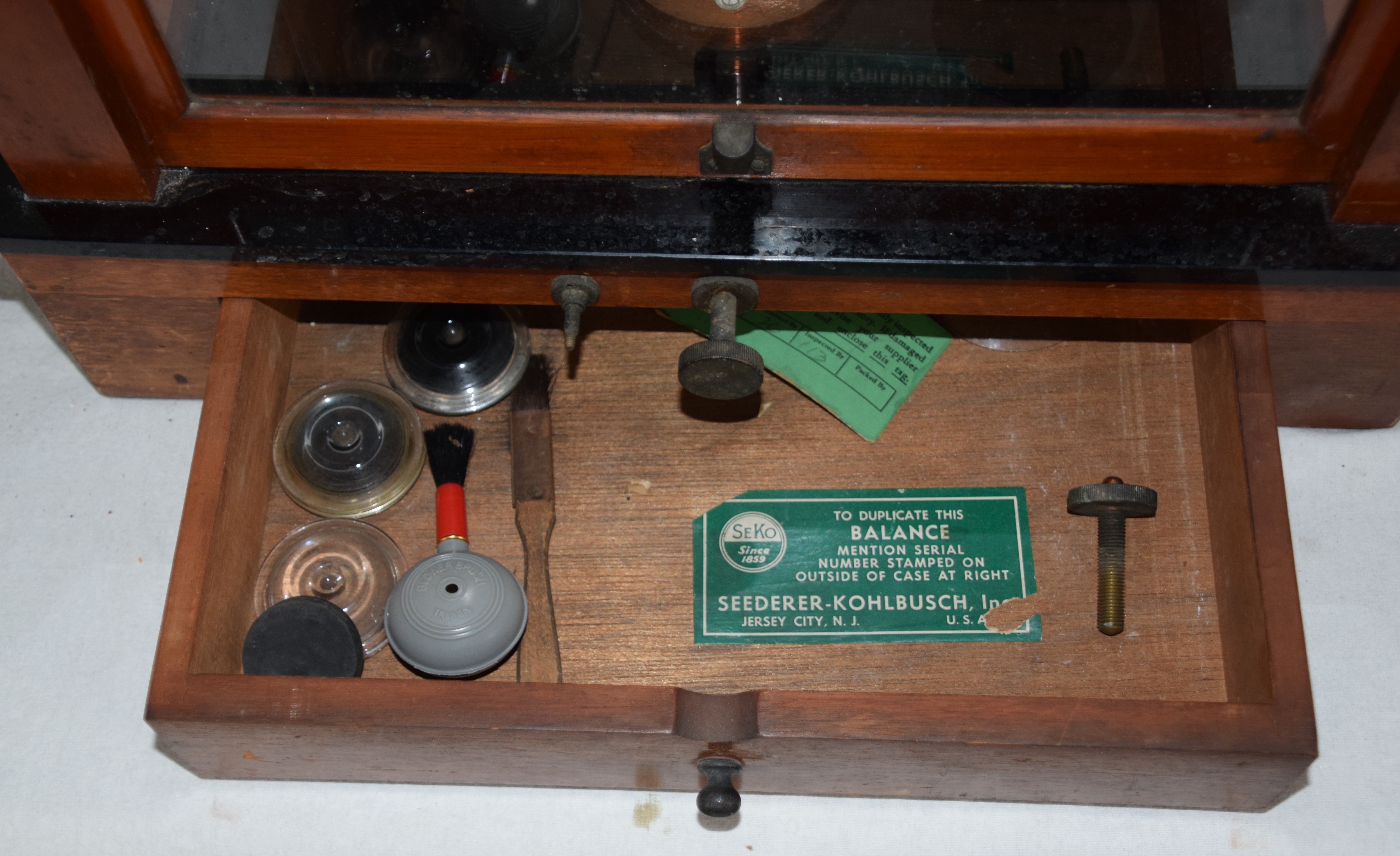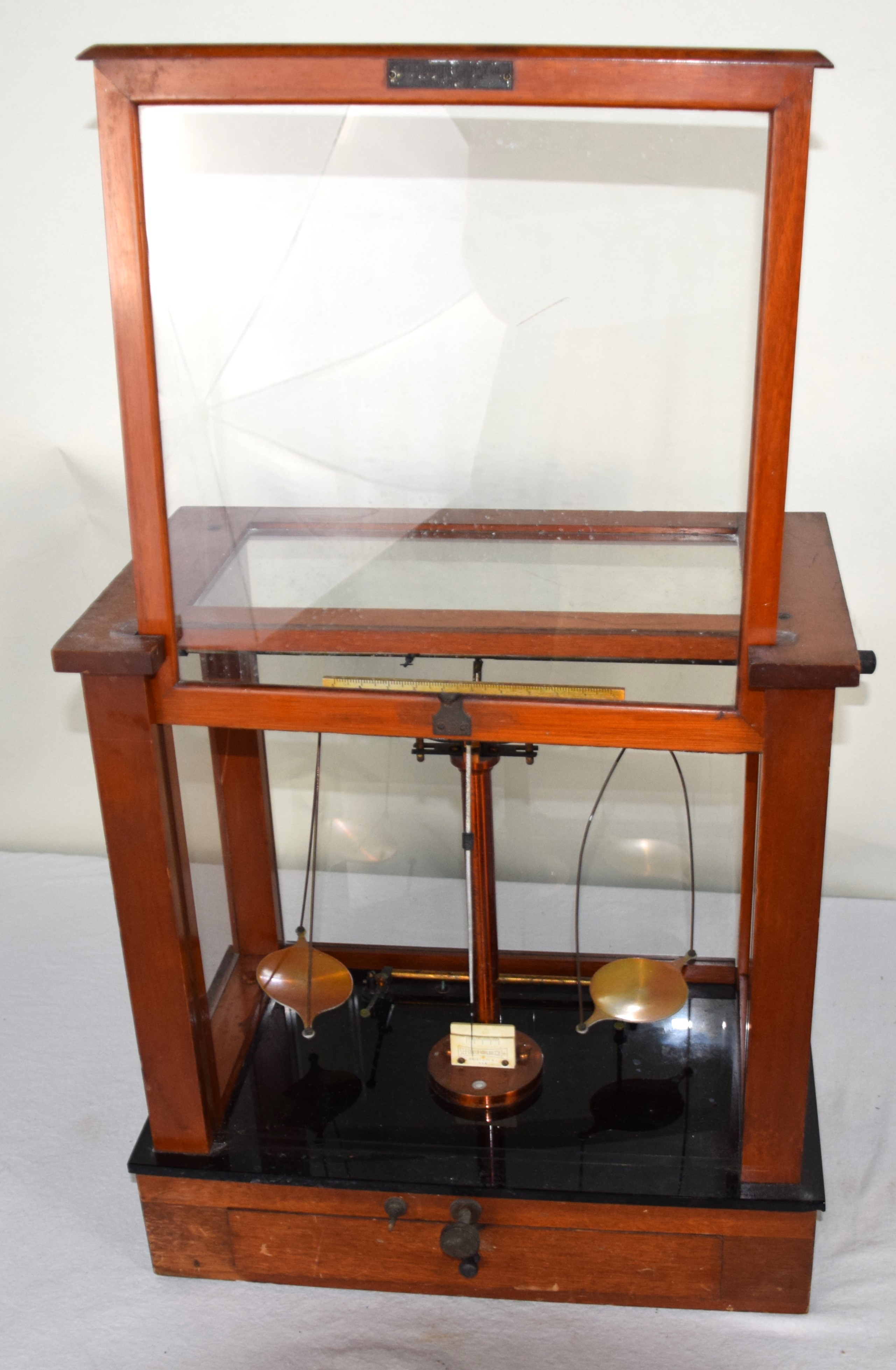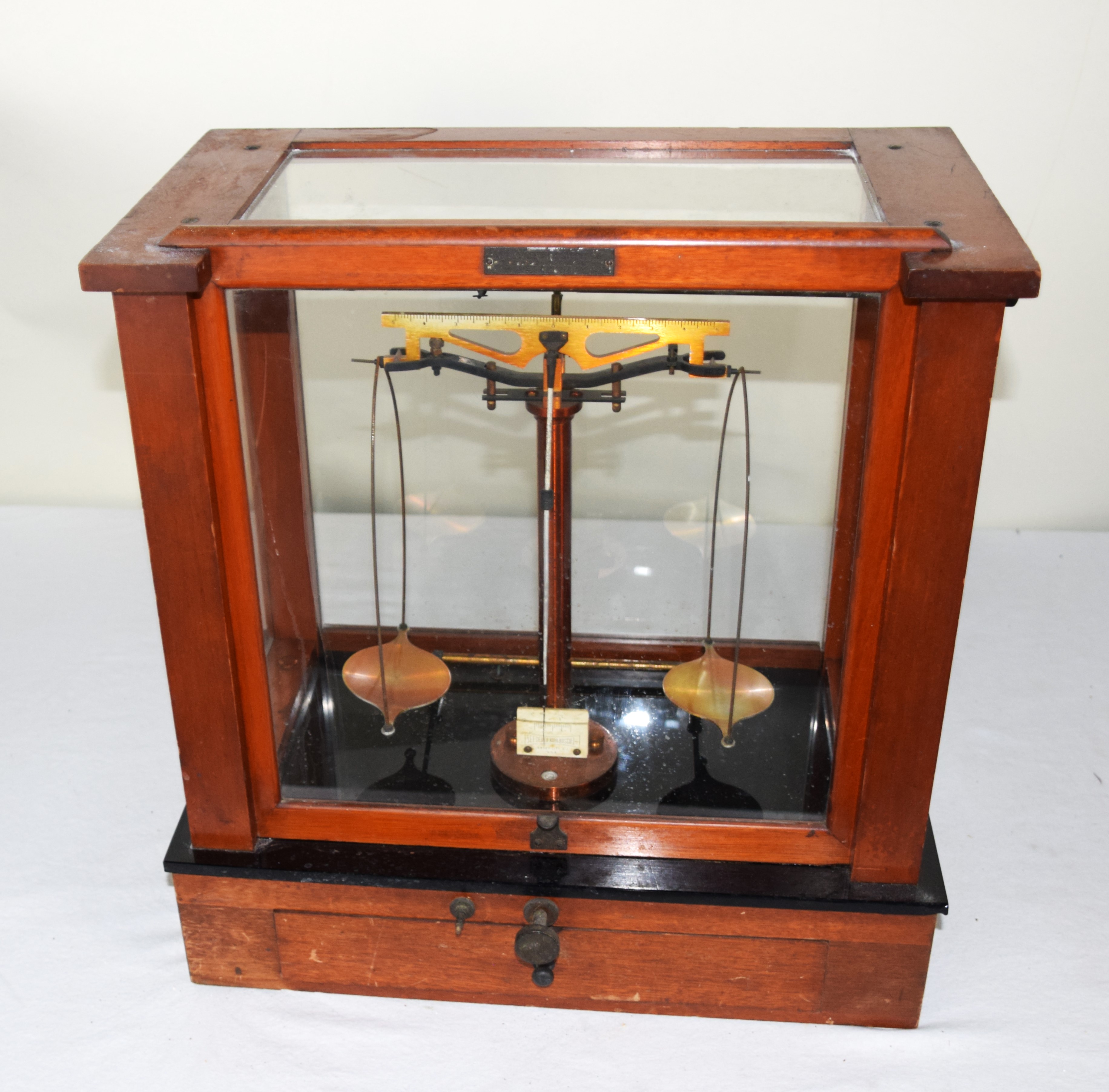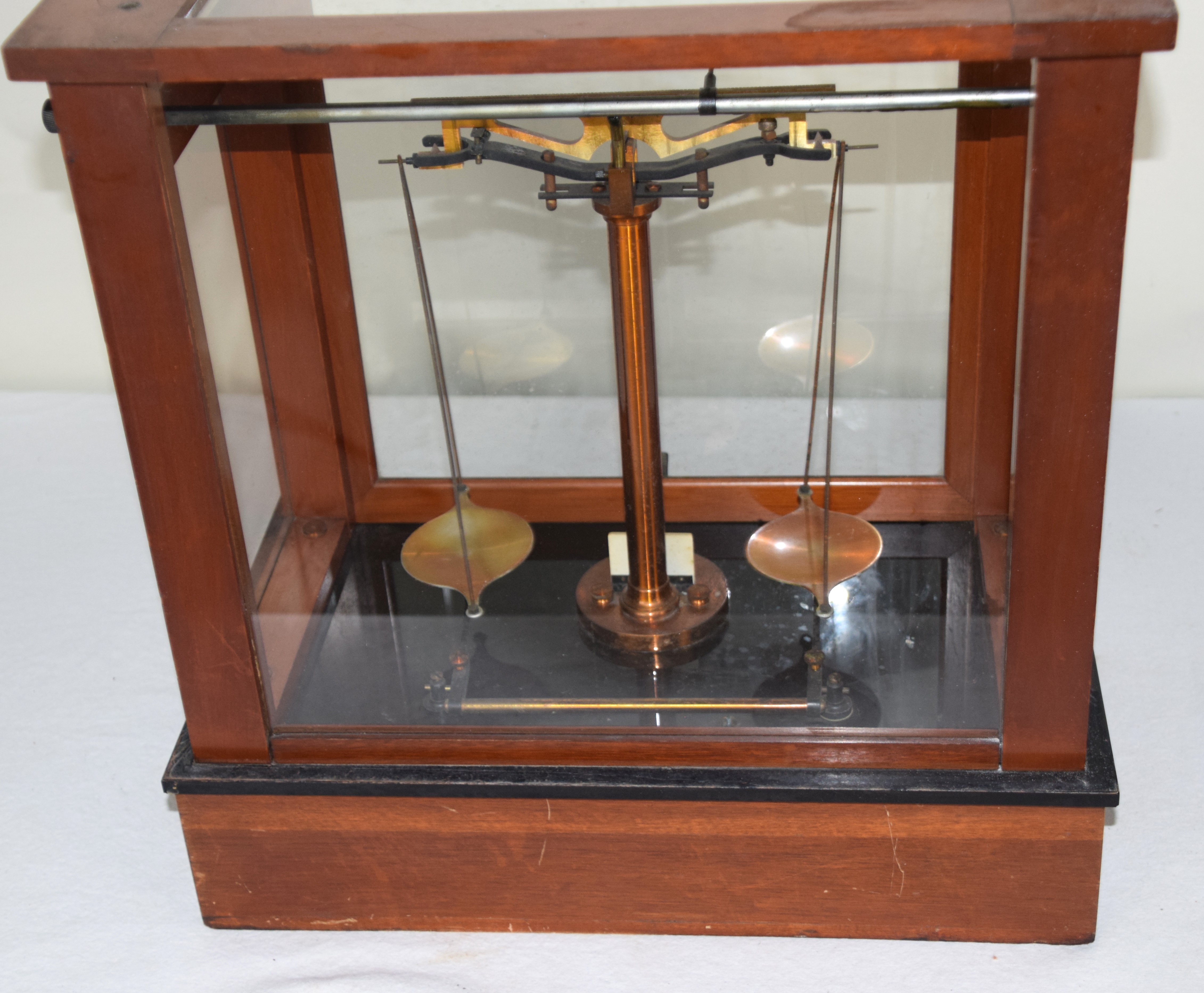 Top Quality gold precision glass enclosed scale with adjusting knobs, 19th Century, made by Seko, New Jersey, circa 1860. Dimensions: 17.5″ H x 17″ W x 9 3/4″ D