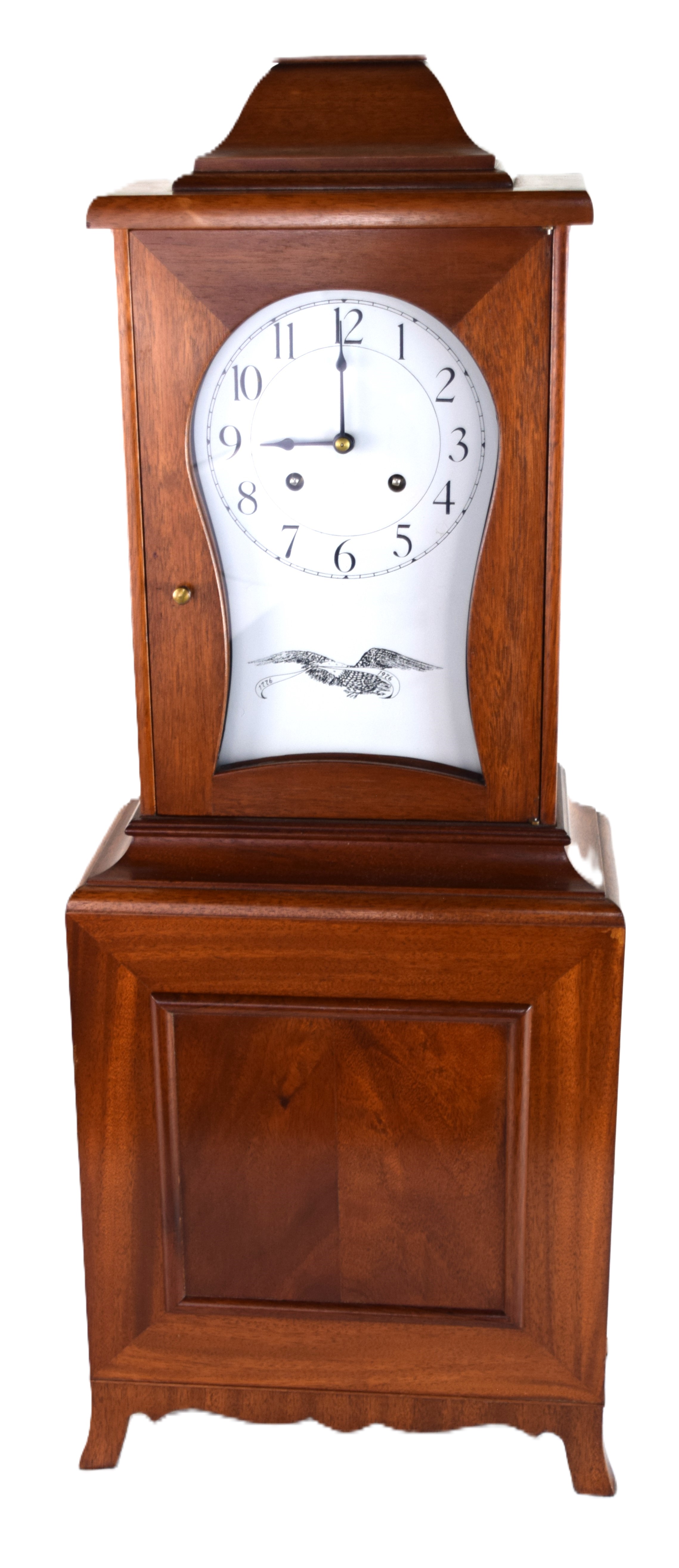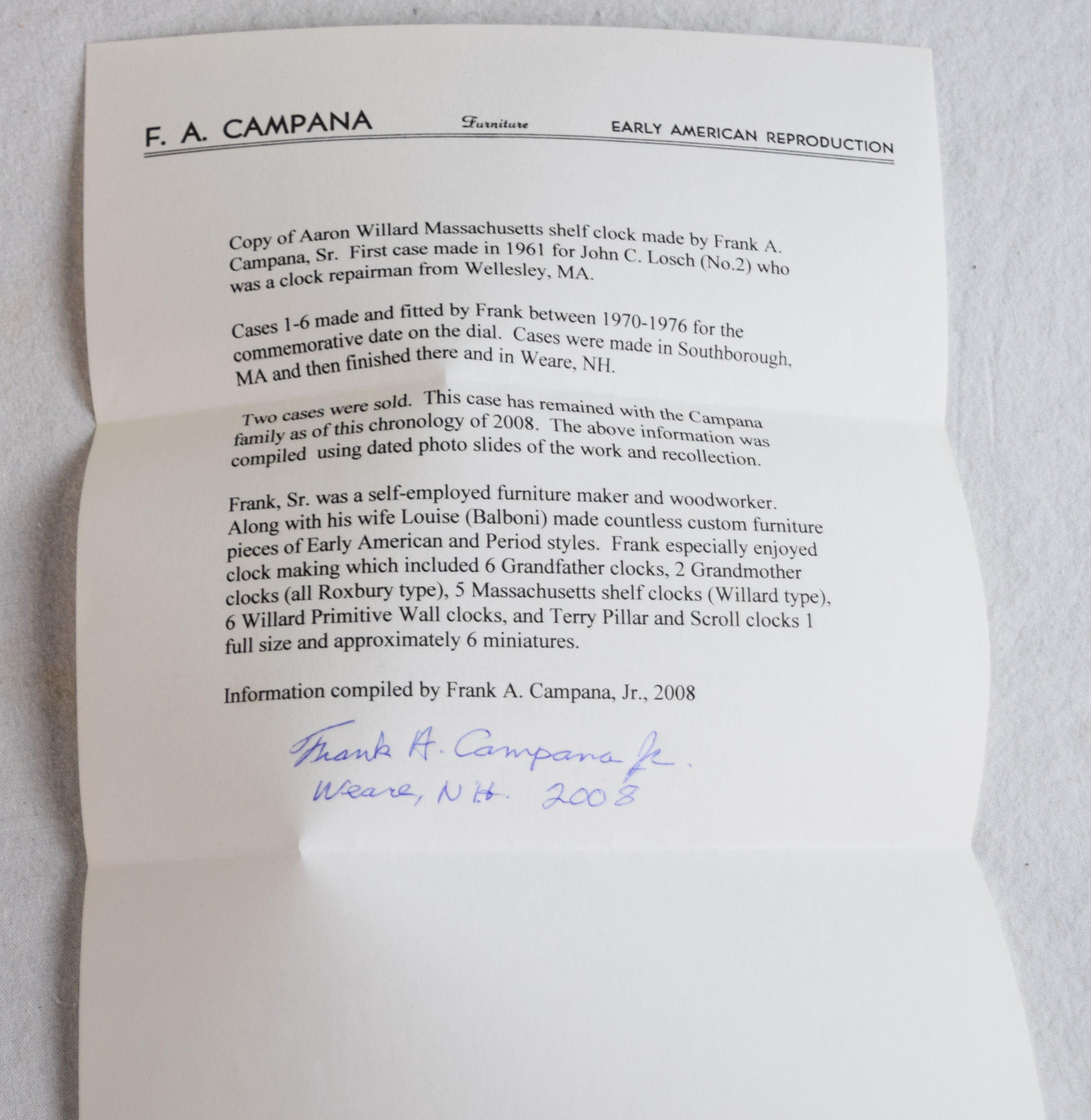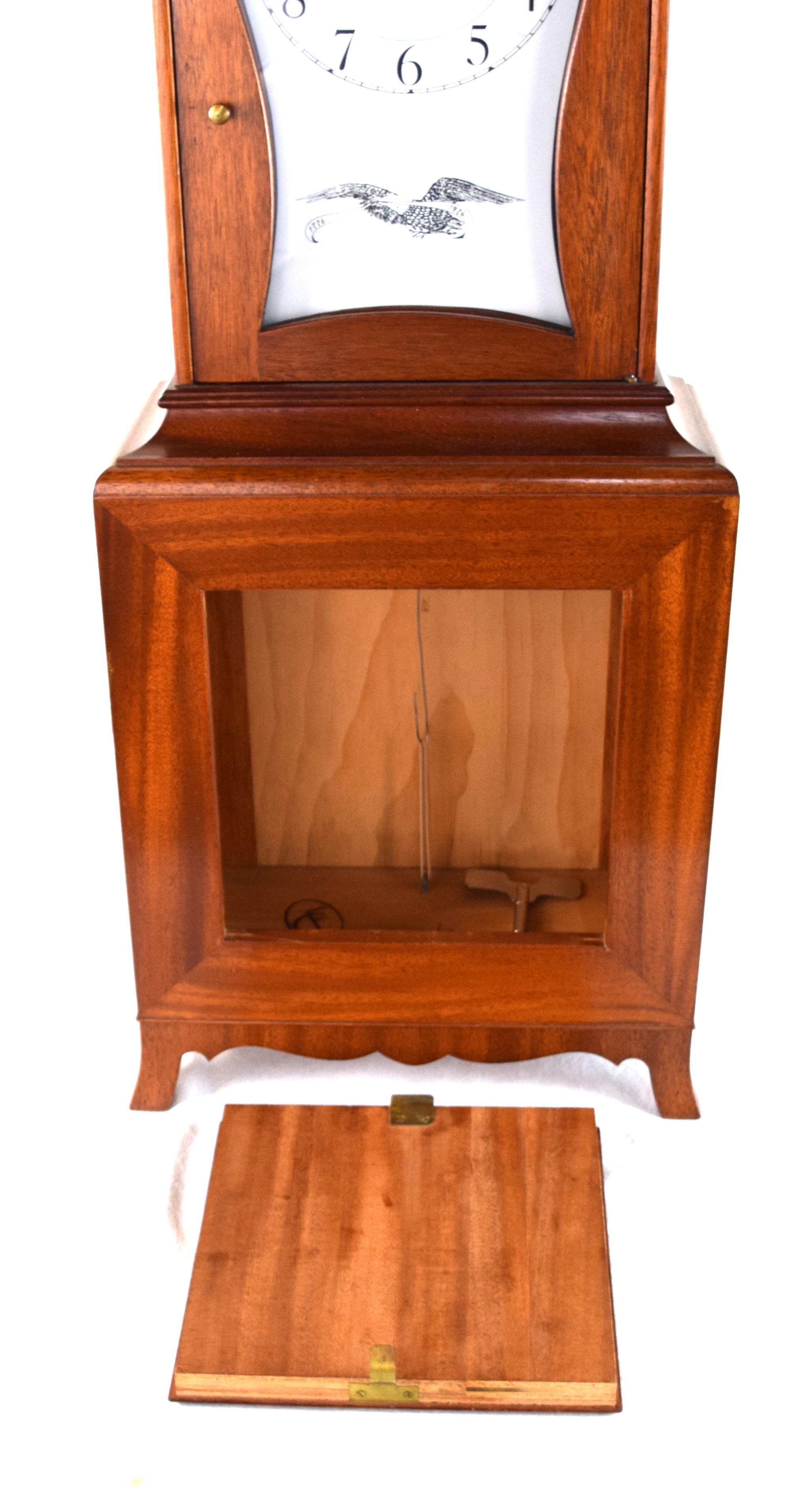 Excellent bench made Aaron Willard shelf clock in mahogany by Frank Campana Sr from Weare NH, circa 2008. White dial with numerals and eagle with dates 1776-1976, with hour and half hour strike. Comes with provenance. Dimensions: 32.5″ H x 12.5″w x 6″ D