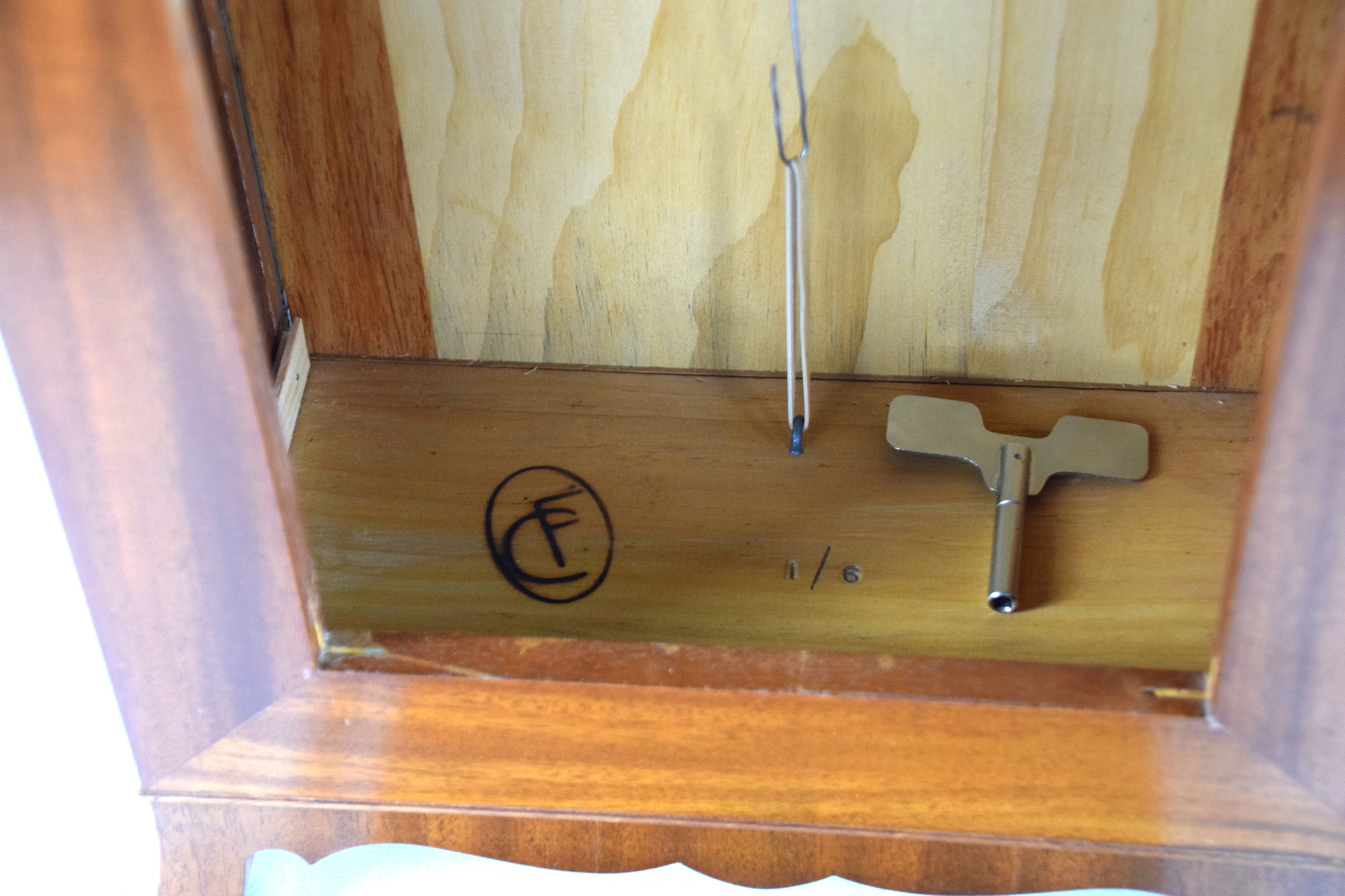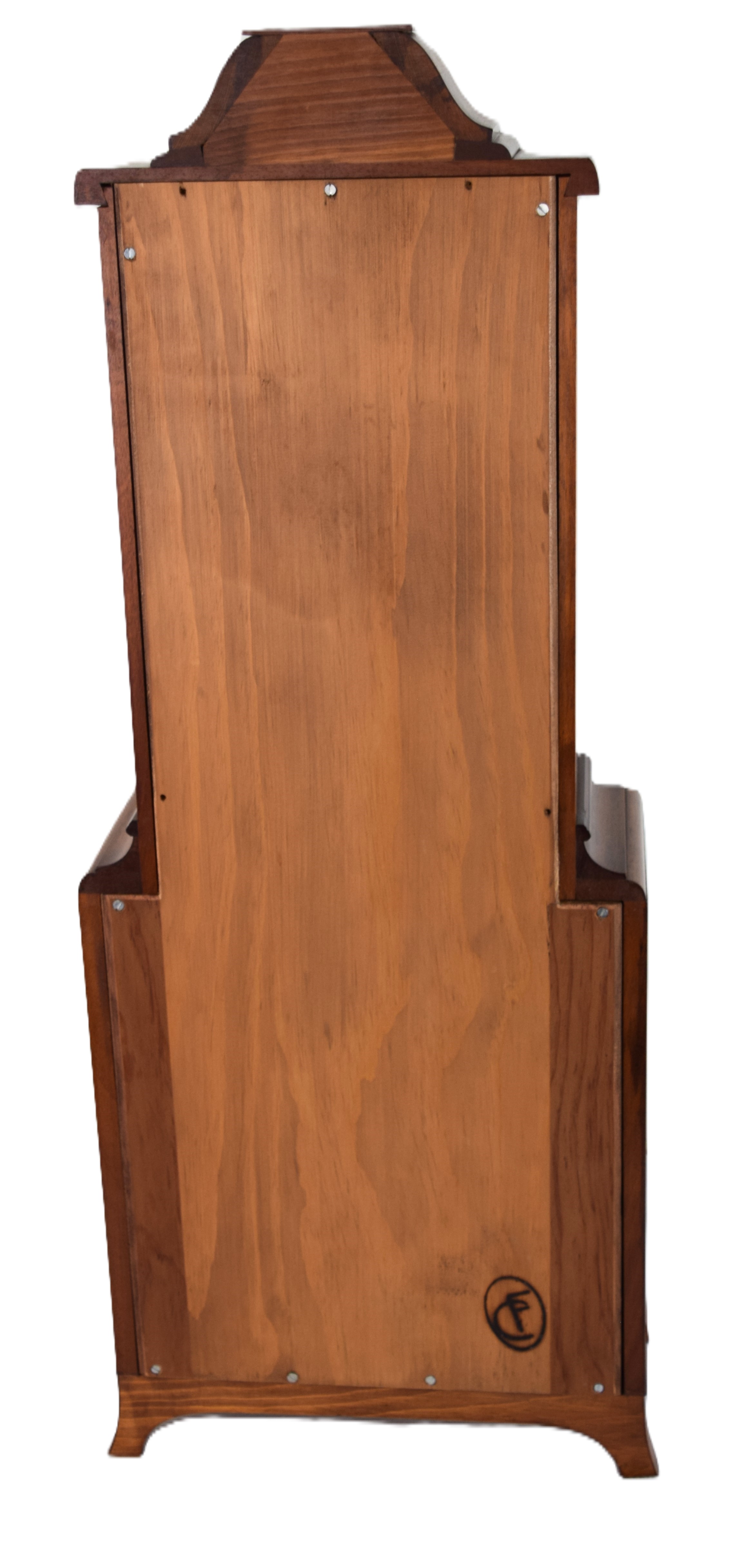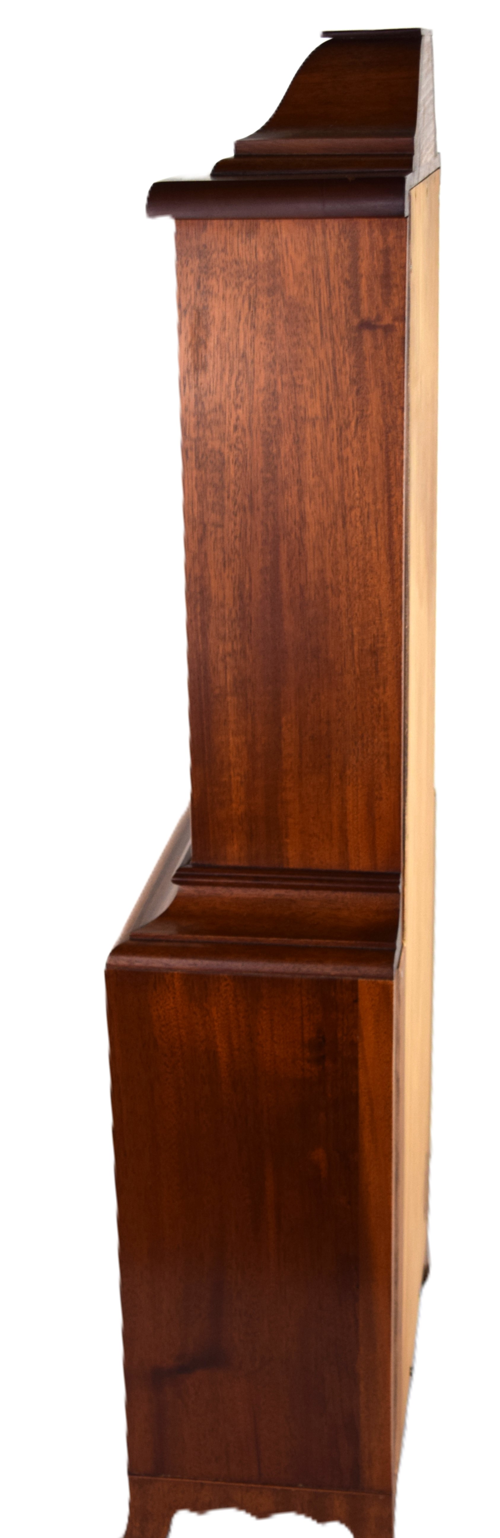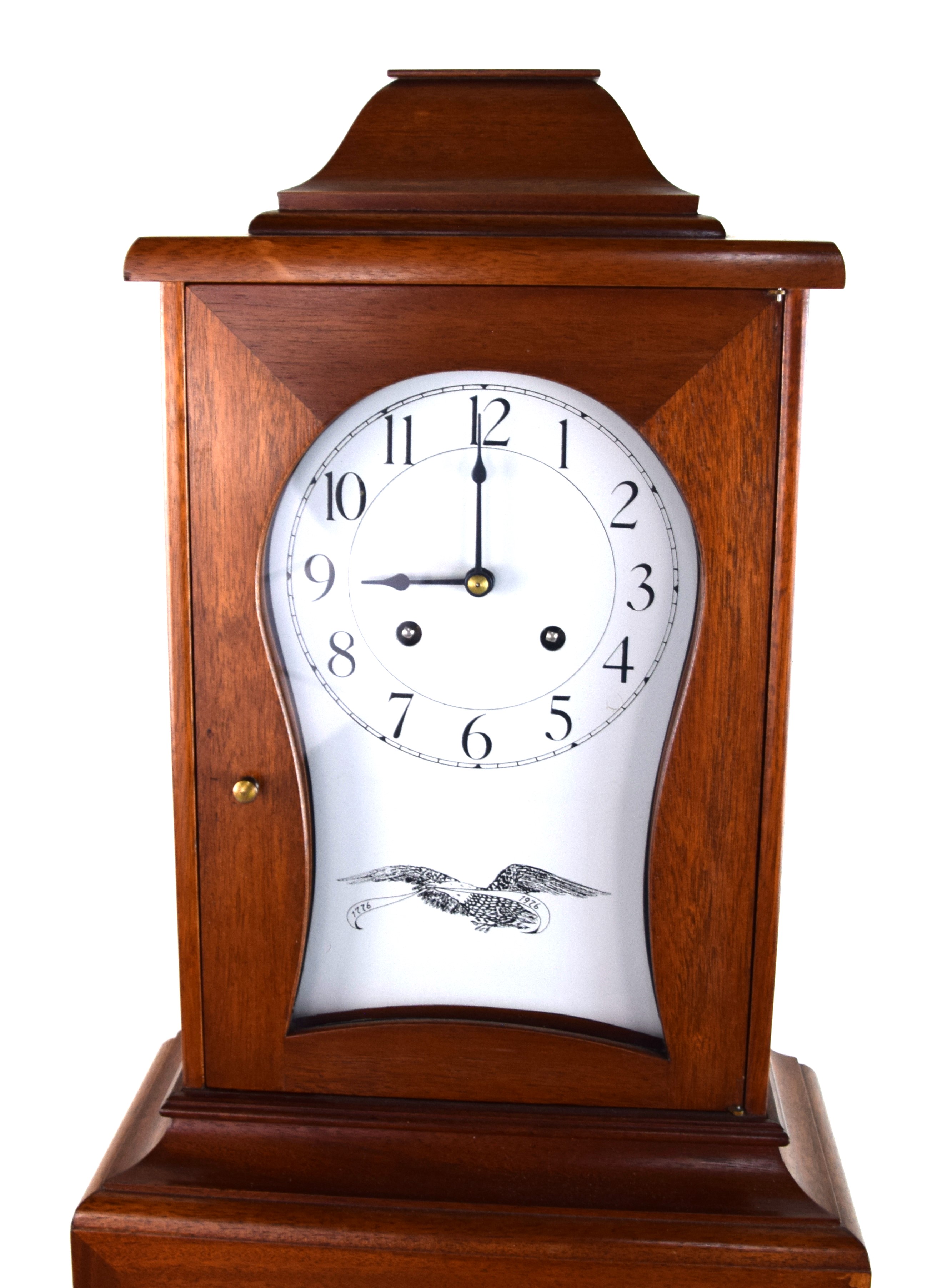 Excellent bench made Aaron Willard shelf clock in mahogany by Frank Campana Sr from Weare NH, circa 2008. White dial with numerals and eagle with dates 1776-1976, with hour and half hour strike. Comes with provenance. Dimensions: 32.5″ H x 12.5″w x 6″ D