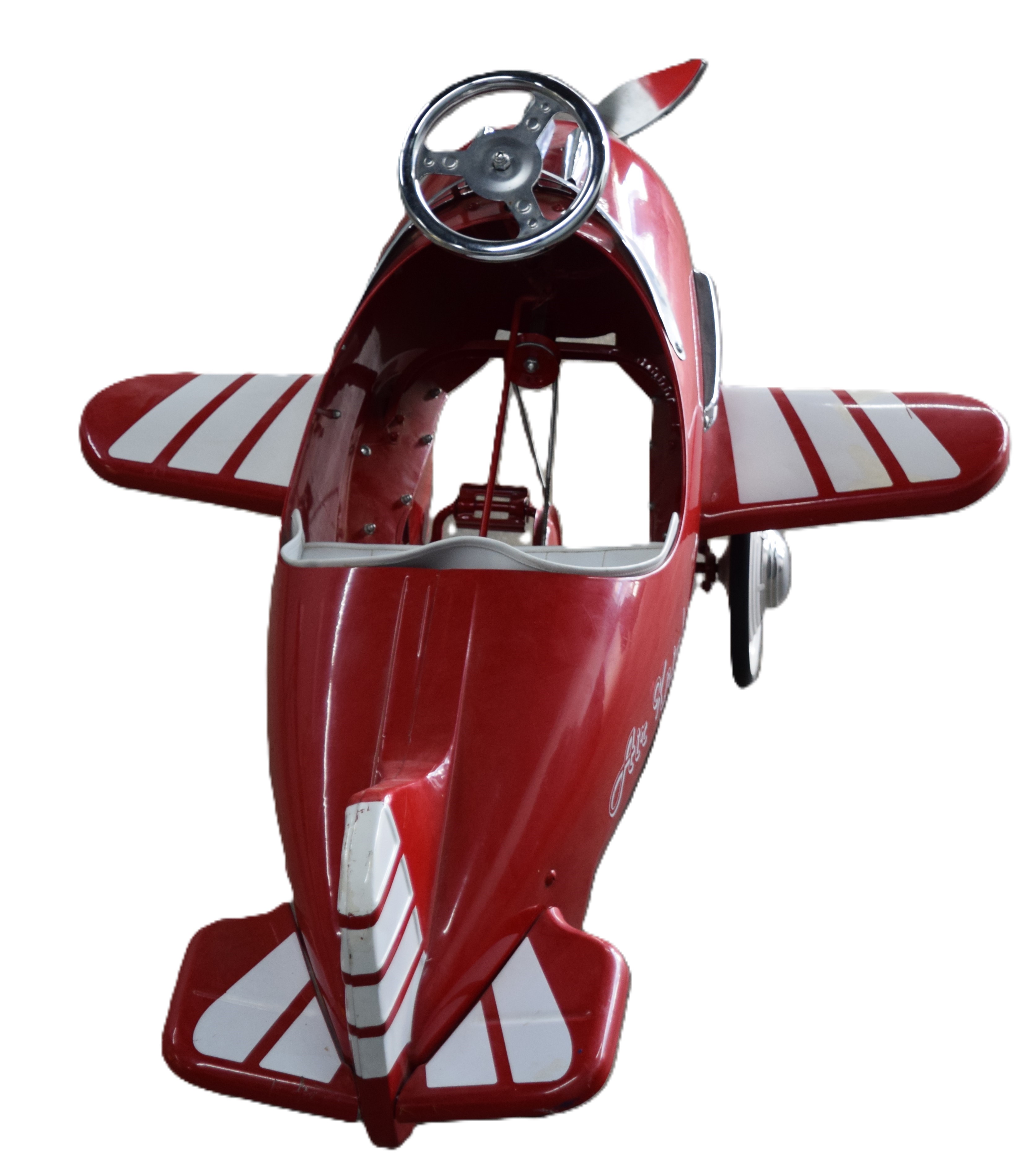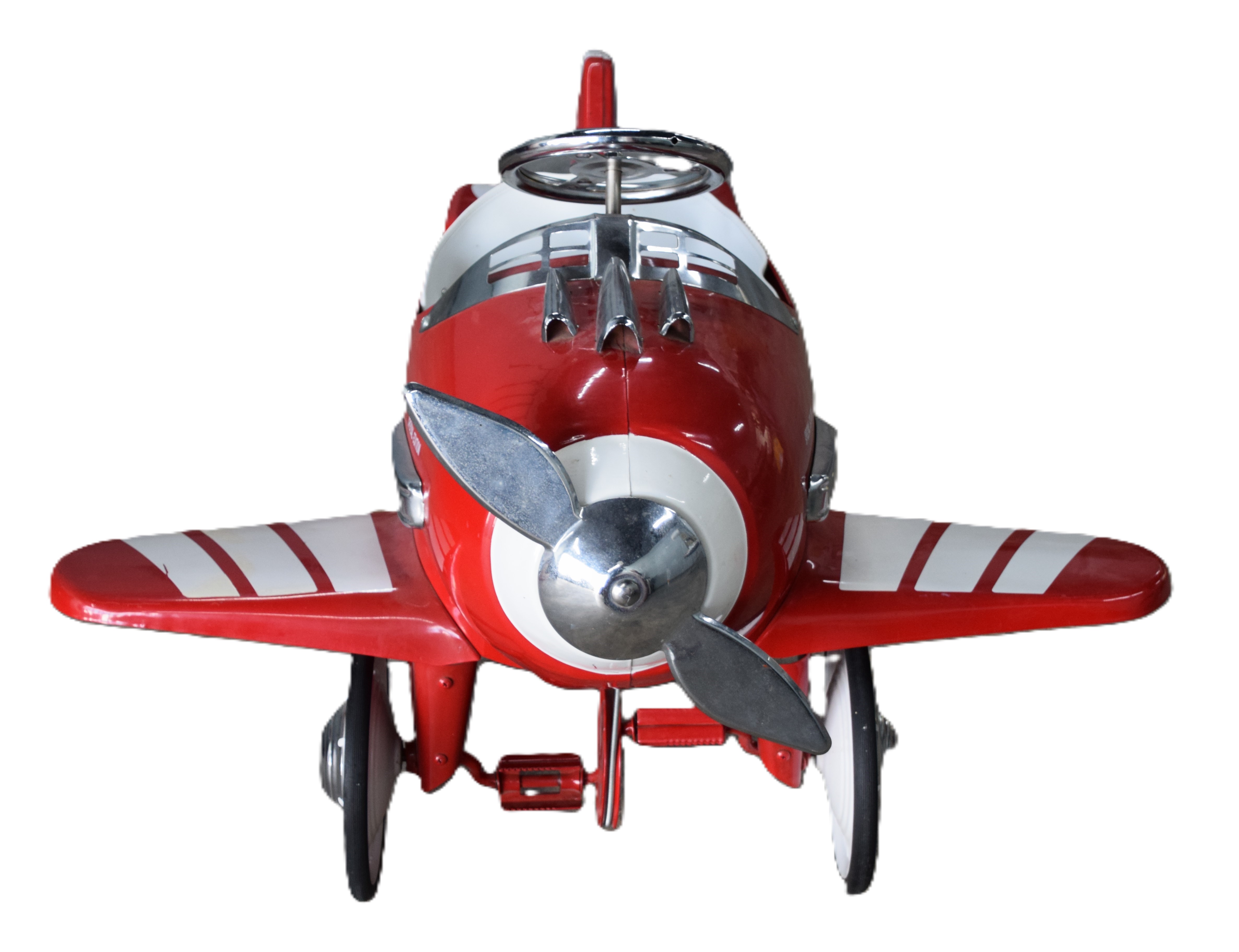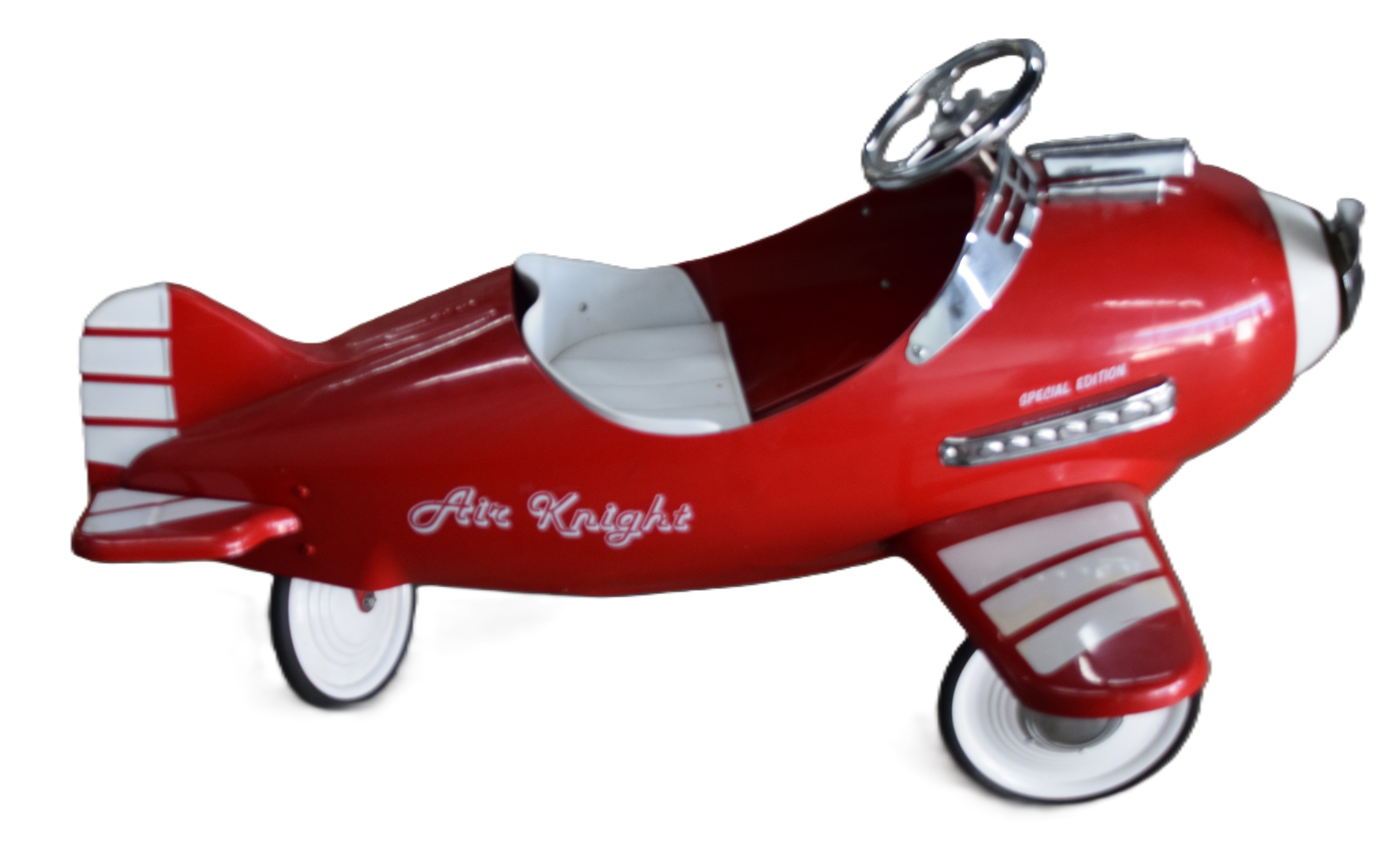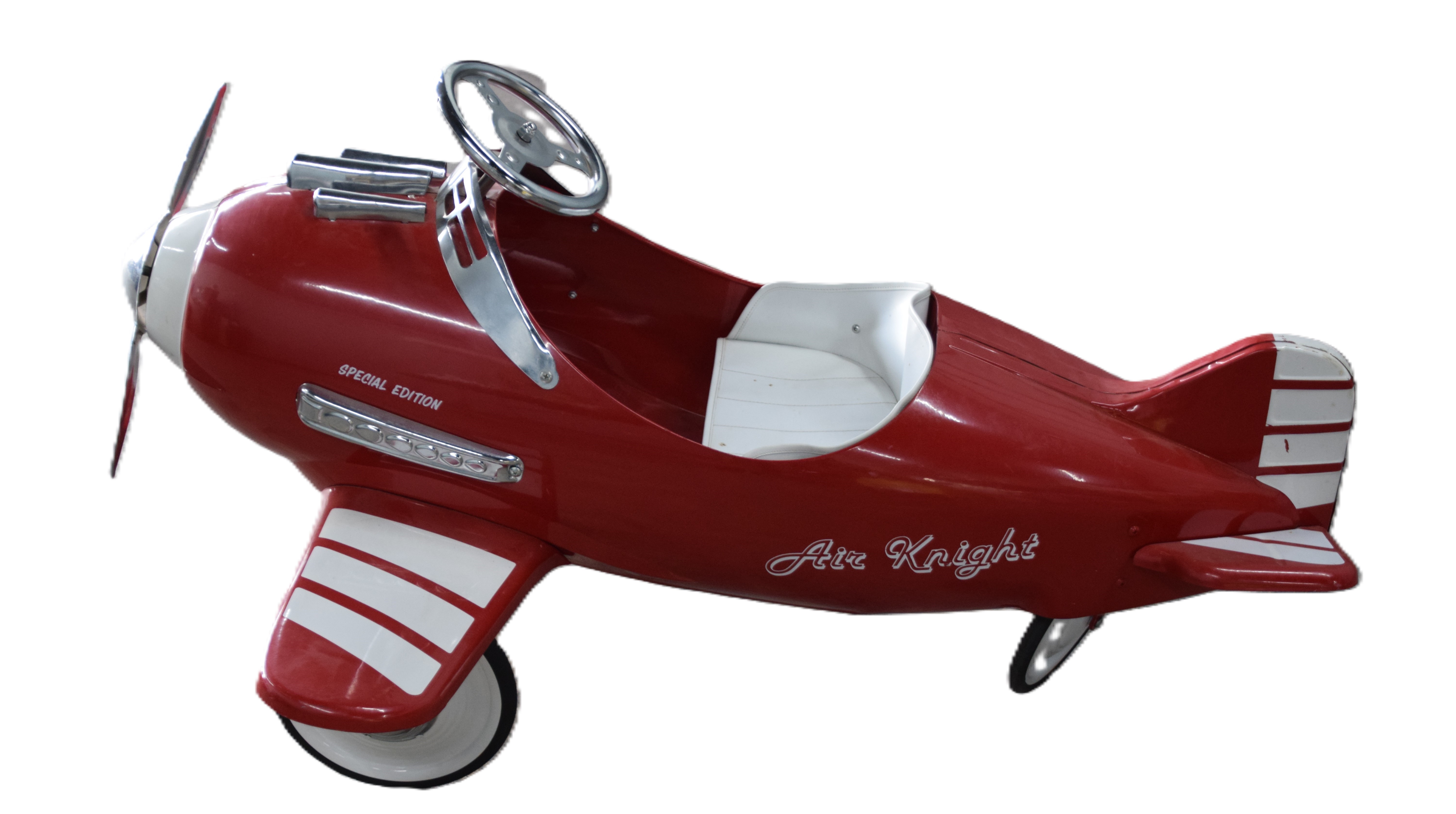 A Childs Special Edition “Air Knight” Pedal Airplane, 1950s style, painted red and white, pedal operates both steering wheel and propeller. Dimensions: 30″ Height to Steering wheel x 49″ L x 42″ W