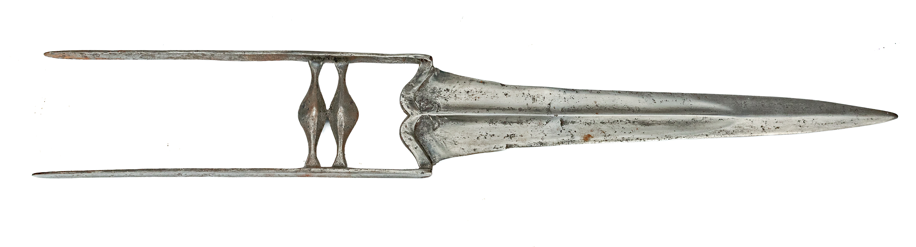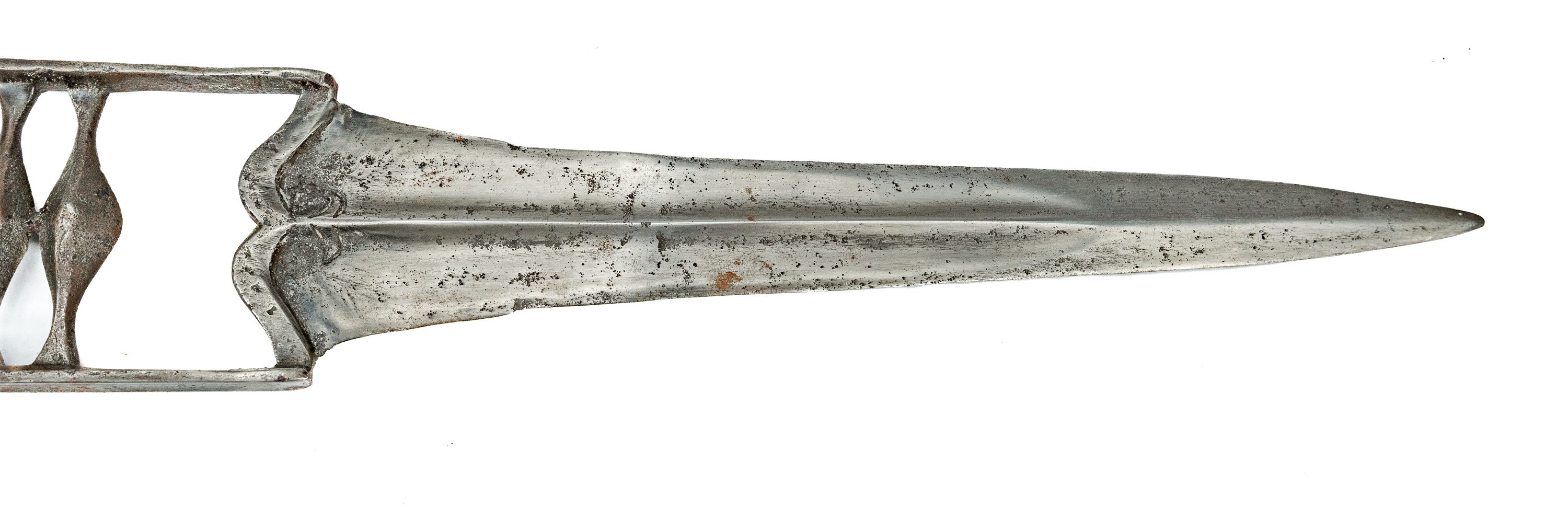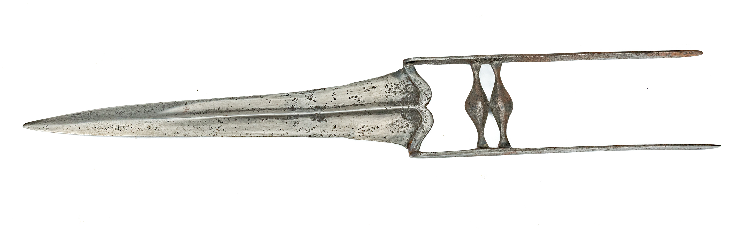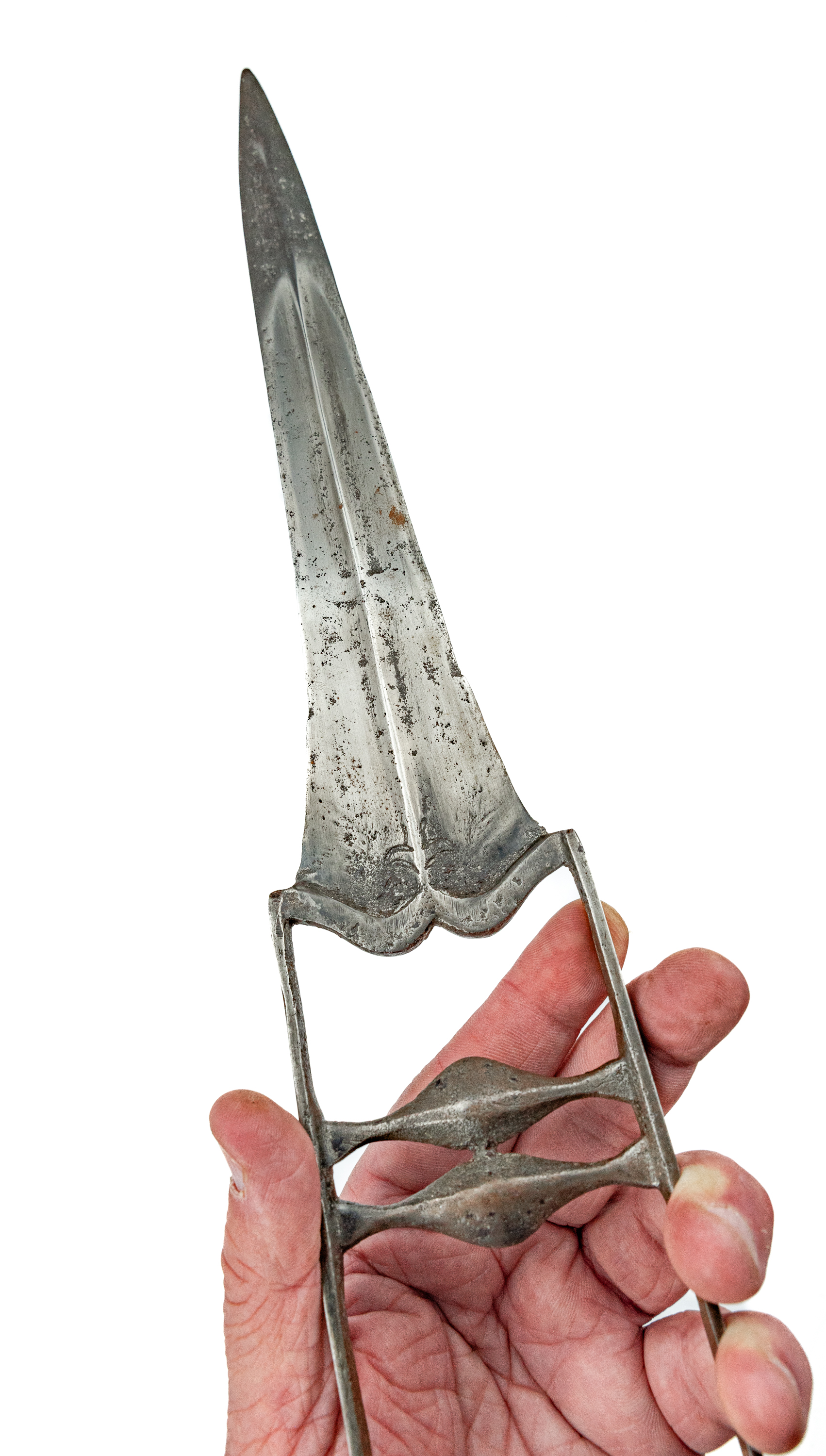 This 18th Century Katar is one of the oldest and most characteristic of the Indian hand-to-hand combat weapons. The handle sides were also used to block attacks. Because of the nature of the weapon, attacks were mainly direct thrusts that would easily pierce the enemies’ armor with a single but strong blow, possible because of the light weight and amazing attack speeds that could be achieved. The use of poisons was another deadly way of increasing the Katara’s effectivity in battle. Katar’s ceased to be in common use in the 19th century. The handle is made up of two parallel bars connected by two cross pieces. The blade is double-edged and straight. Dimensions: 19″ Overall