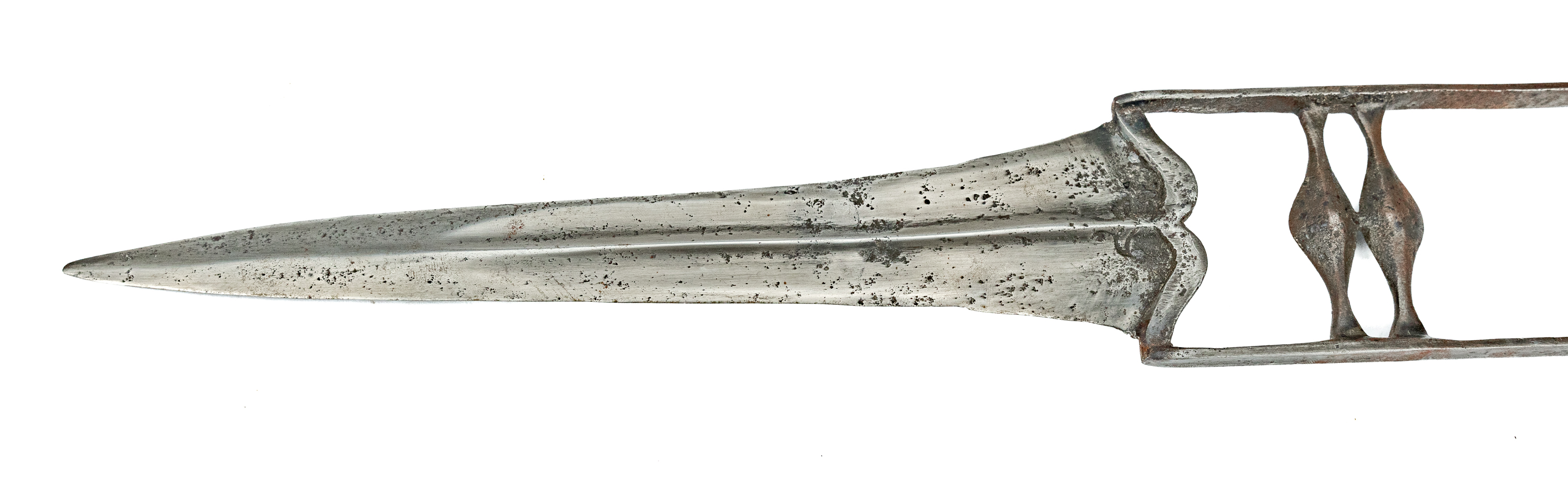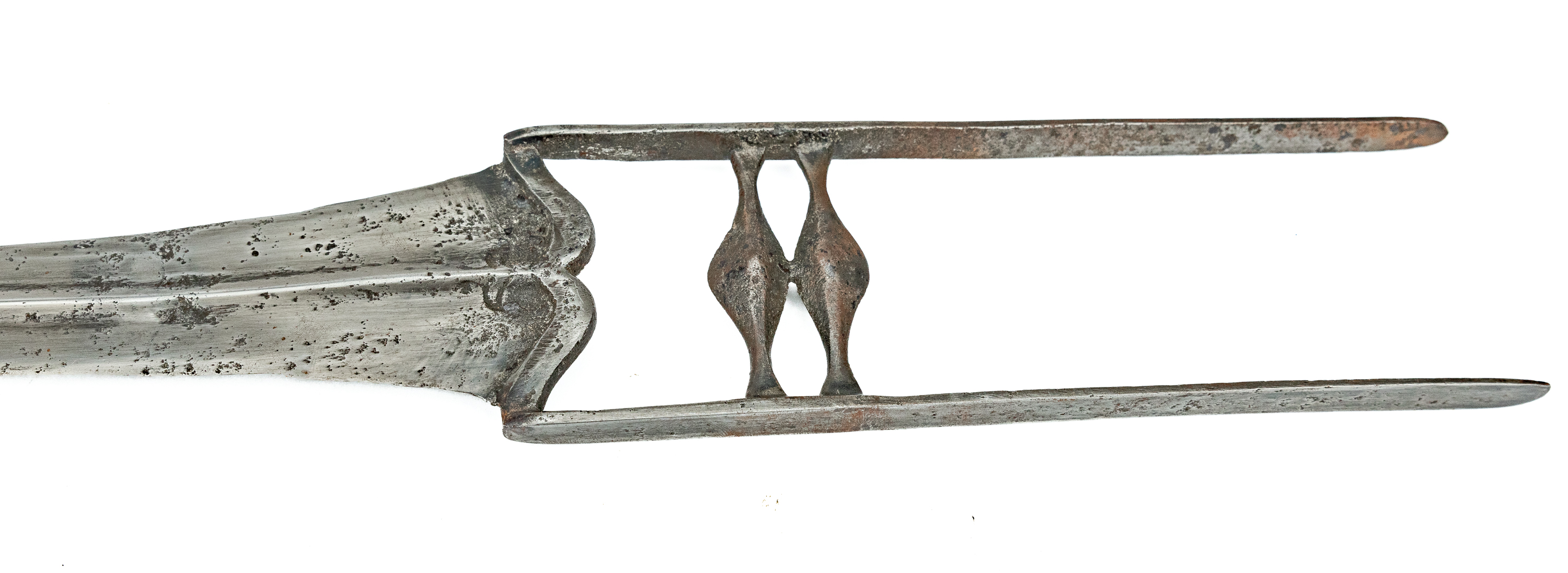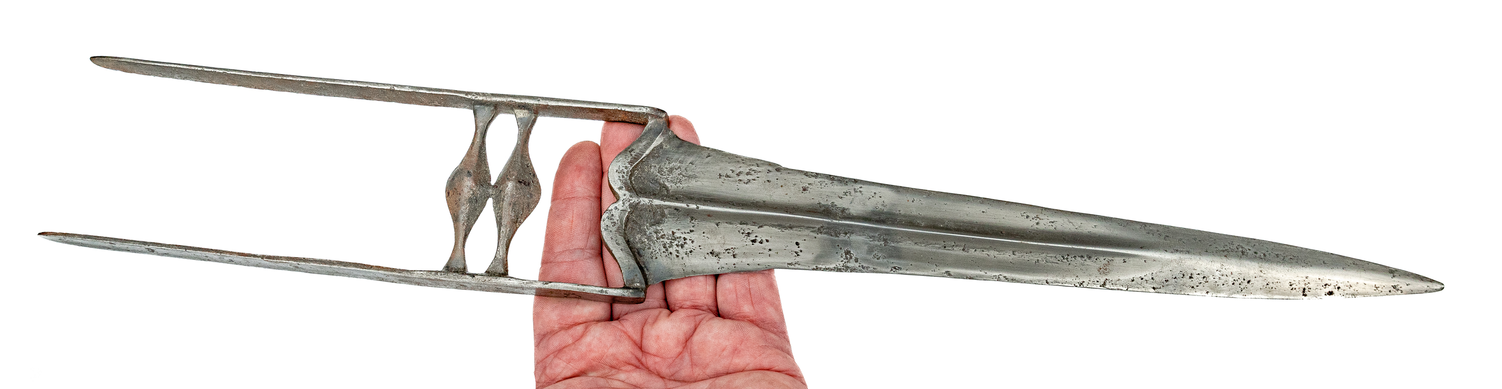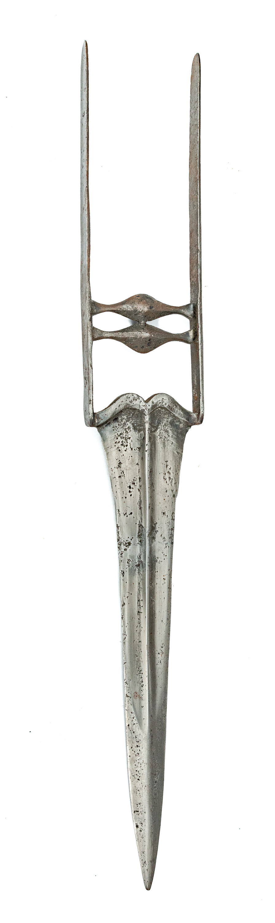 This 18th Century Katar is one of the oldest and most characteristic of the Indian hand-to-hand combat weapons. The handle sides were also used to block attacks. Because of the nature of the weapon, attacks were mainly direct thrusts that would easily pierce the enemies’ armor with a single but strong blow, possible because of the light weight and amazing attack speeds that could be achieved. The use of poisons was another deadly way of increasing the Katara’s effectivity in battle. Katar’s ceased to be in common use in the 19th century. The handle is made up of two parallel bars connected by two cross pieces. The blade is double-edged and straight. Dimensions: 19″ Overall