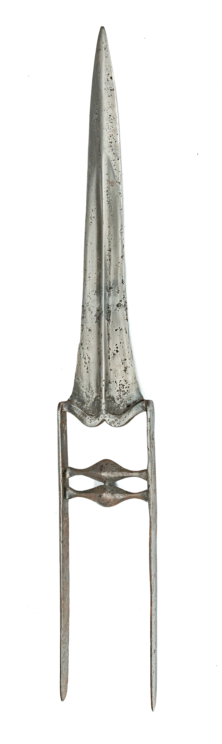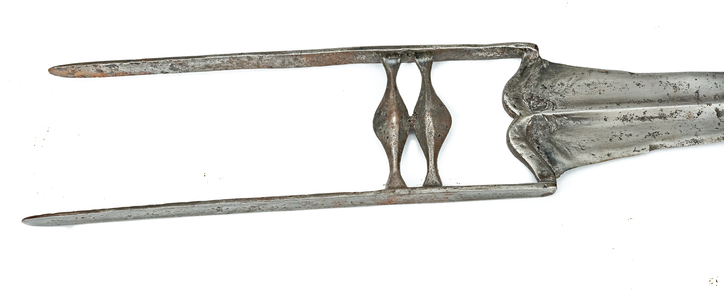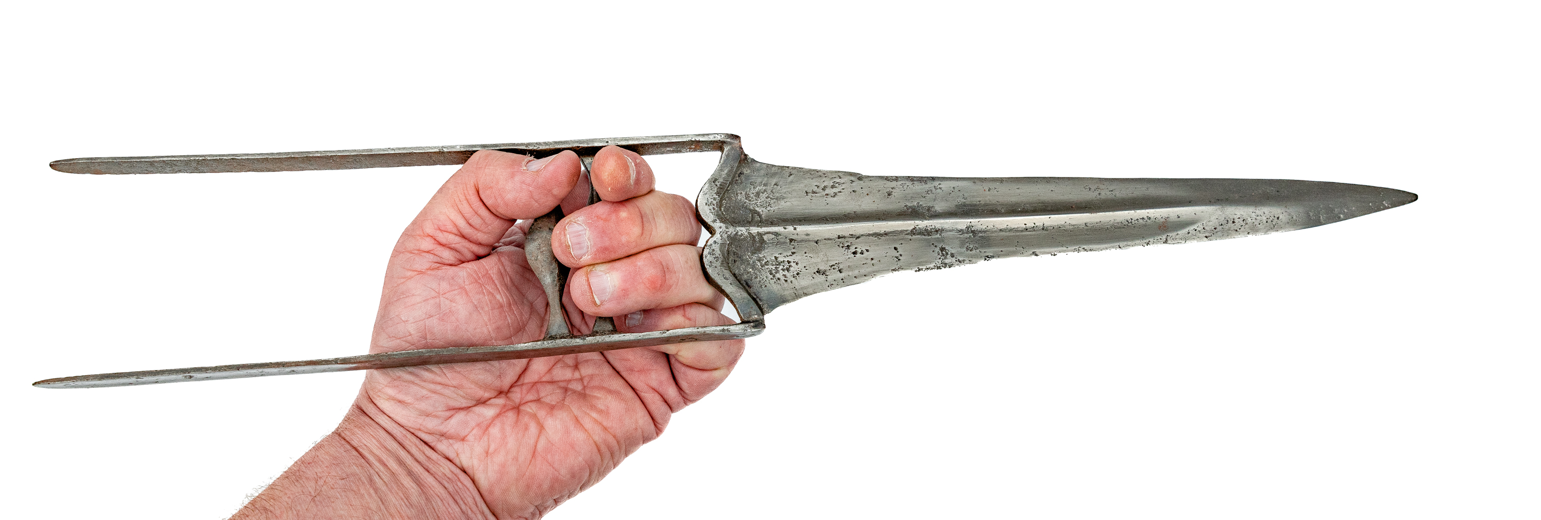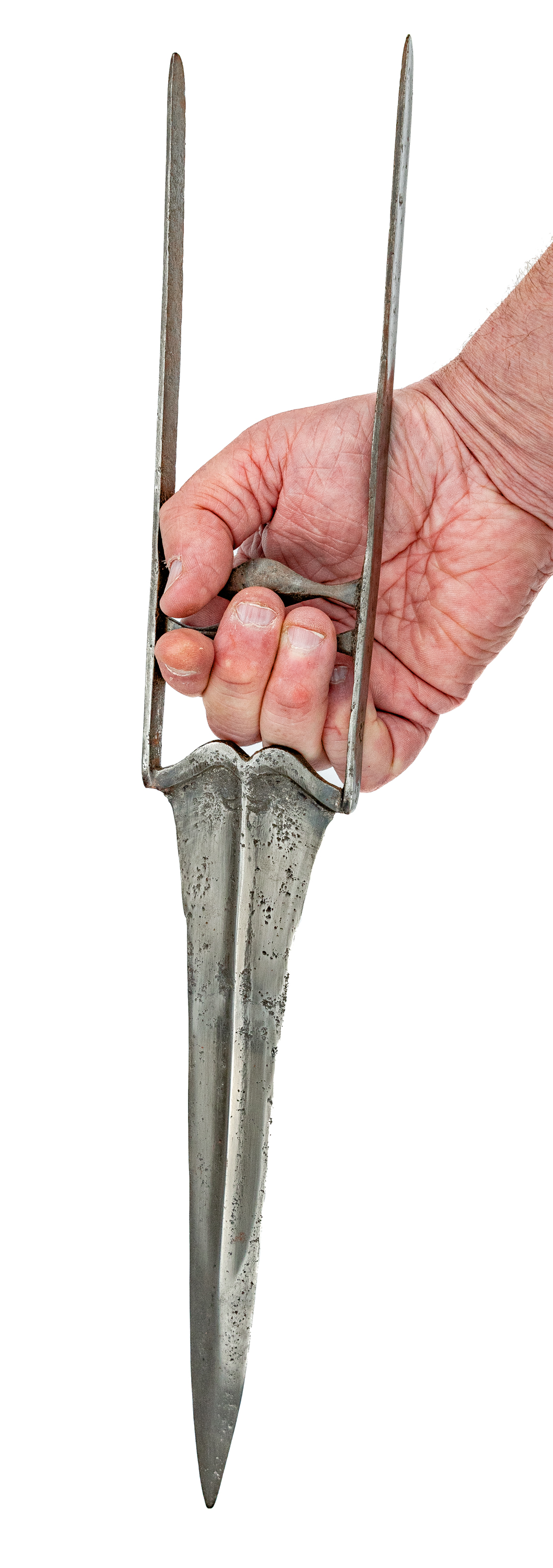 This 18th Century Katar is one of the oldest and most characteristic of the Indian hand-to-hand combat weapons. The handle sides were also used to block attacks. Because of the nature of the weapon, attacks were mainly direct thrusts that would easily pierce the enemies’ armor with a single but strong blow, possible because of the light weight and amazing attack speeds that could be achieved. The use of poisons was another deadly way of increasing the Katara’s effectivity in battle. Katar’s ceased to be in common use in the 19th century. The handle is made up of two parallel bars connected by two cross pieces. The blade is double-edged and straight. Dimensions: 19″ Overall