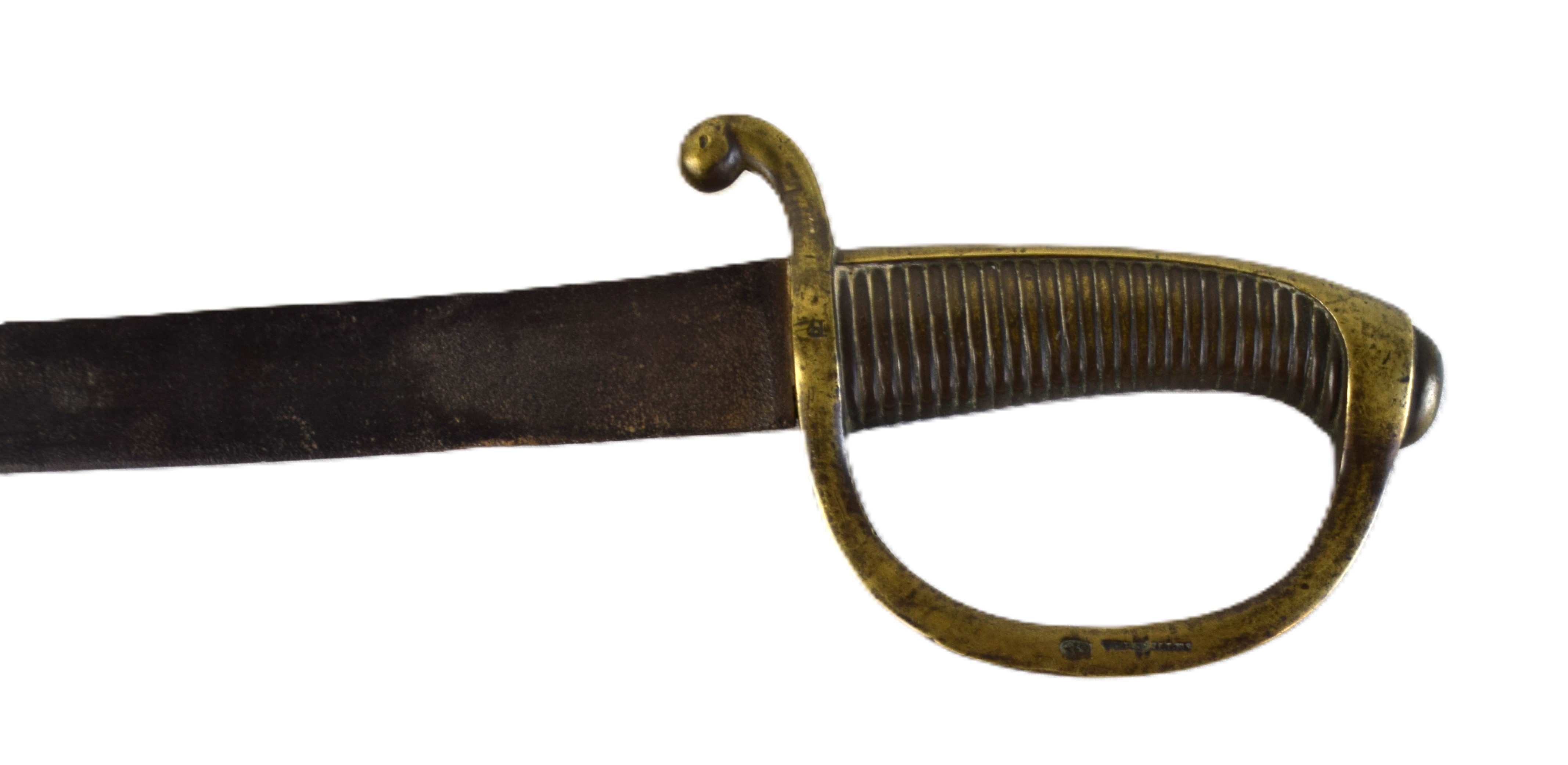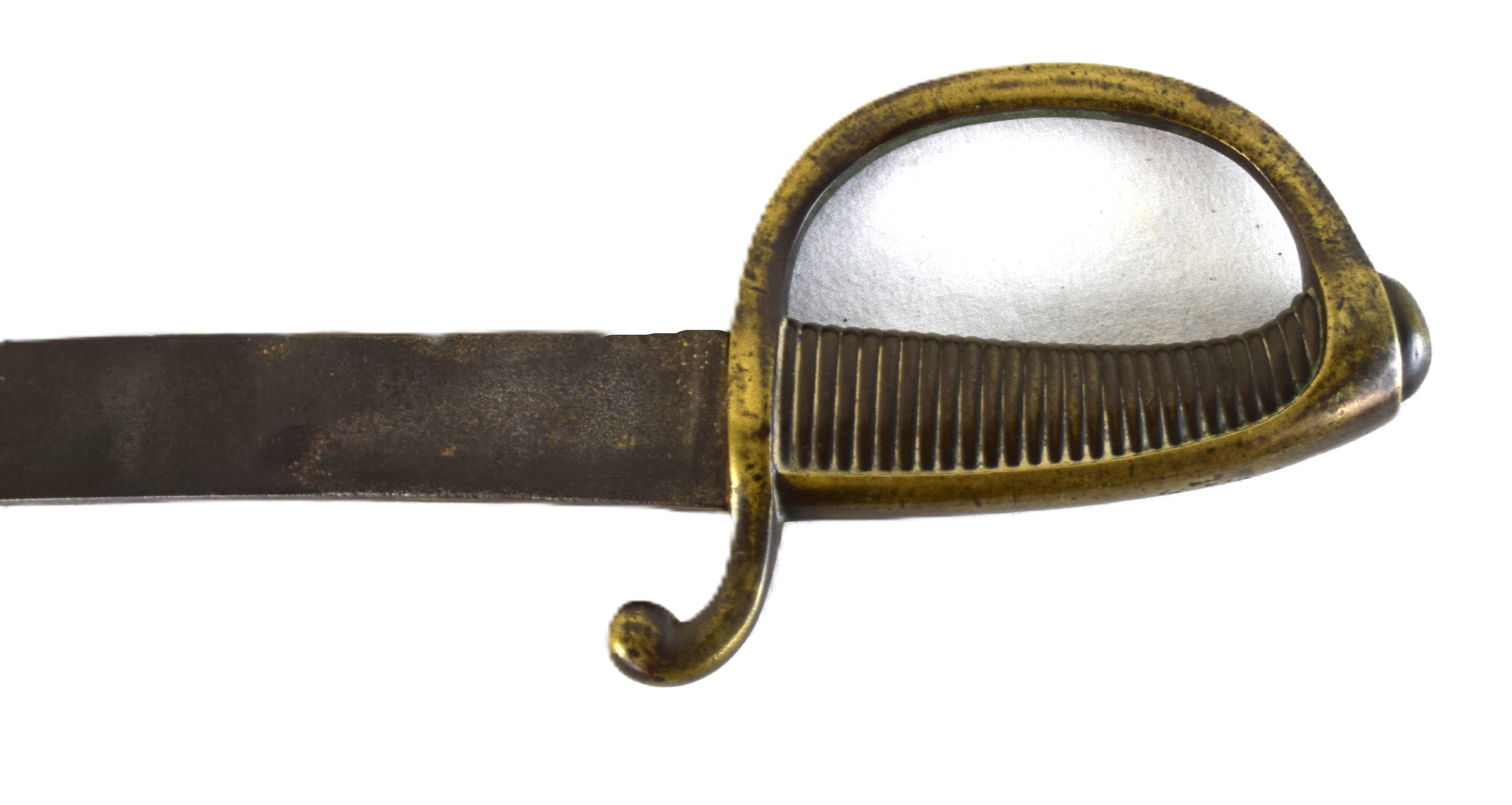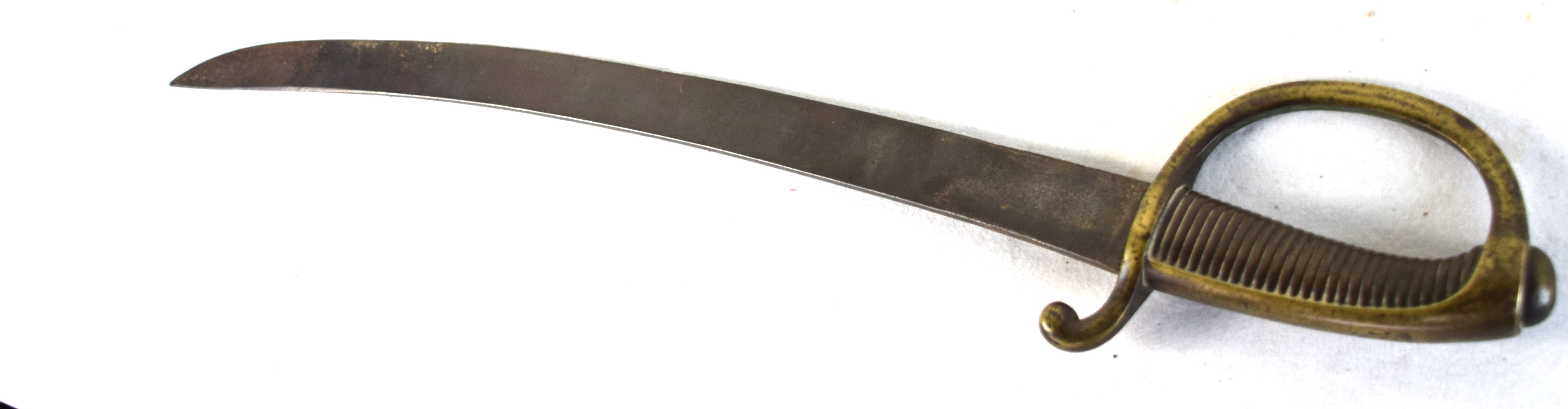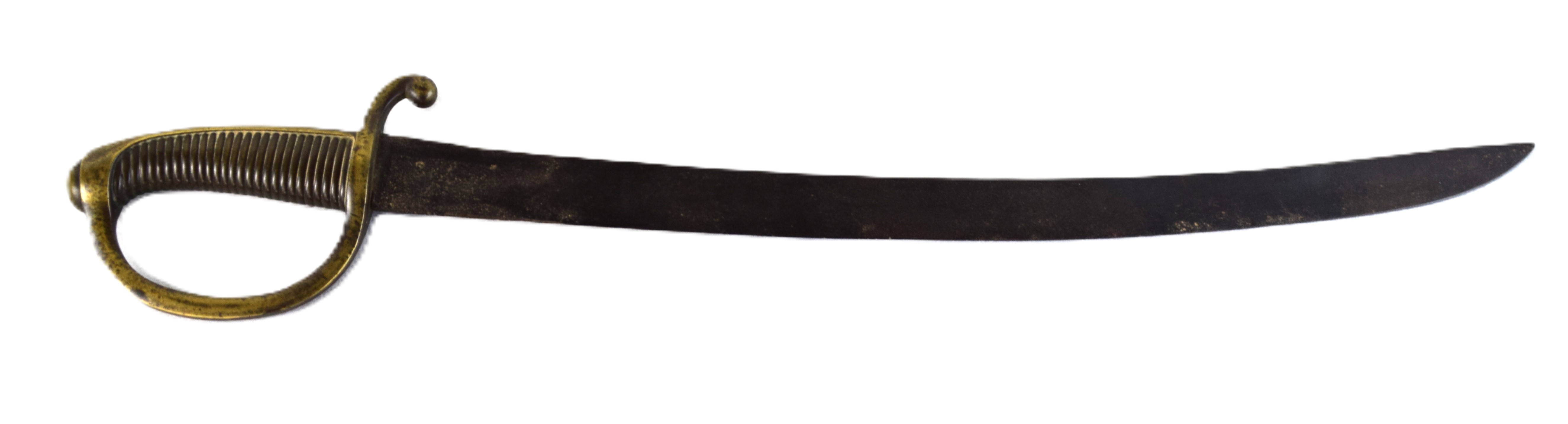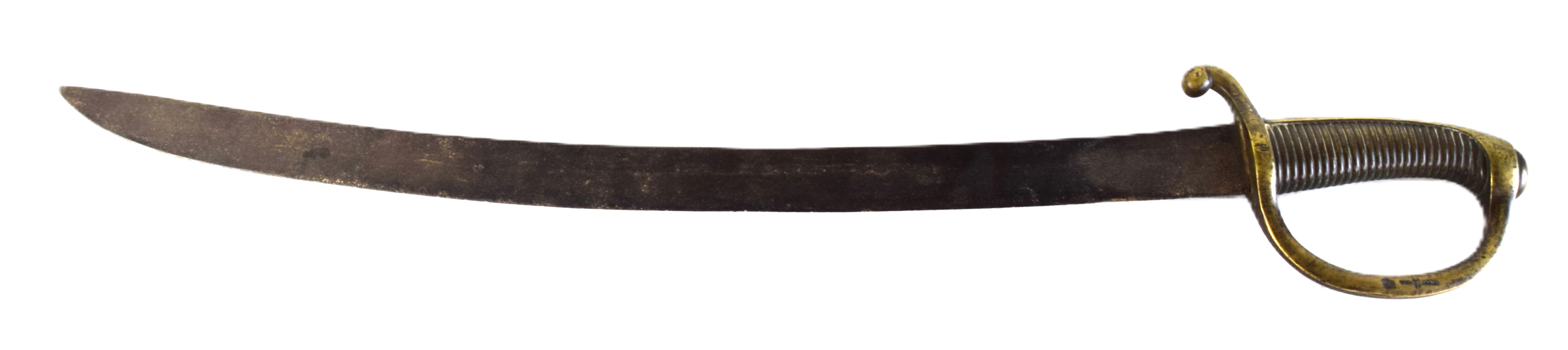 The is a French Army AnX1 Briquet saber, circa 1810-30. Compact, sturdy, and unmistakable with its ribbed brass grip, the French saber-briquet armed generations of infantry and artillery Officers and NCOs in the late eighteenth and early nineteenth centuries. Standardized under the Revolutionary and Napoleonic regimes, it offered a reliable sidearm for close quarters. The weapon’s nickname, “briquet”, likely played on its small size and the French word for a fire lighter. Dimensions: 23″ Blade, 29″ Overall