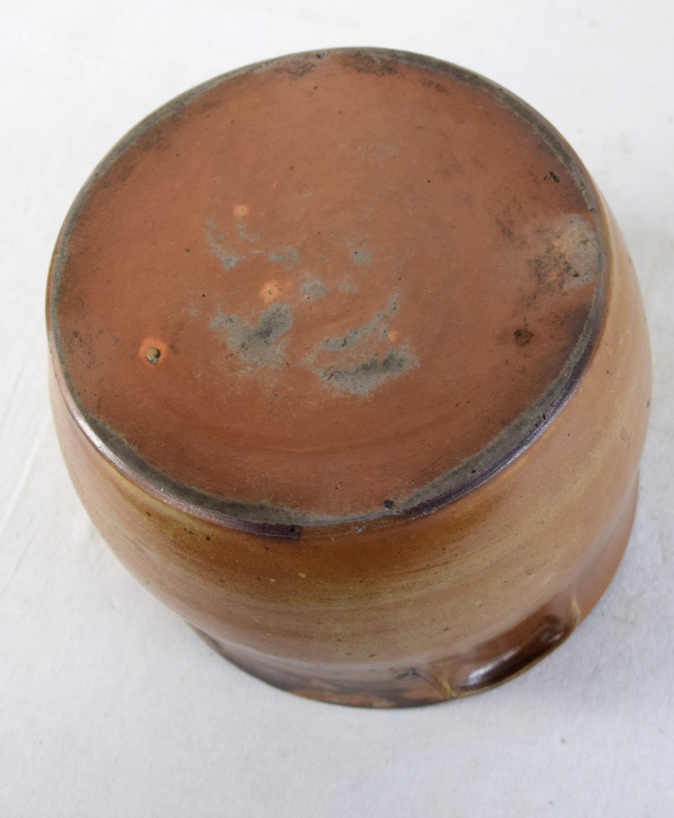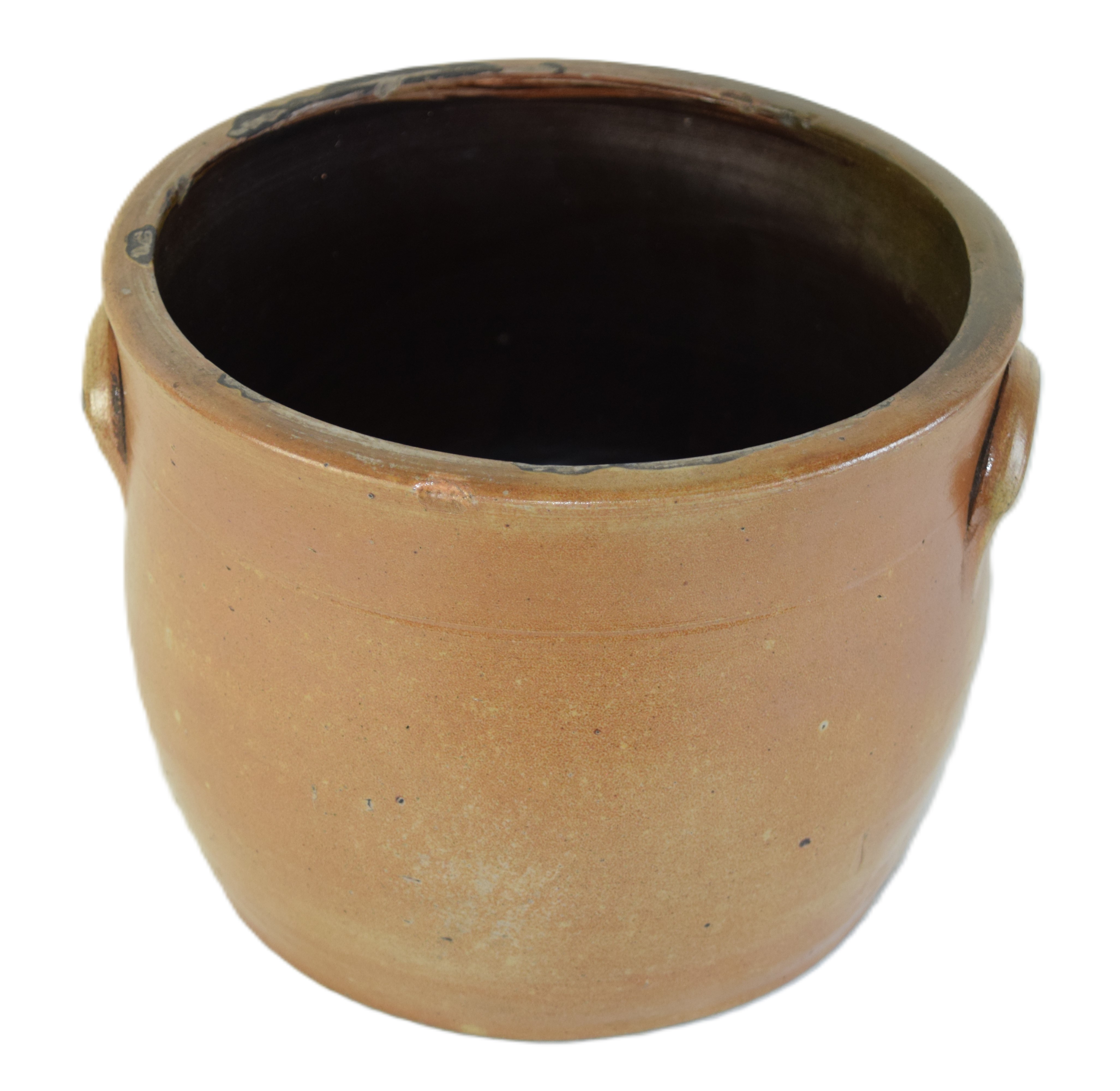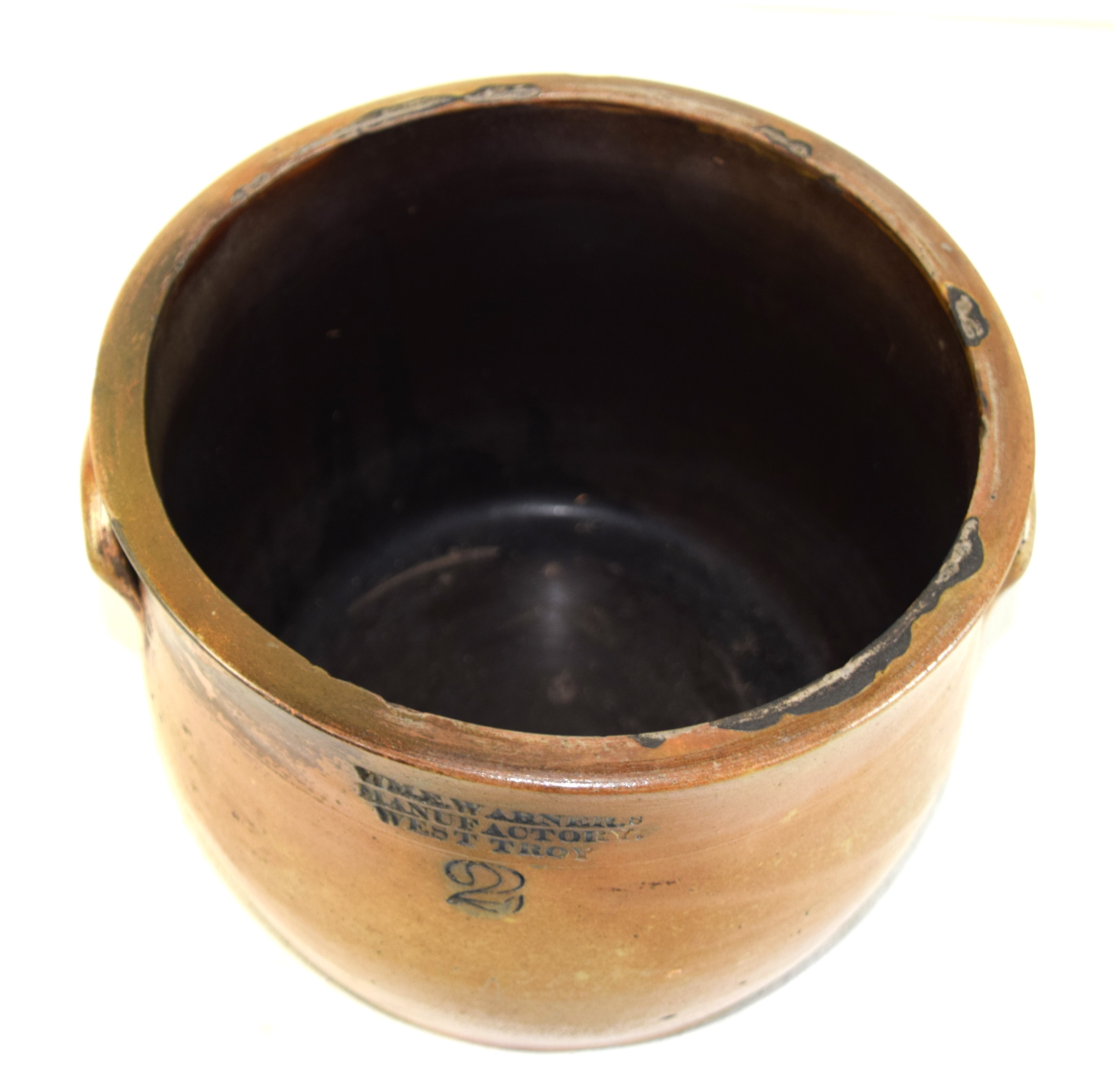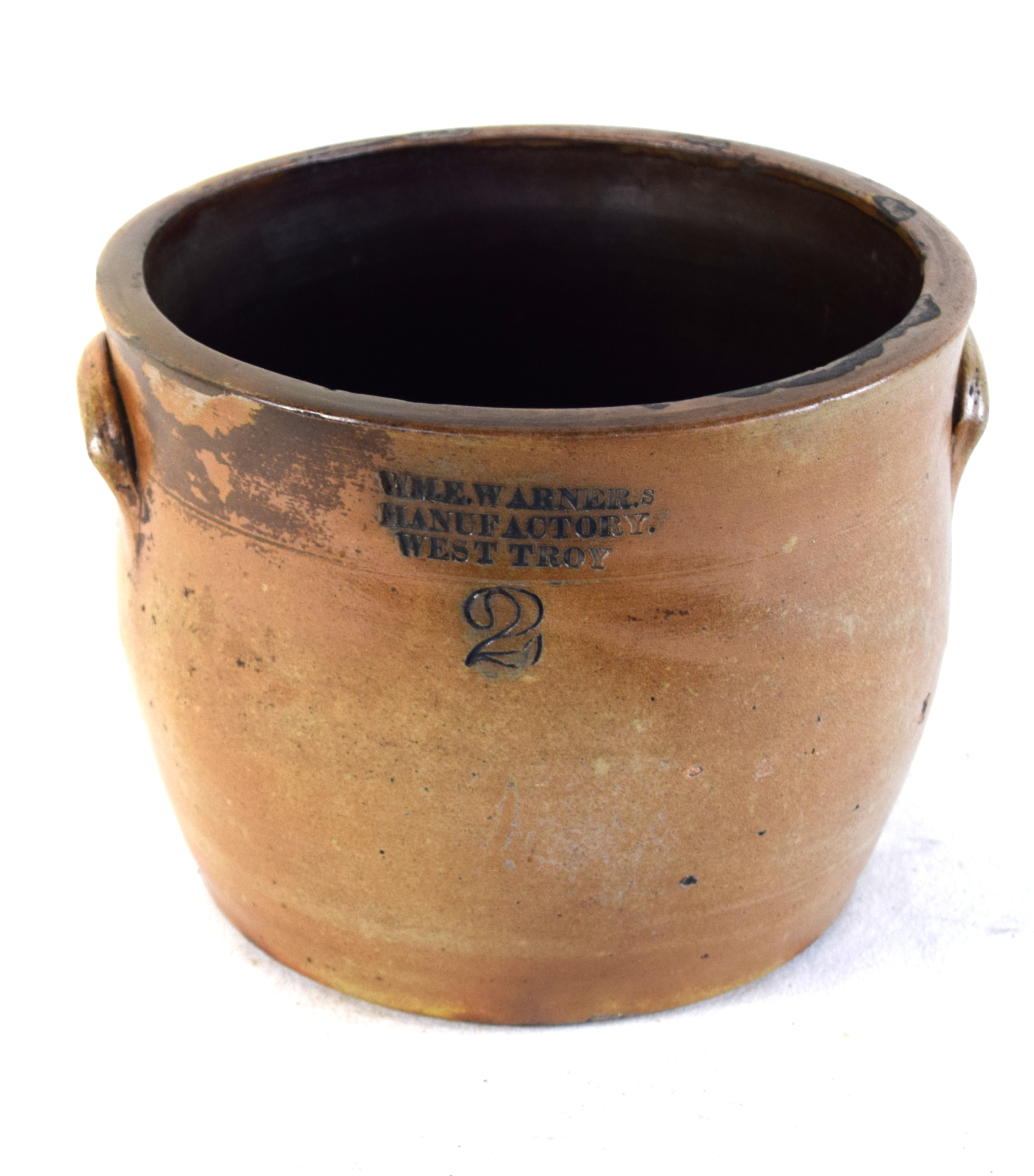 Stoneware 2 gallon crock with inscription” WME. Warner Manufacturing, West Troy” with double handles. Dimensions: 8″ H x 10″ Dia