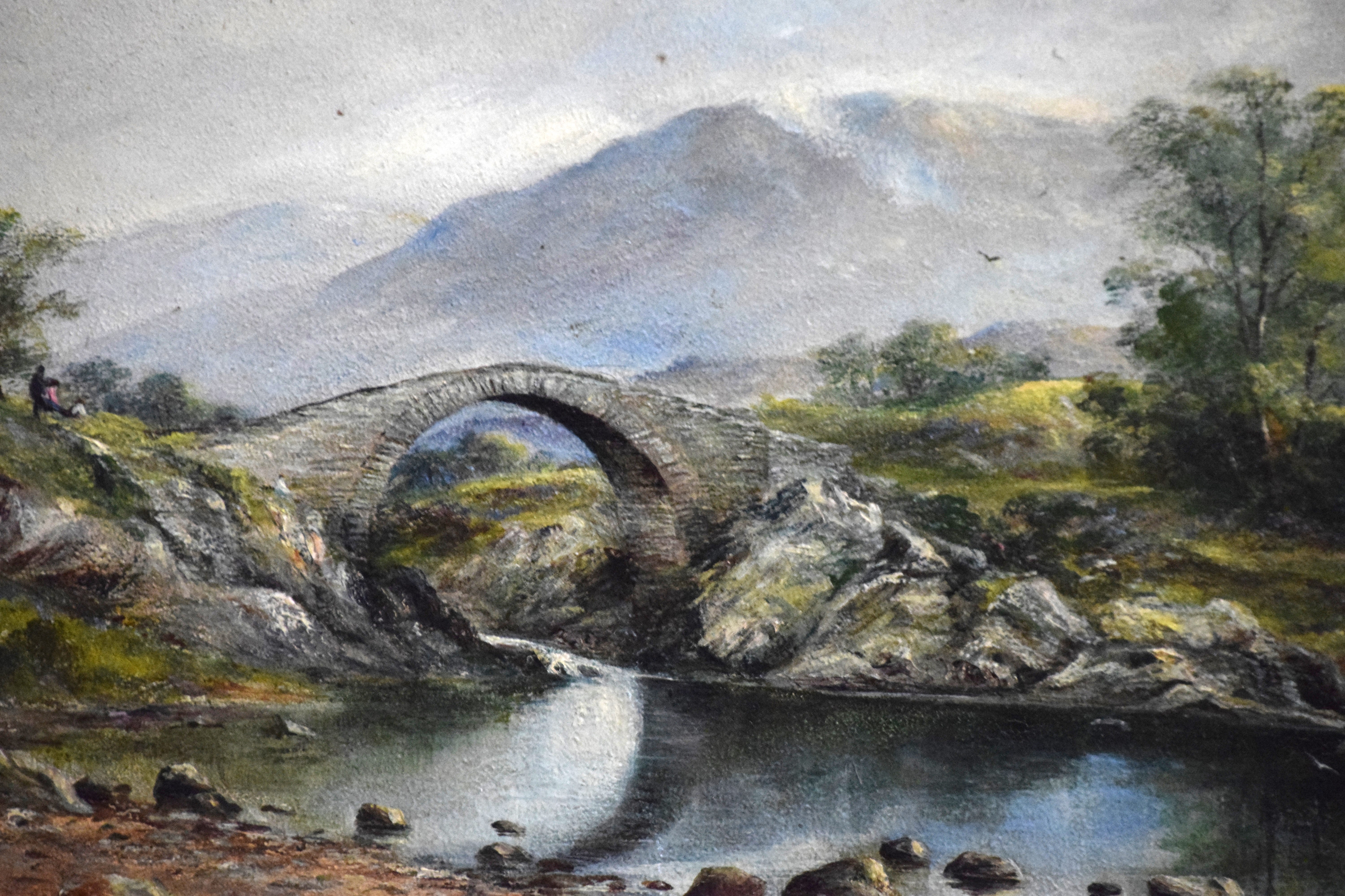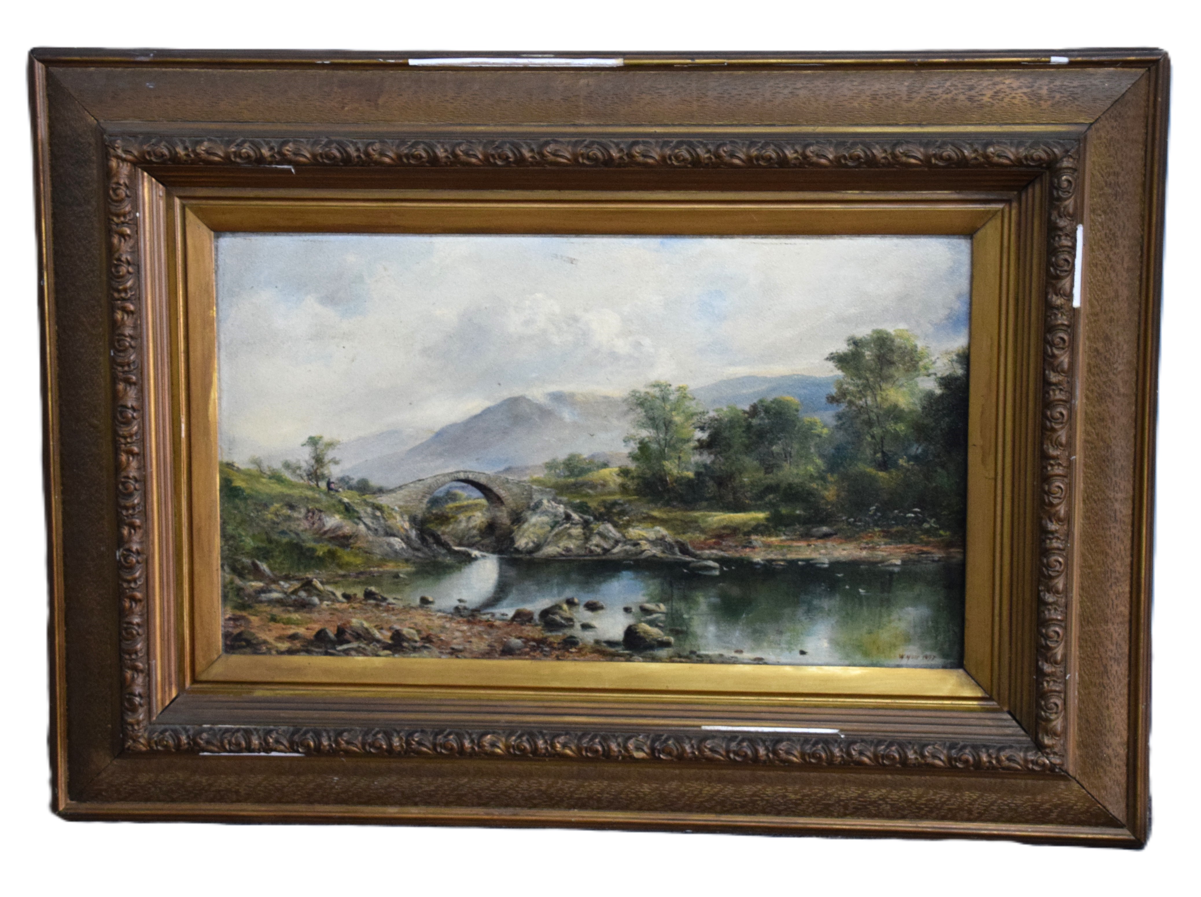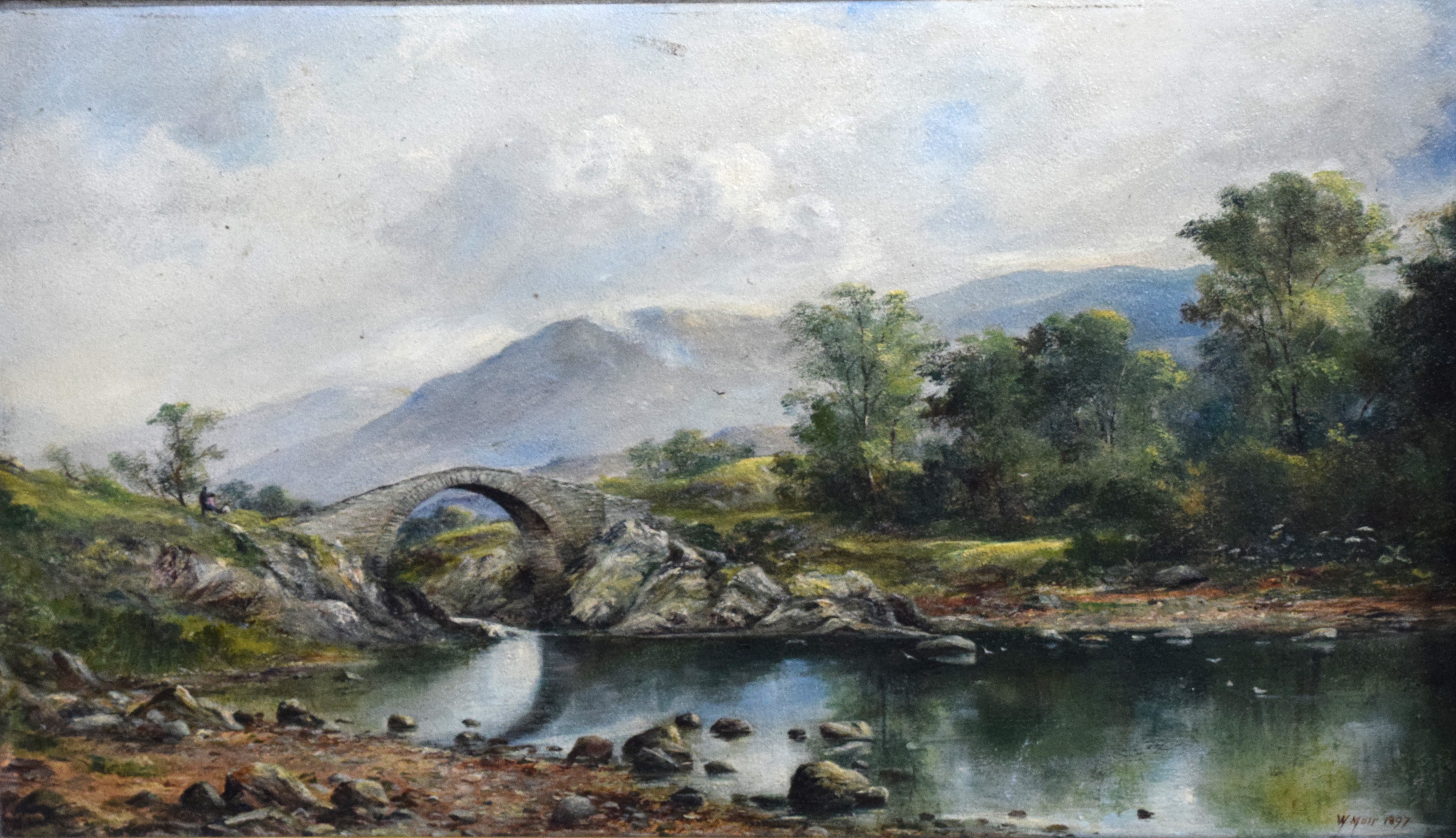 Framed oil on tin landscape with a stone arch bridge over a stream with mountains in the background and several trees. Signed lower right, W. Muir, 1897, labels on back. William Temple Muir (1856-1907) known for English landscape and seascape paintings. Dimensions: 14″ x 23.5″ Image size, 26″ x 35″ Overall