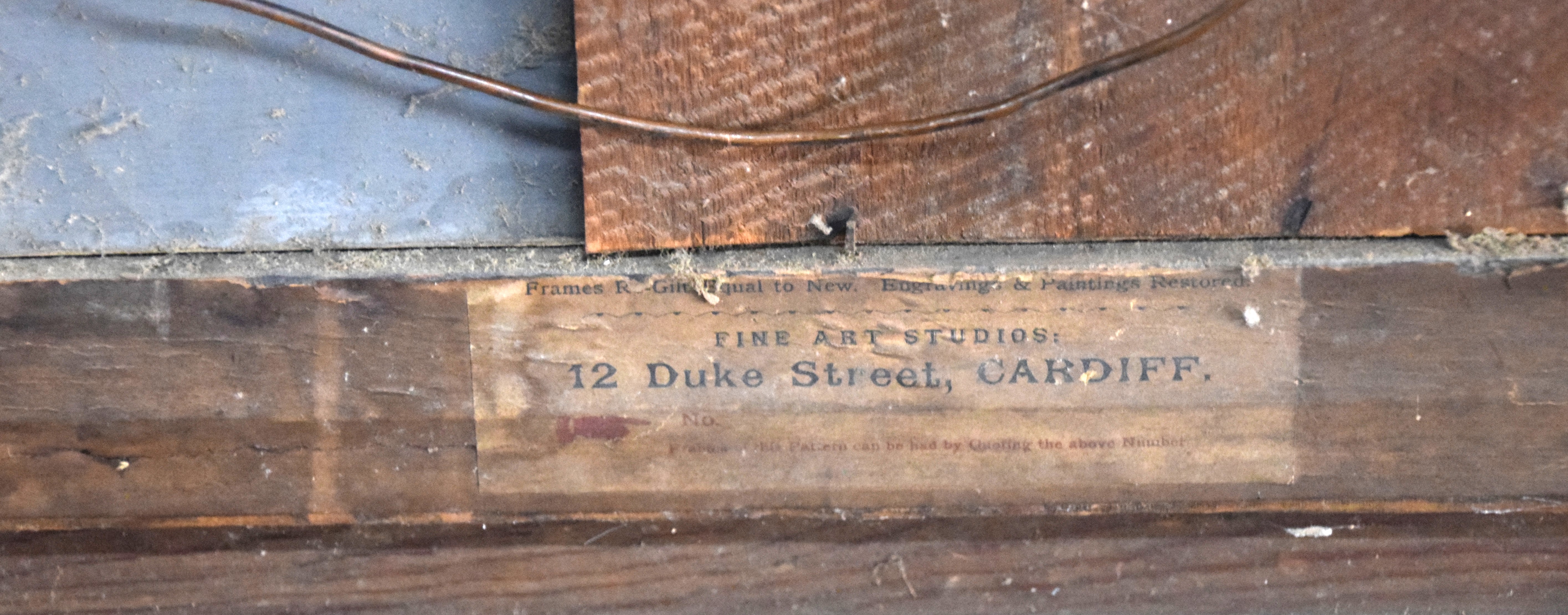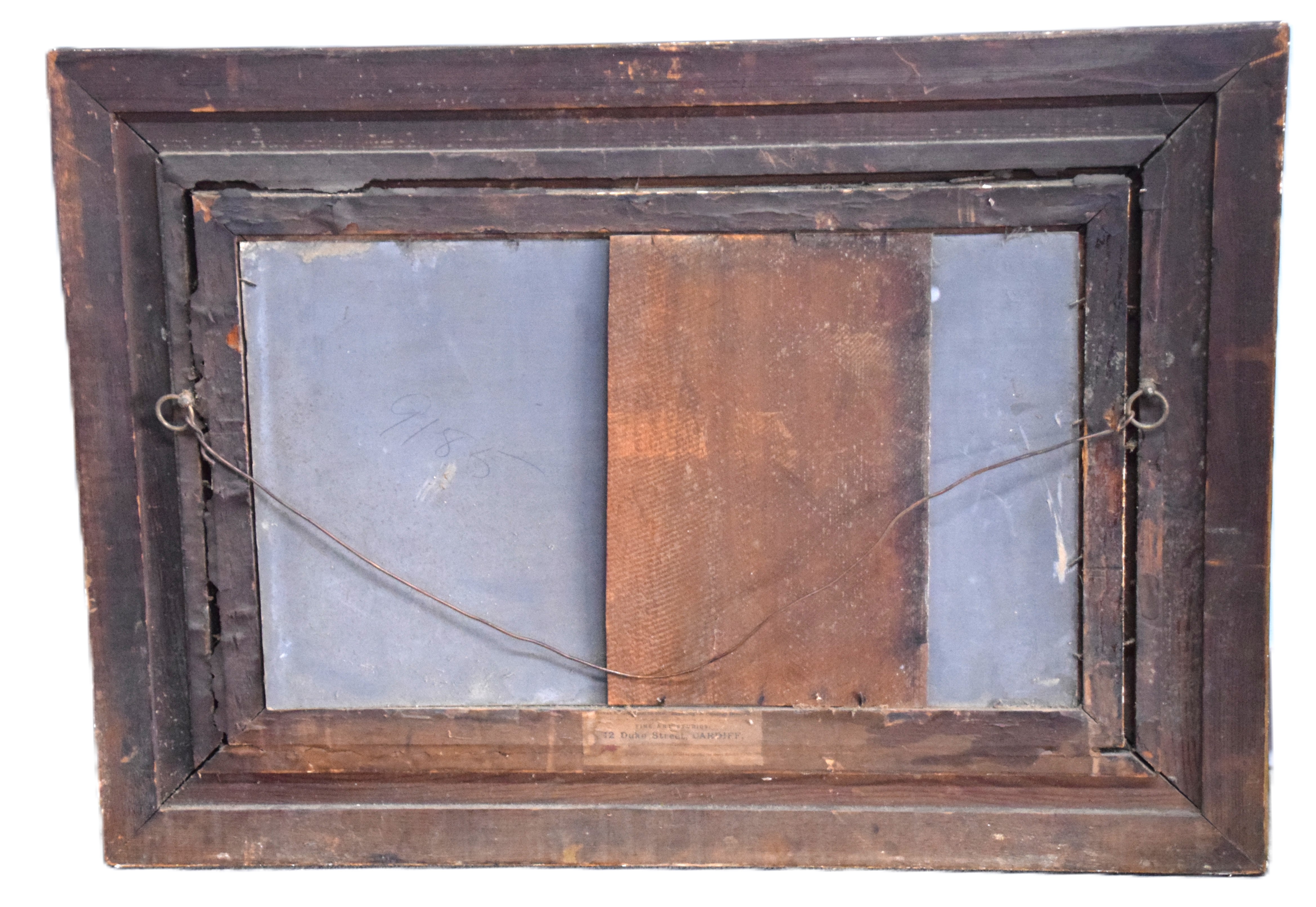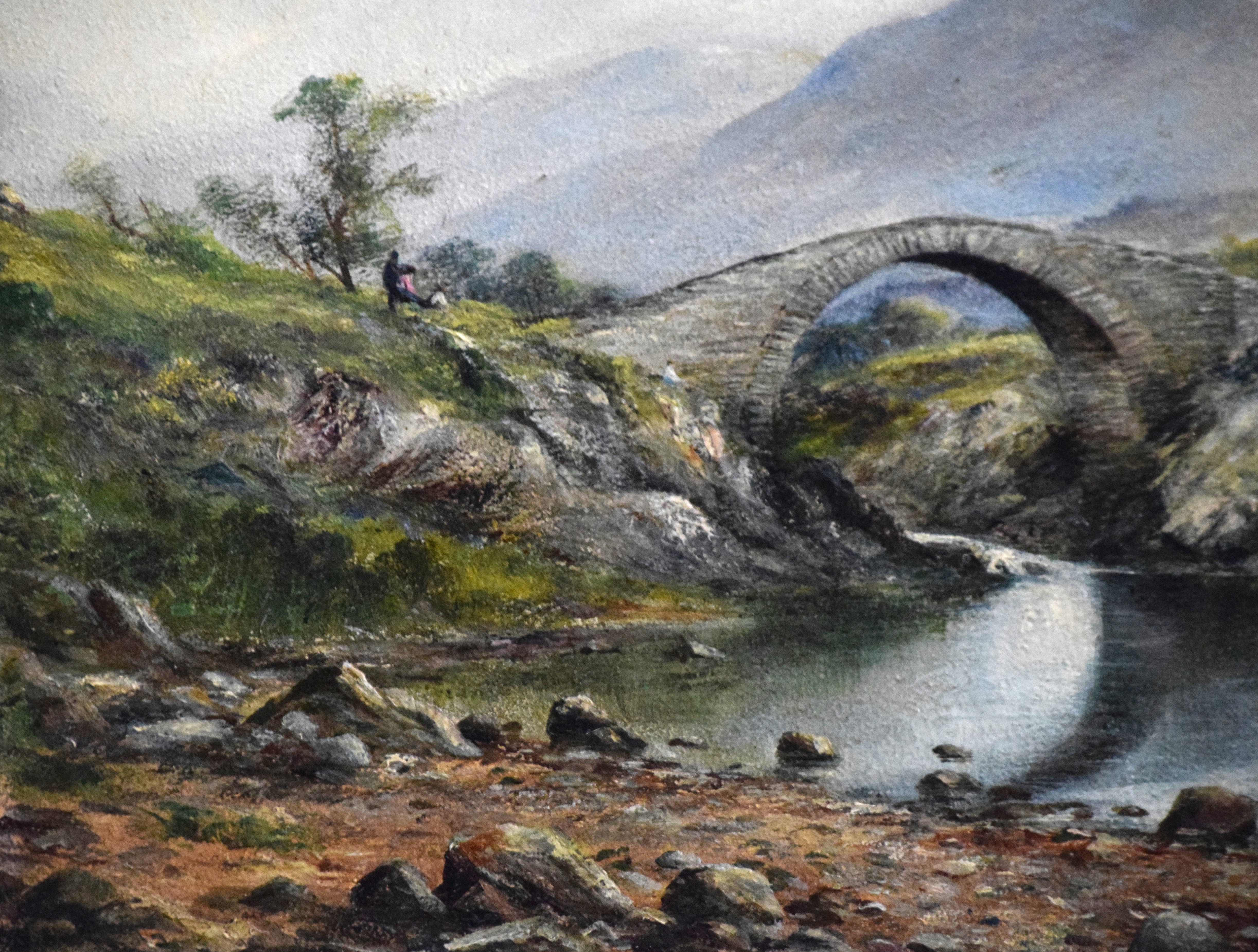 Framed oil on tin landscape with a stone arch bridge over a stream with mountains in the background and several trees. Signed lower right, W. Muir, 1897, labels on back. William Temple Muir (1856-1907) known for English landscape and seascape paintings. Dimensions: 14″ x 23.5″ Image size, 26″ x 35″ Overall