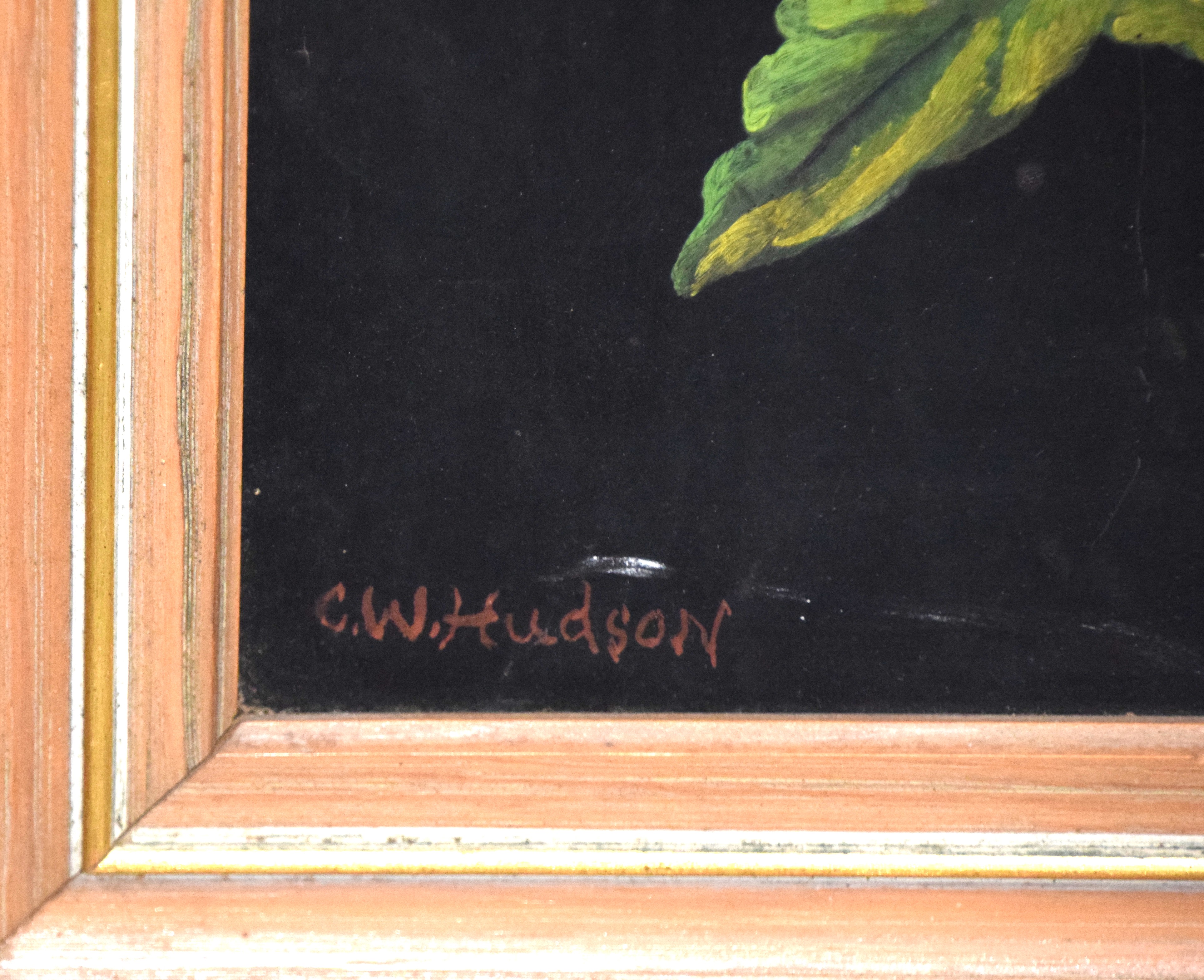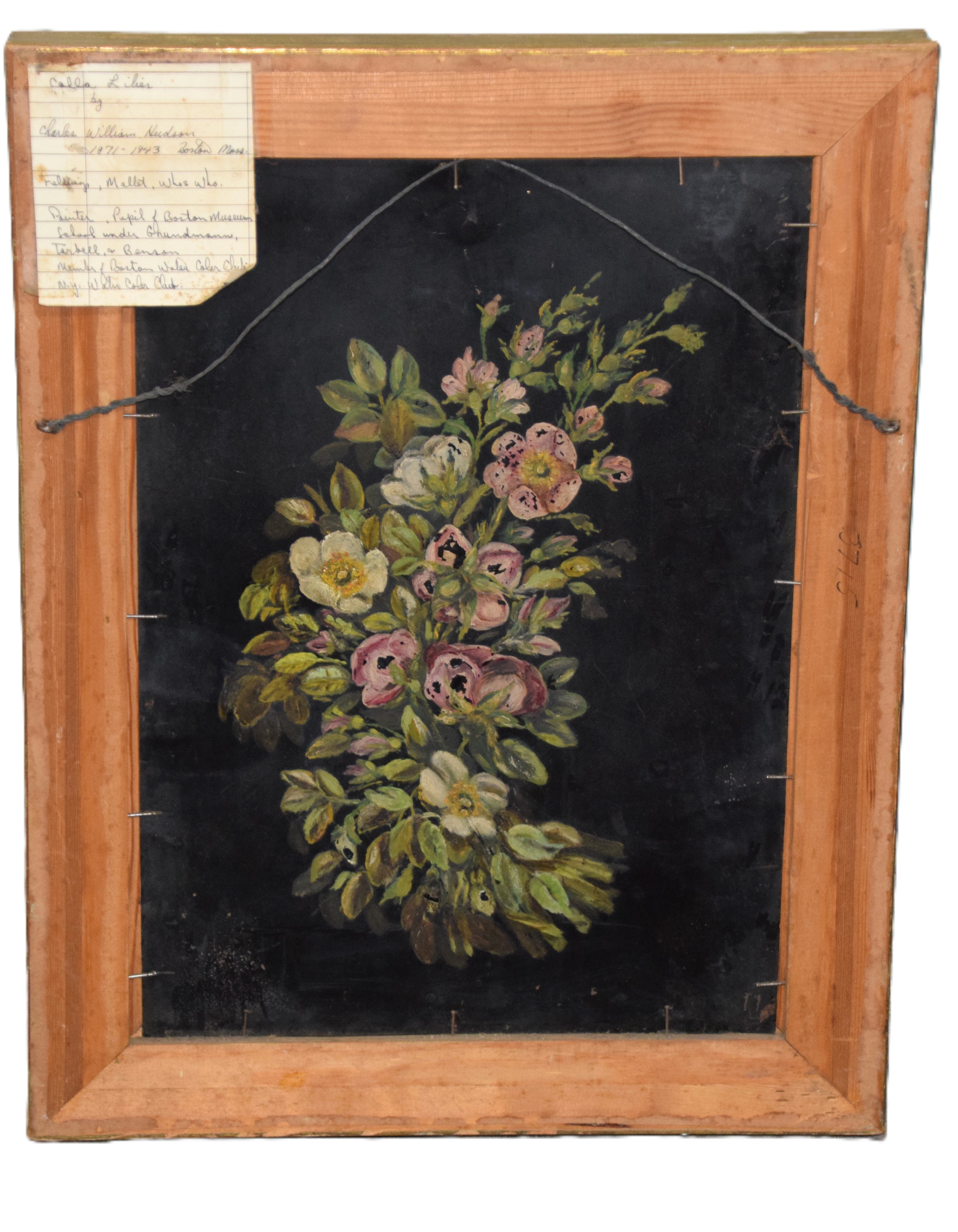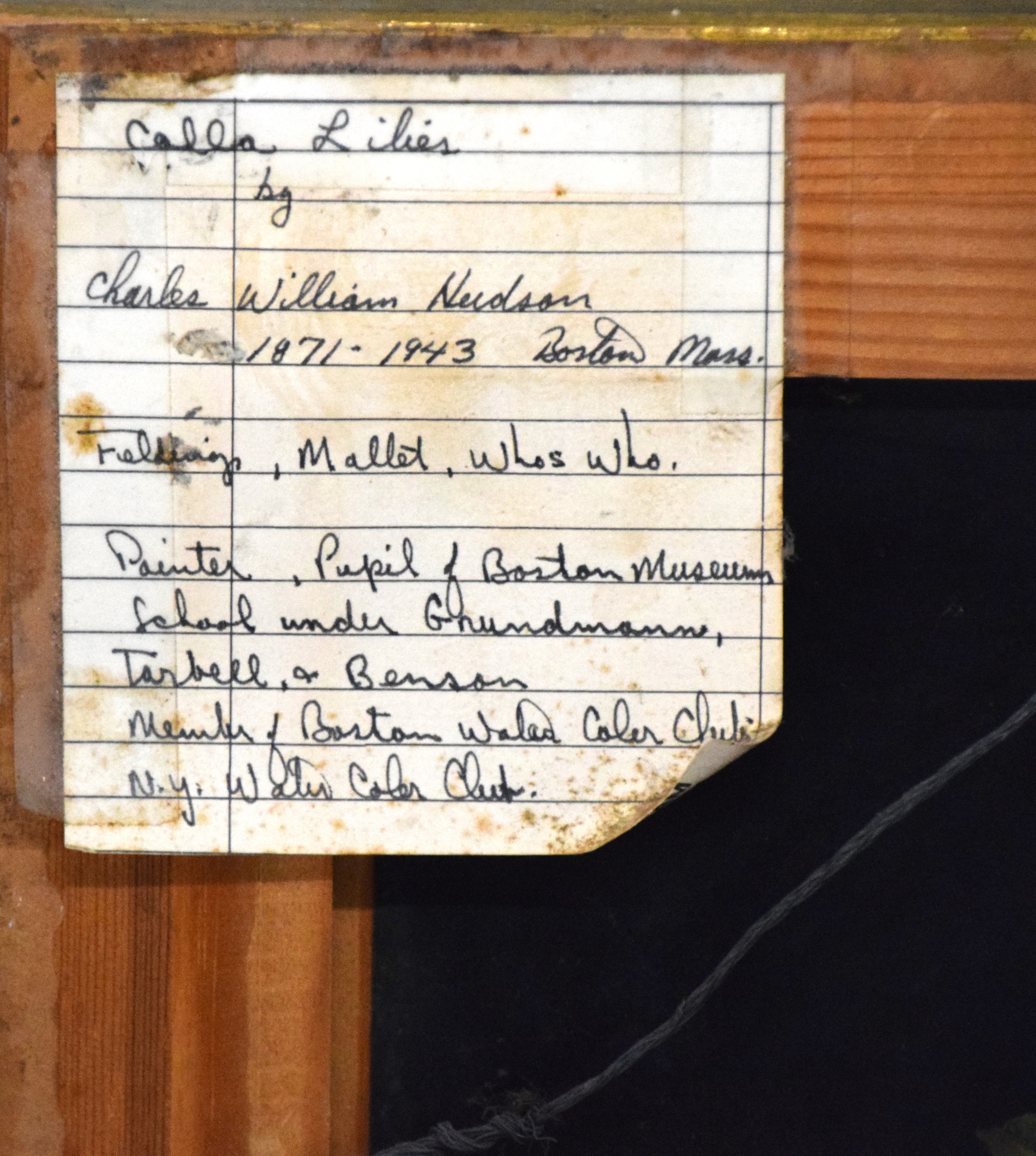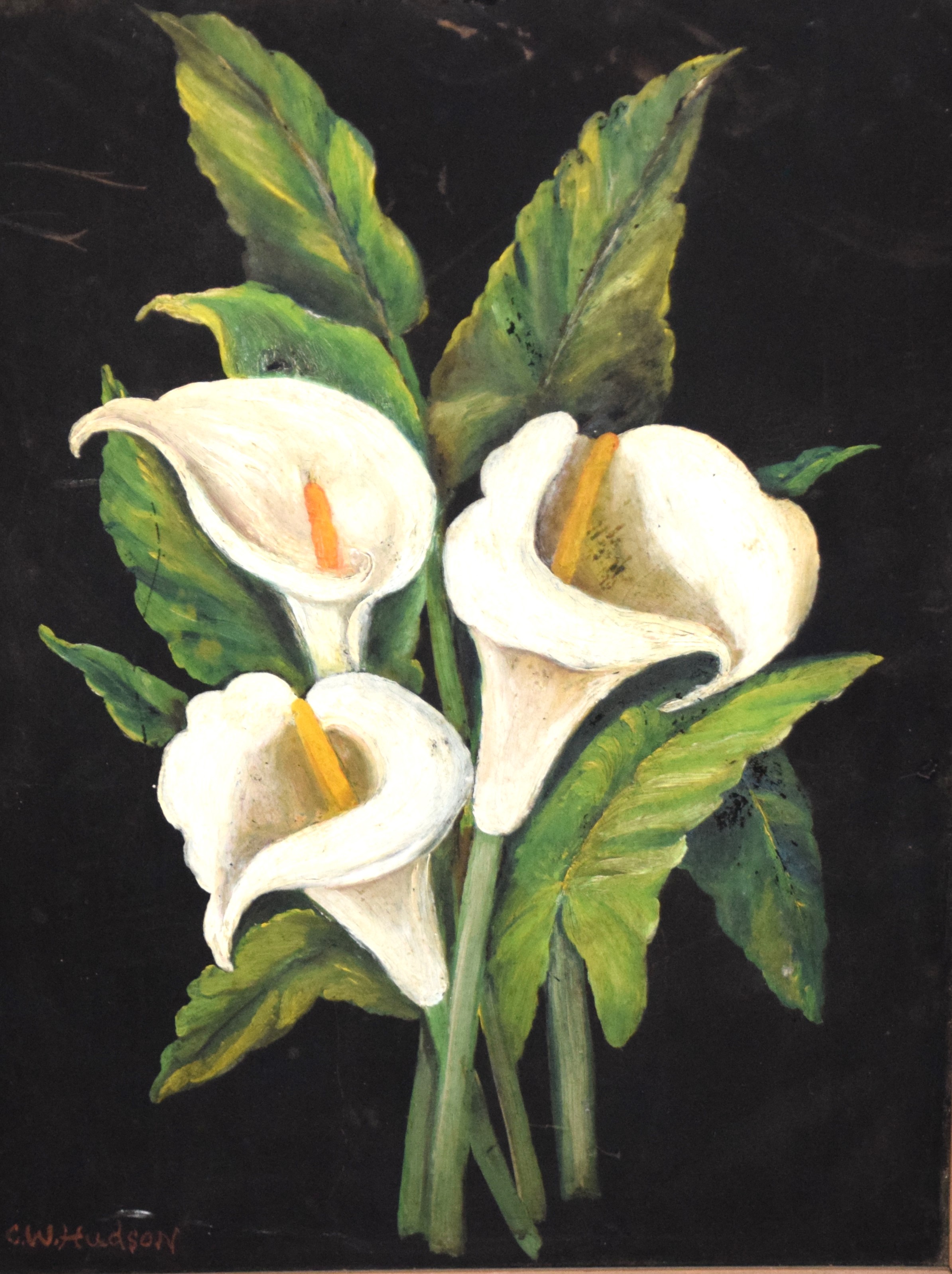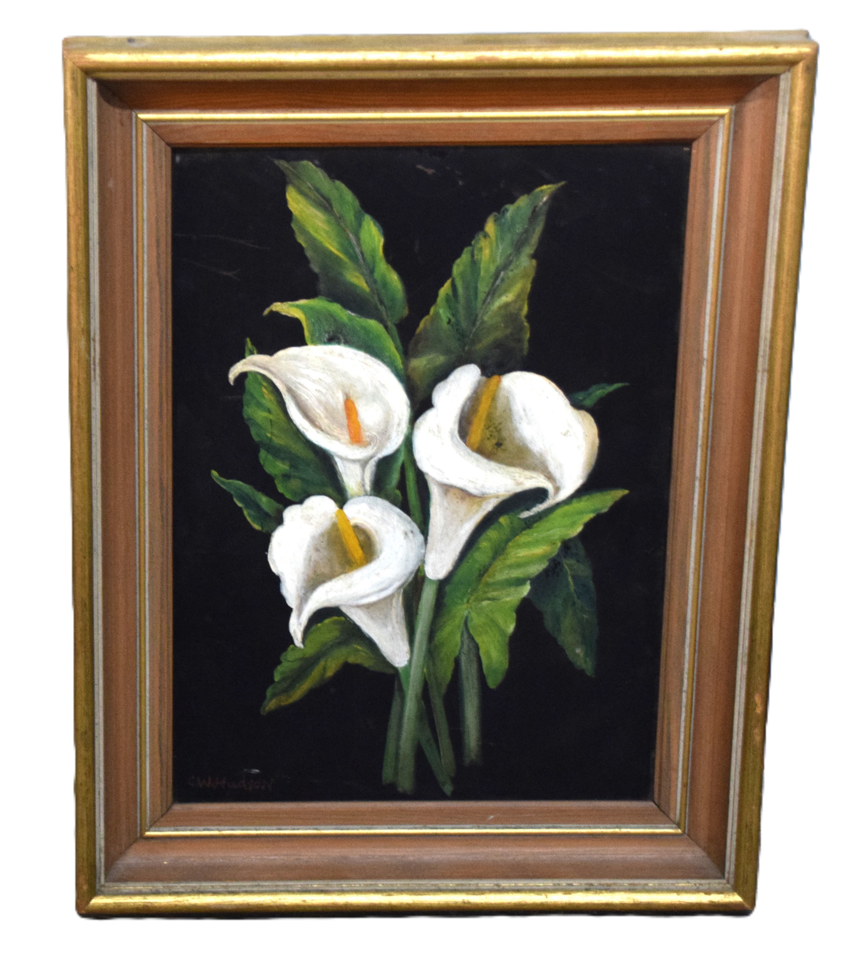 Still life painting in a carved wooden frame of Lillies by Charles W Hudson (1871-1943),an American Landscape Artist who studied at the School of the Boston Museum of Fine Arts under the artists Emil Grundman, Edmund C Tarbell, and Frank W Benson. Artist information on reverse. Dimensions: 13.5″ x 9.5″ Image size