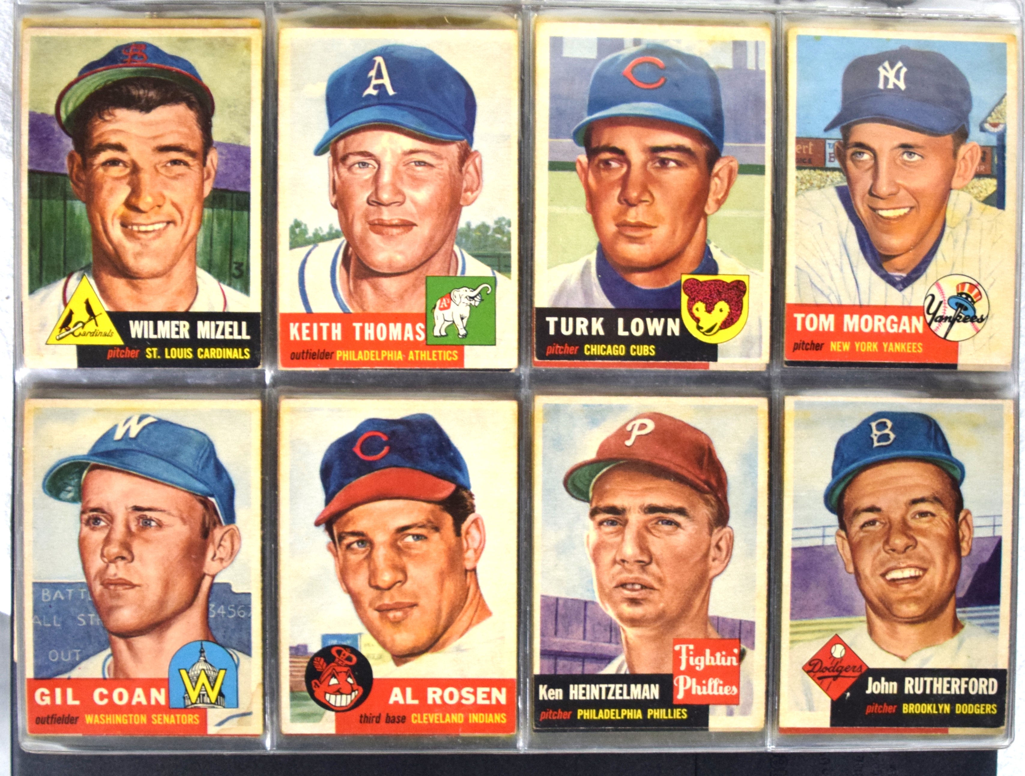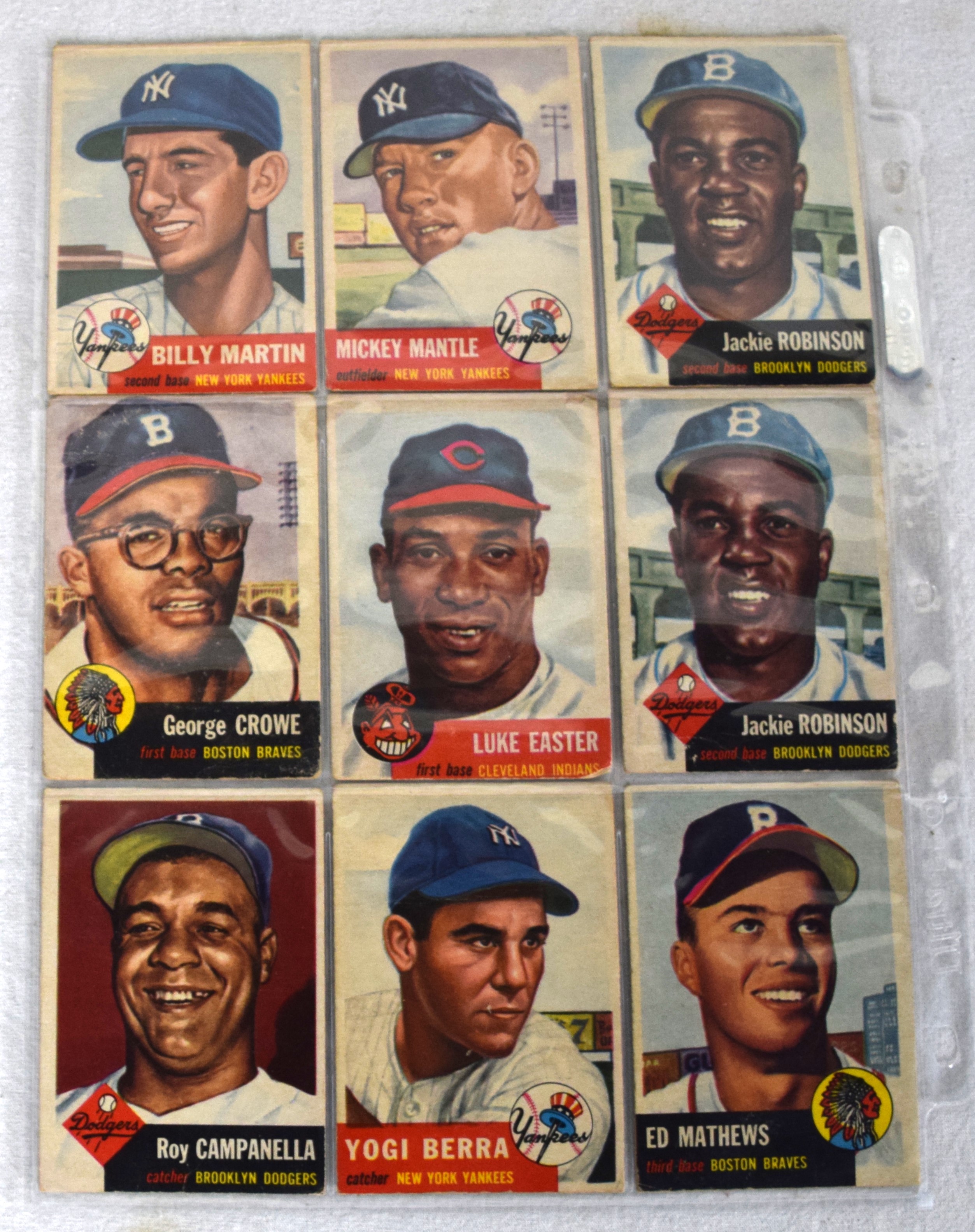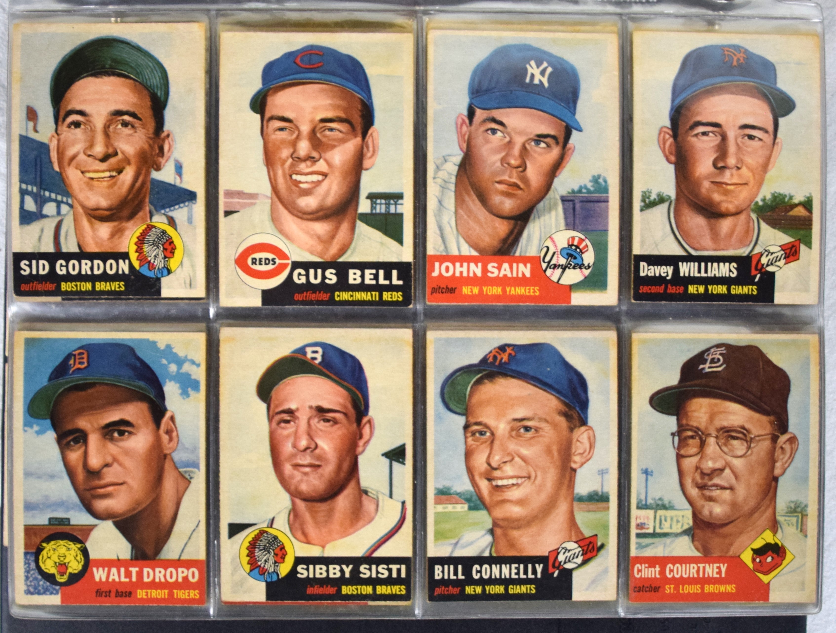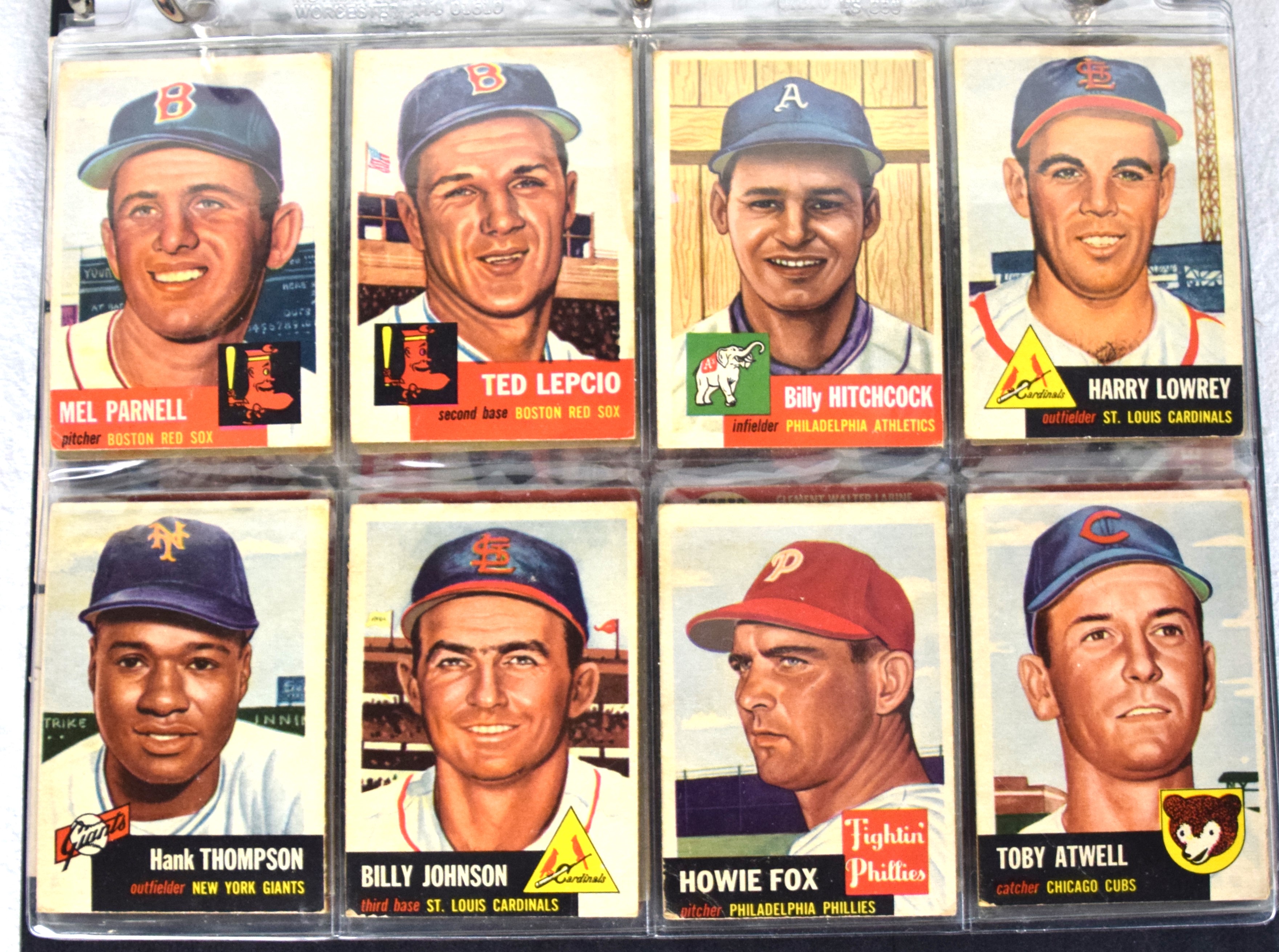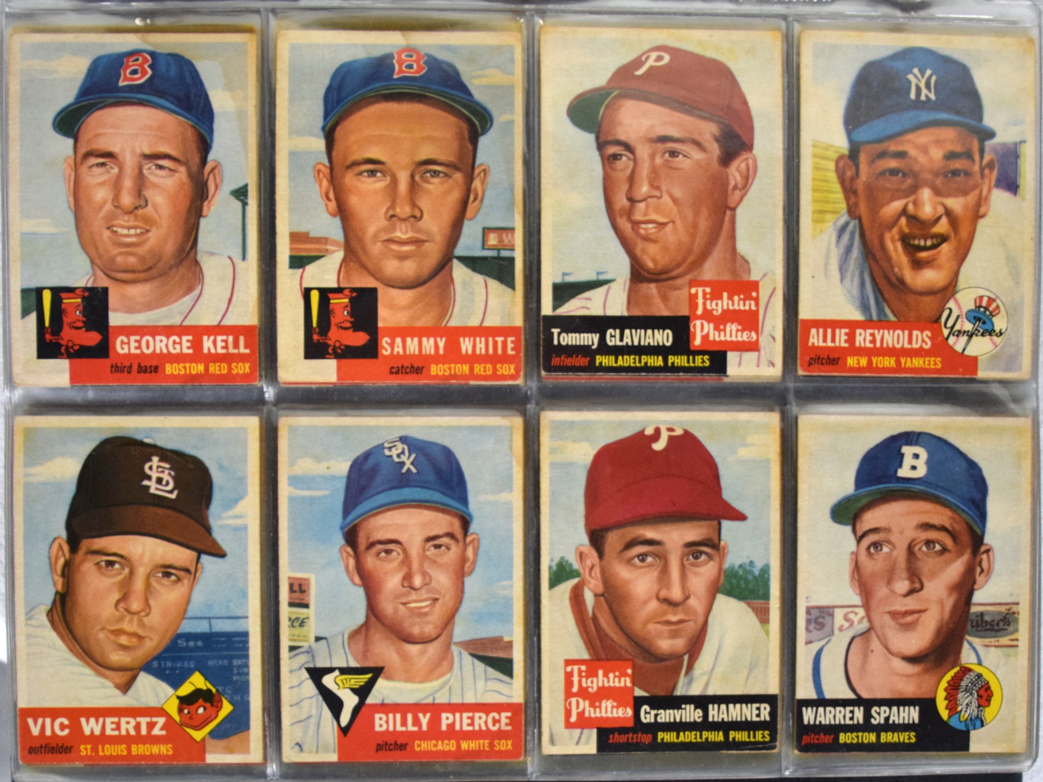 Approximately 140 Topps 1953 baseball cards including two Jackie Robinson (1), Mickey Mantle (82), Phil Rizzuto (114) and Waren Spahn (147).