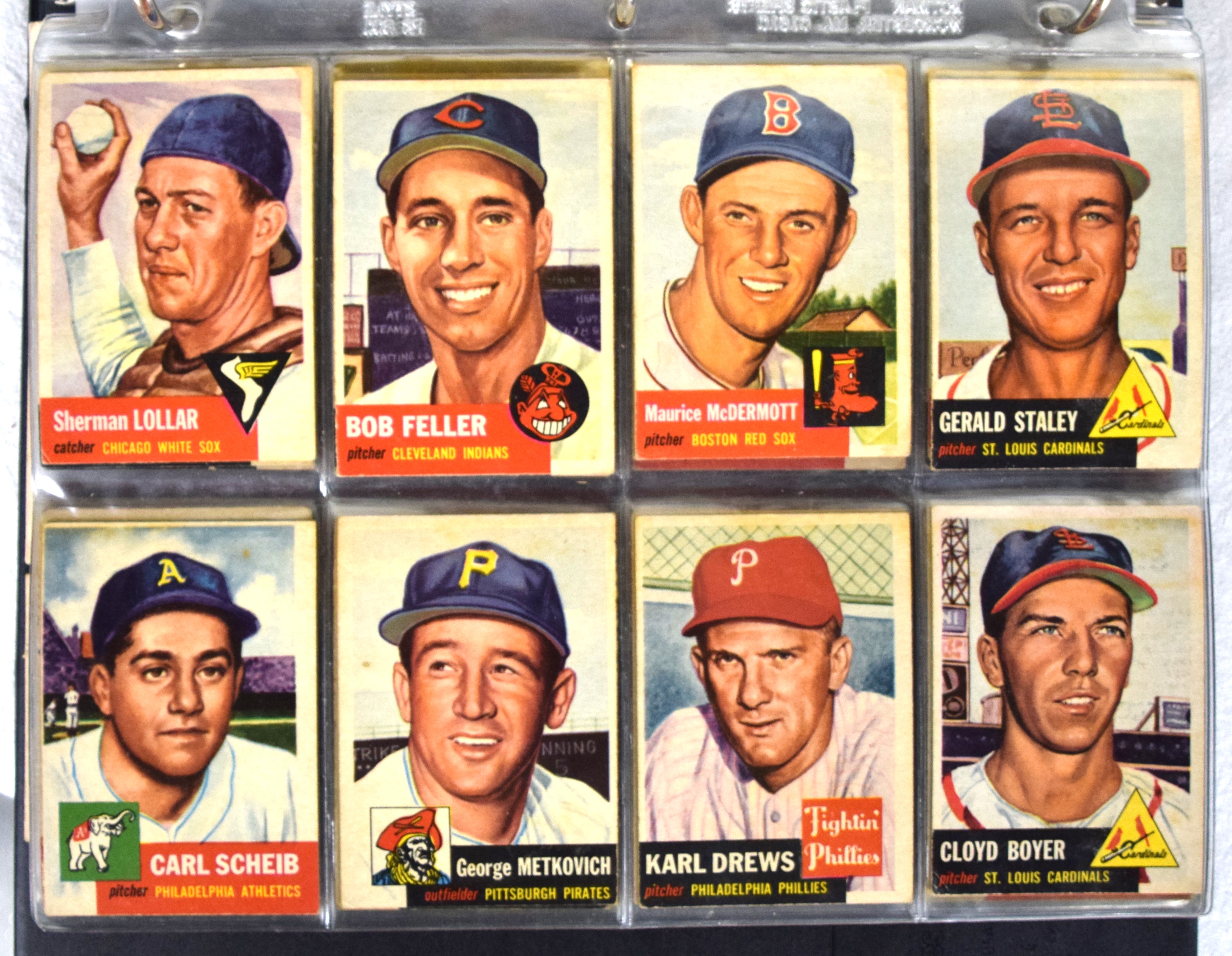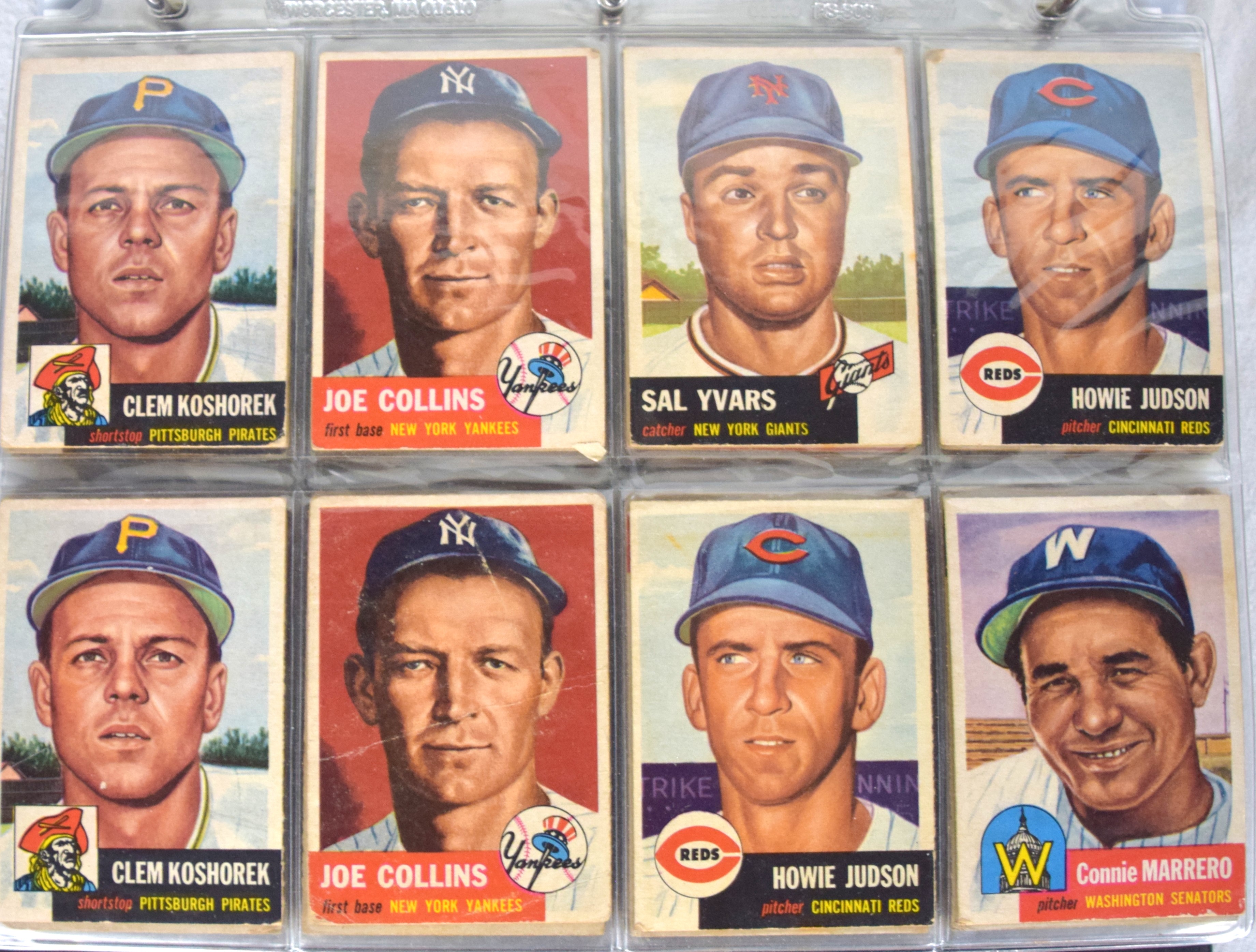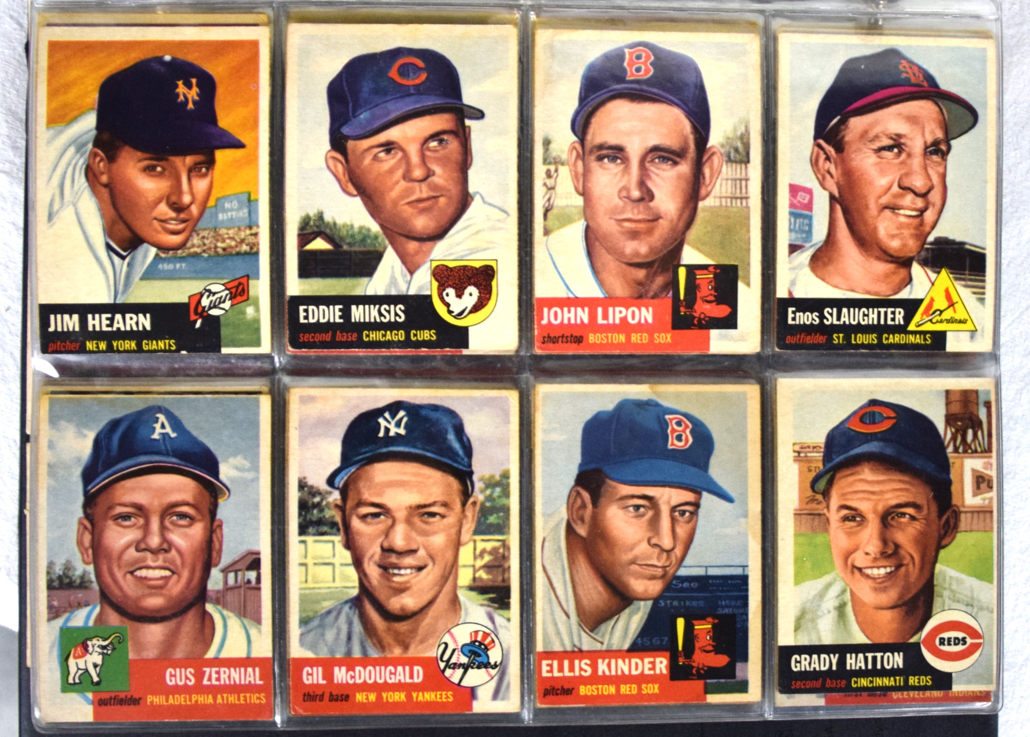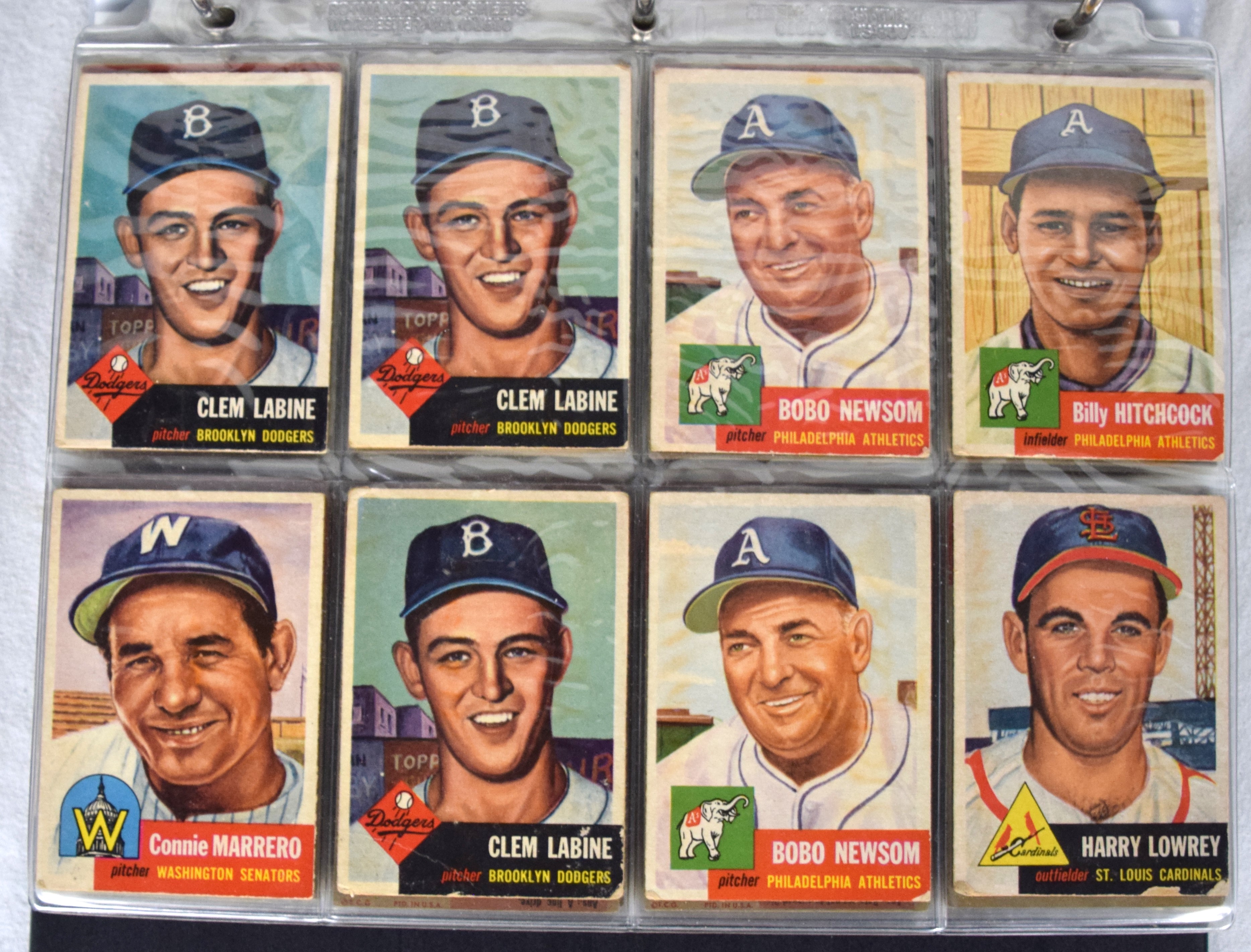 Approximately 140 Topps 1953 baseball cards including two Jackie Robinson (1), Mickey Mantle (82), Phil Rizzuto (114) and Waren Spahn (147).