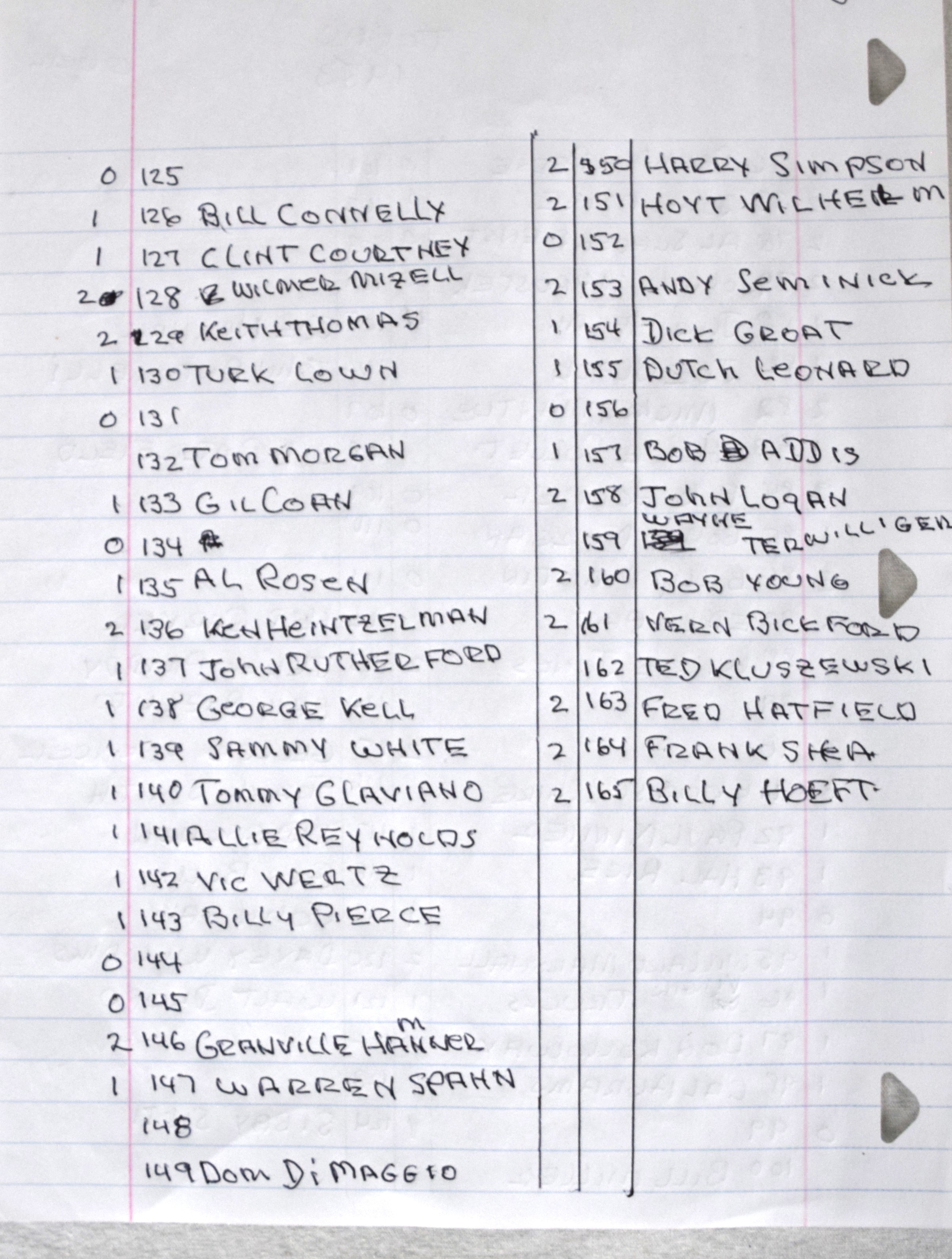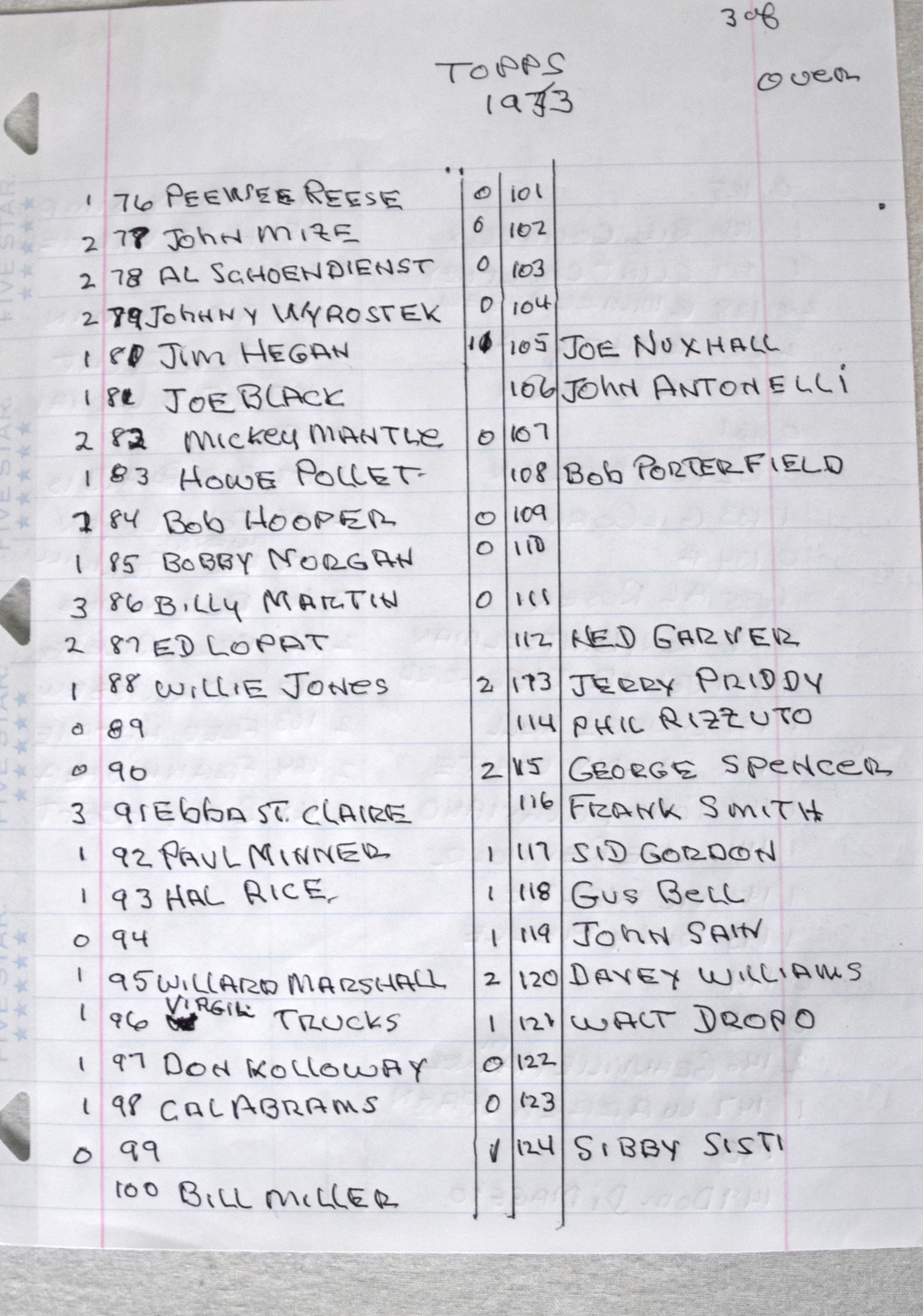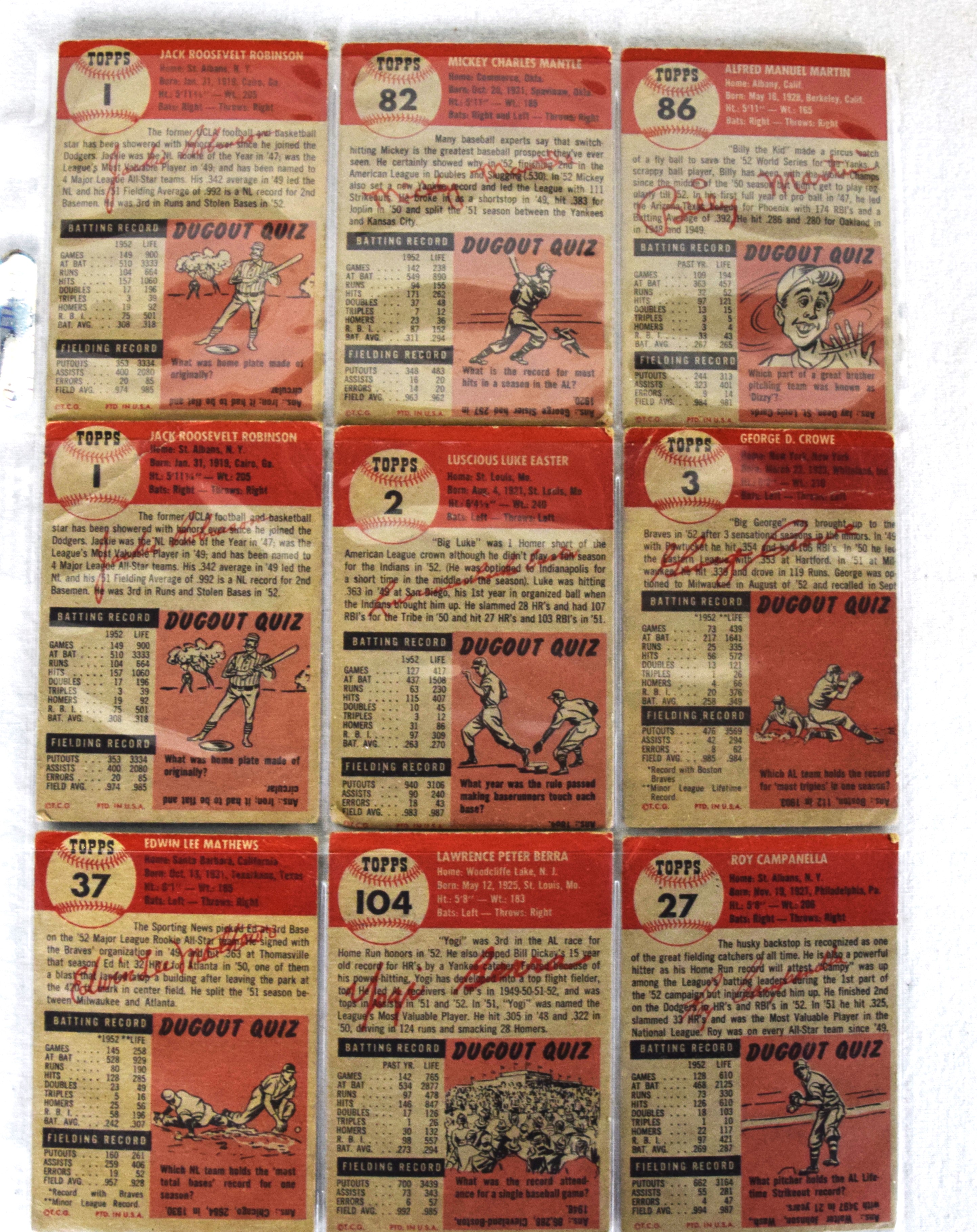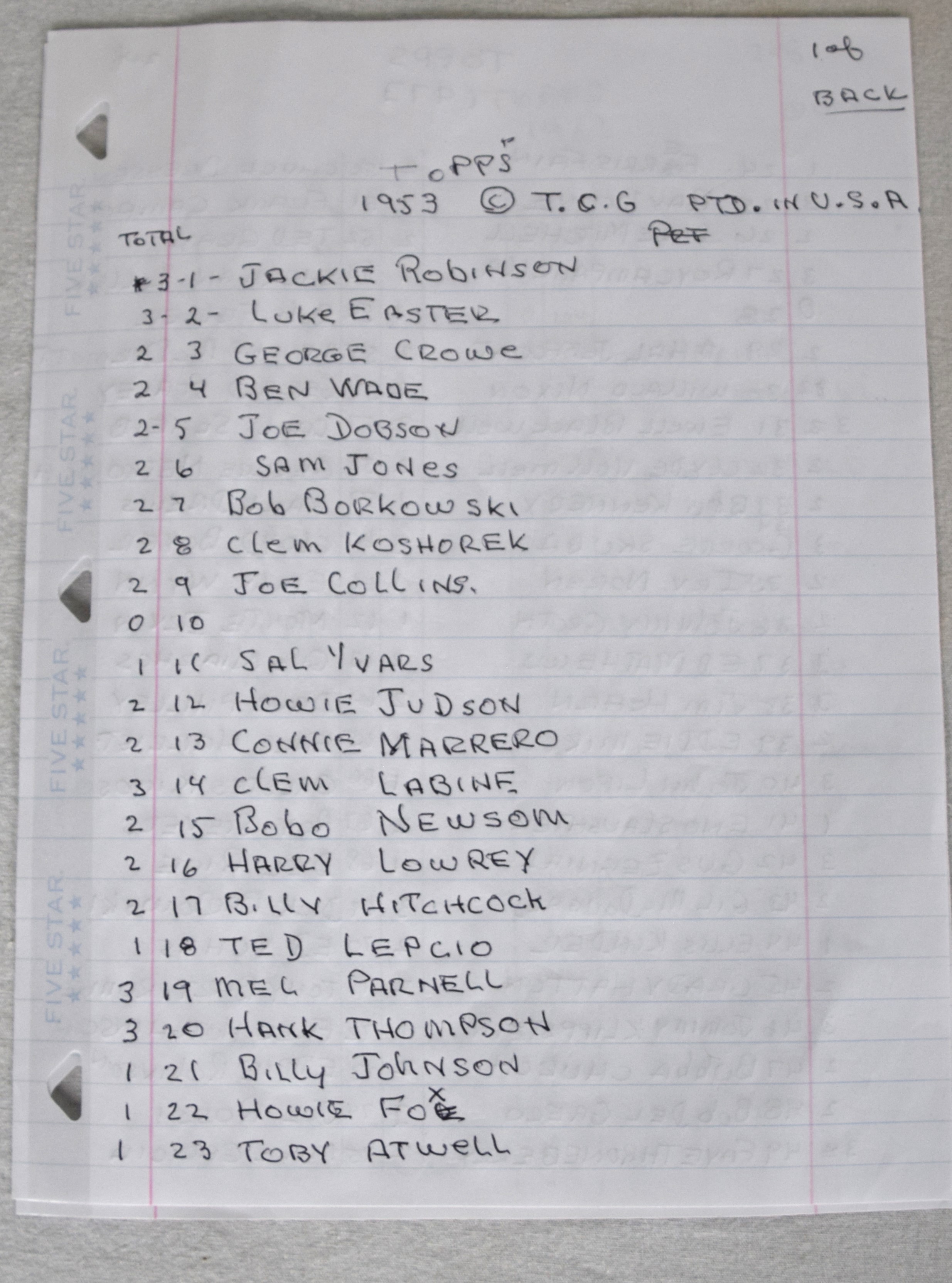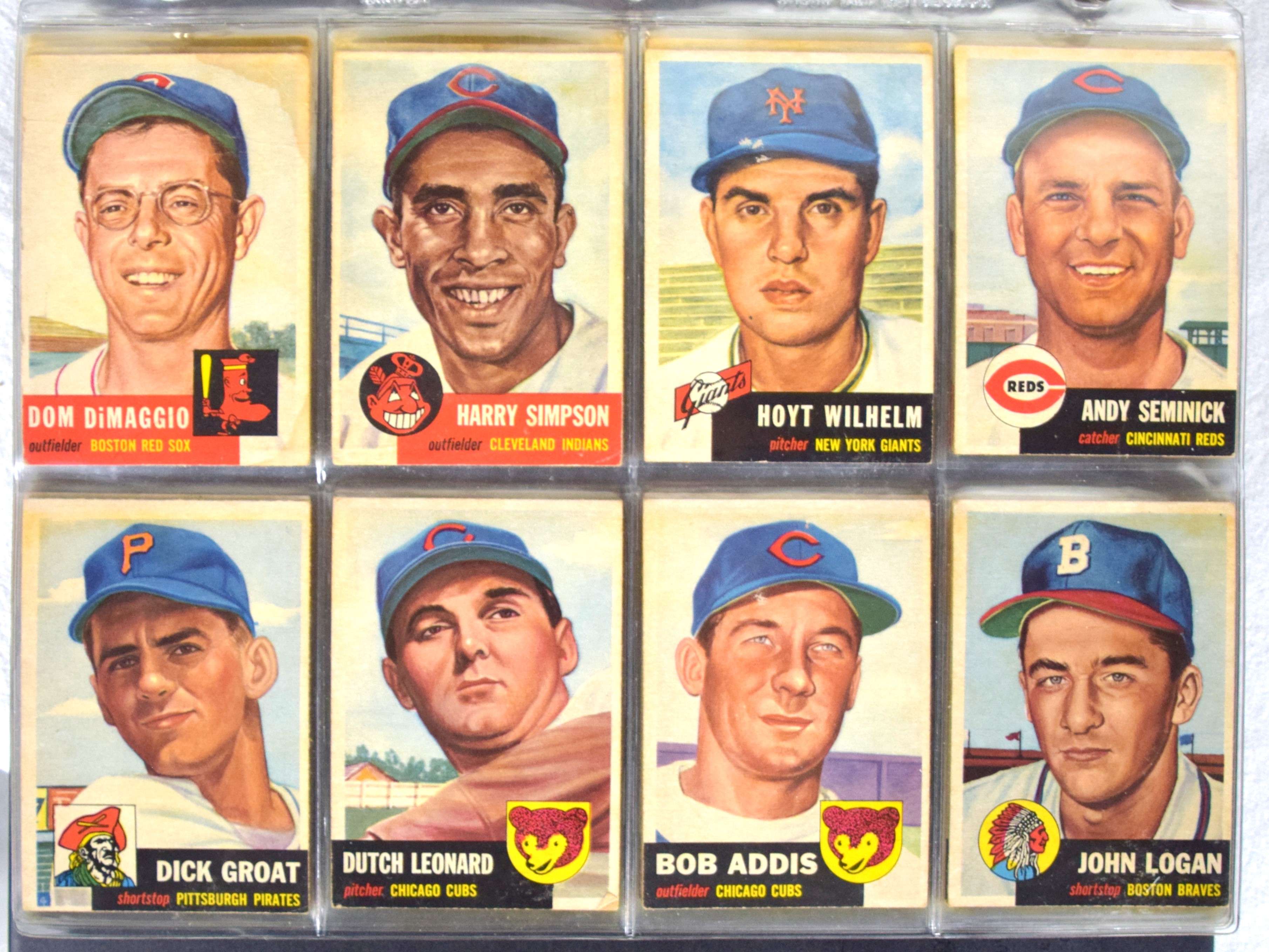 Approximately 140 Topps 1953 baseball cards including two Jackie Robinson (1), Mickey Mantle (82), Phil Rizzuto (114) and Waren Spahn (147).