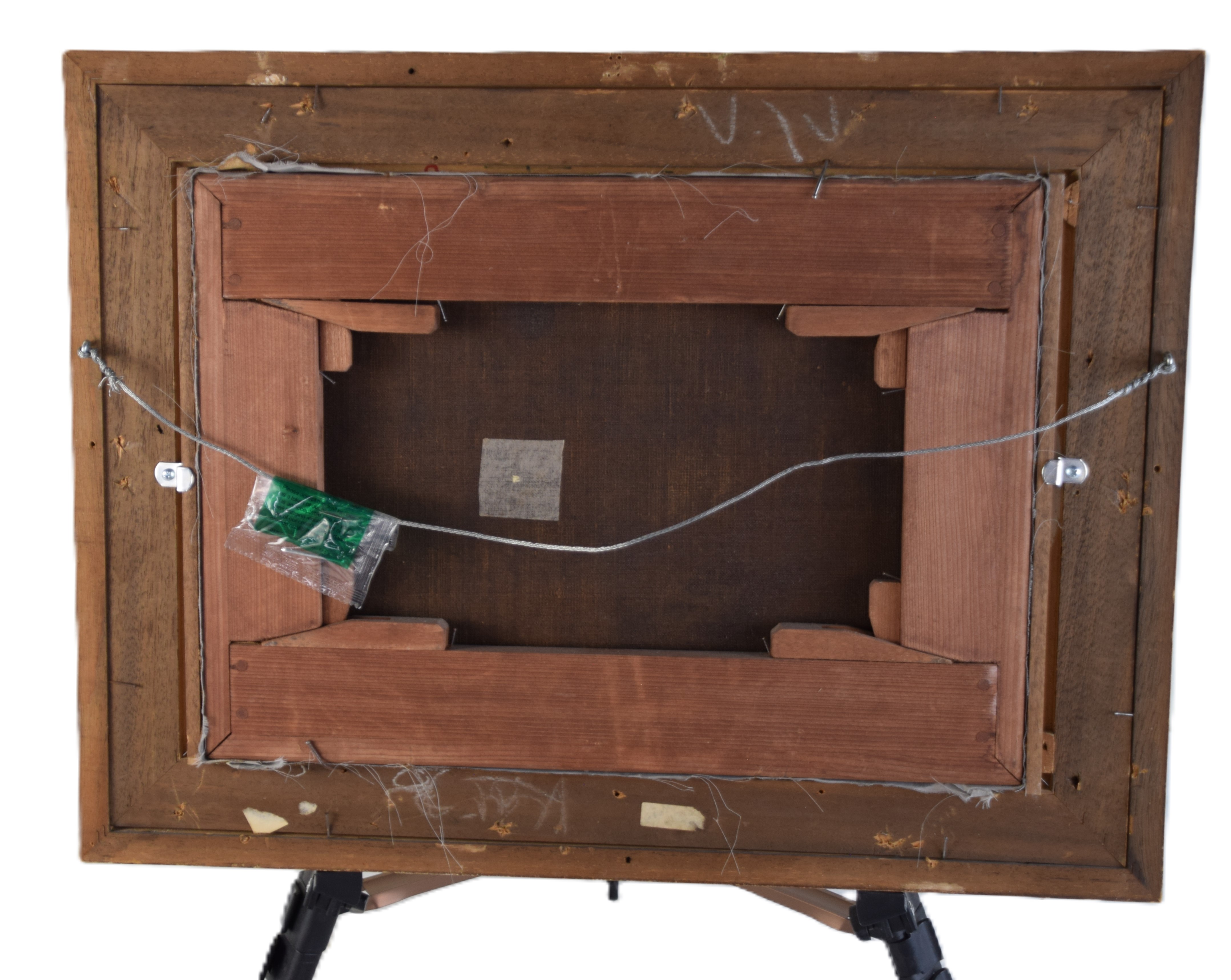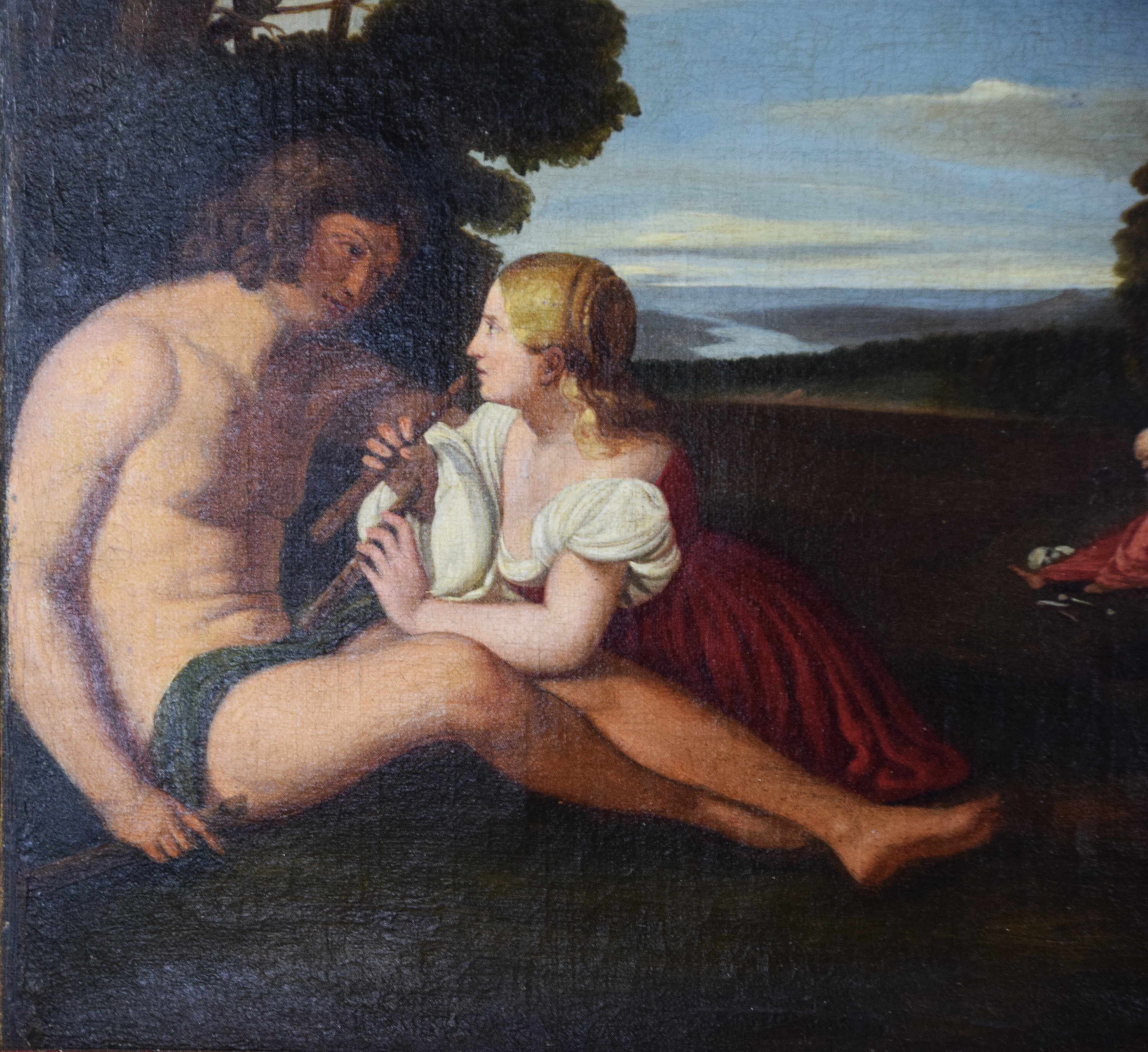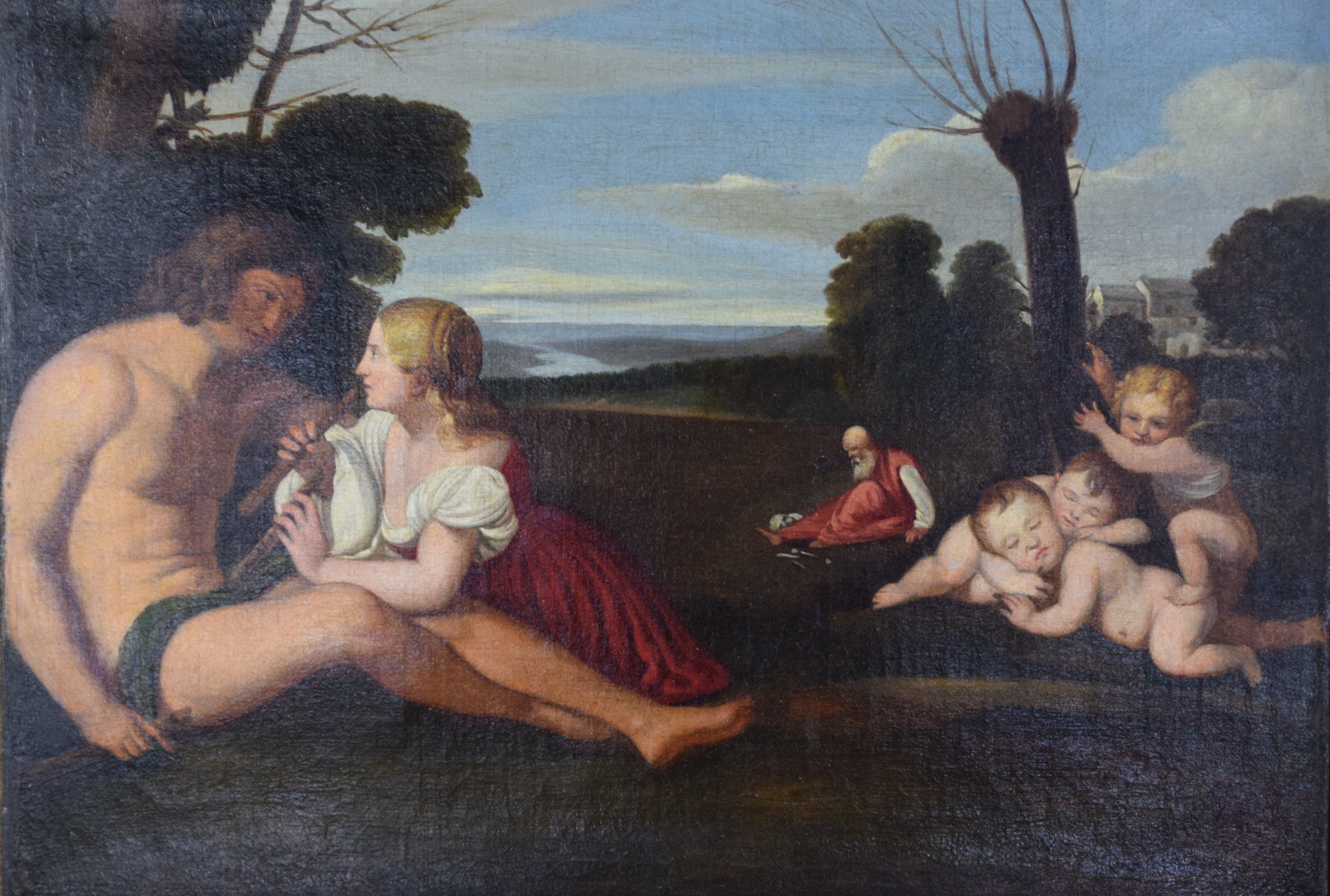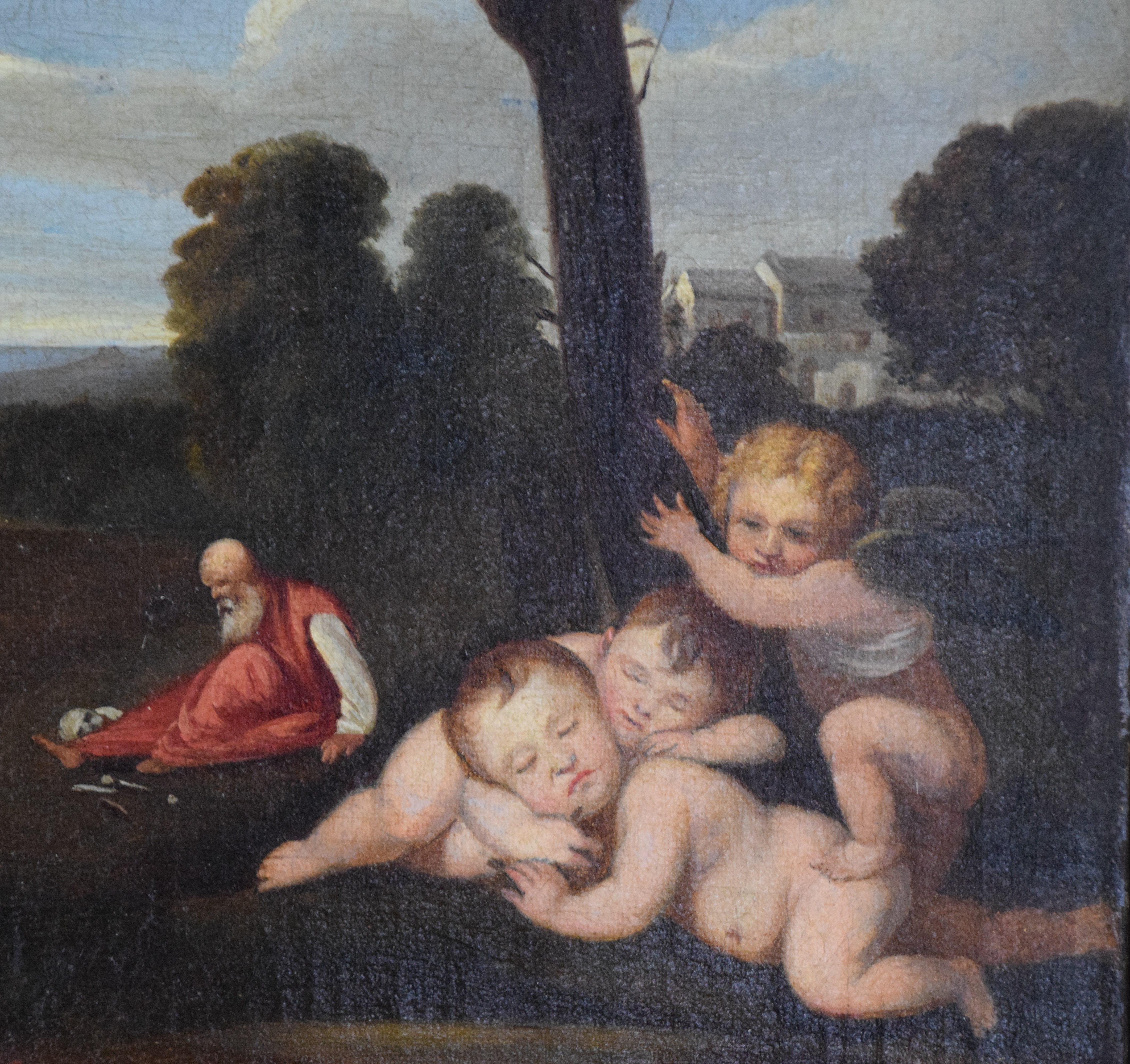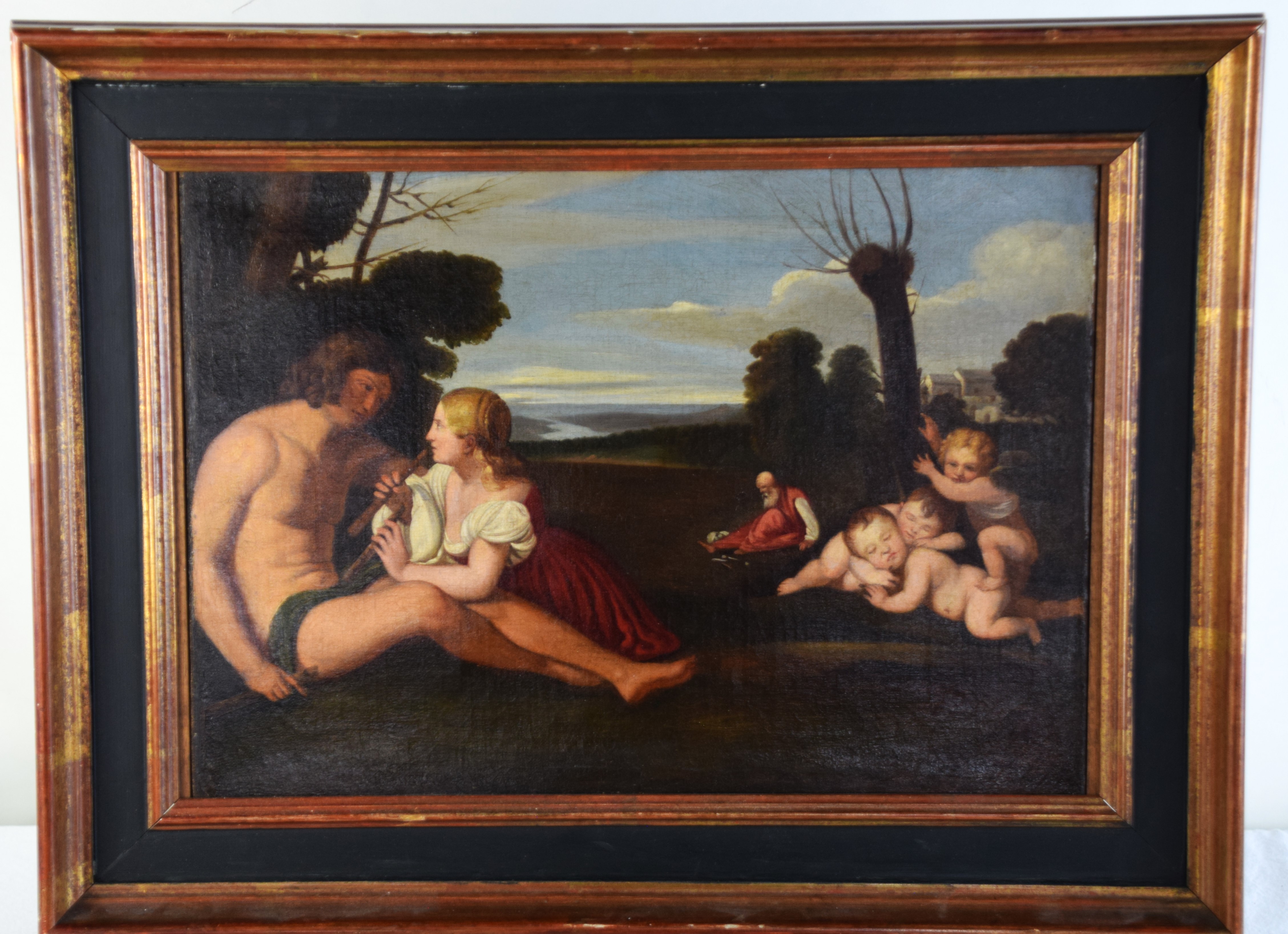 Framed early old master oil on canvas of “The Three Stages Man” an adult man and a women with flutes along with three infants and an old man sitting in the landscape background with a skull and bones. The original Three Ages of Man (Italian Le tree età dell’uomo) is a painting by Titian, dated between 1512 and 1514. Dimensions: 12″ x 17″ Image size, 17″ x 22″ Overall.