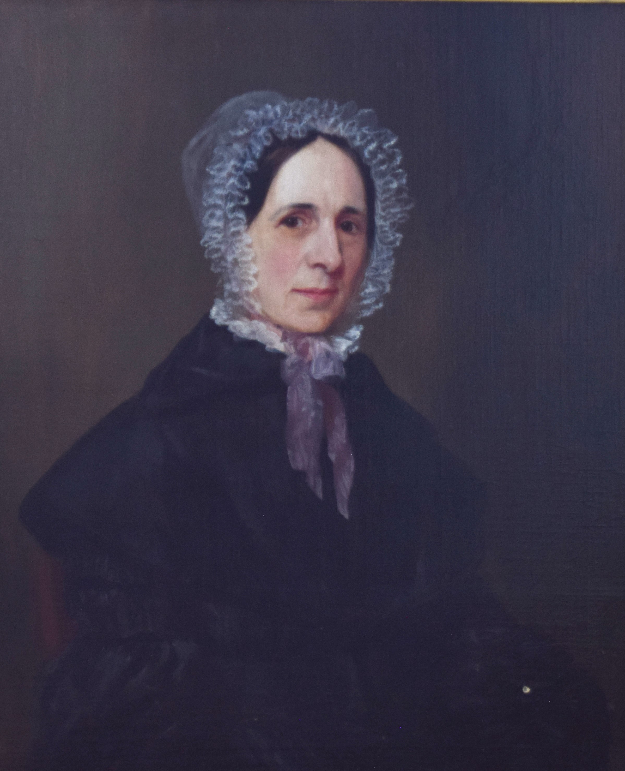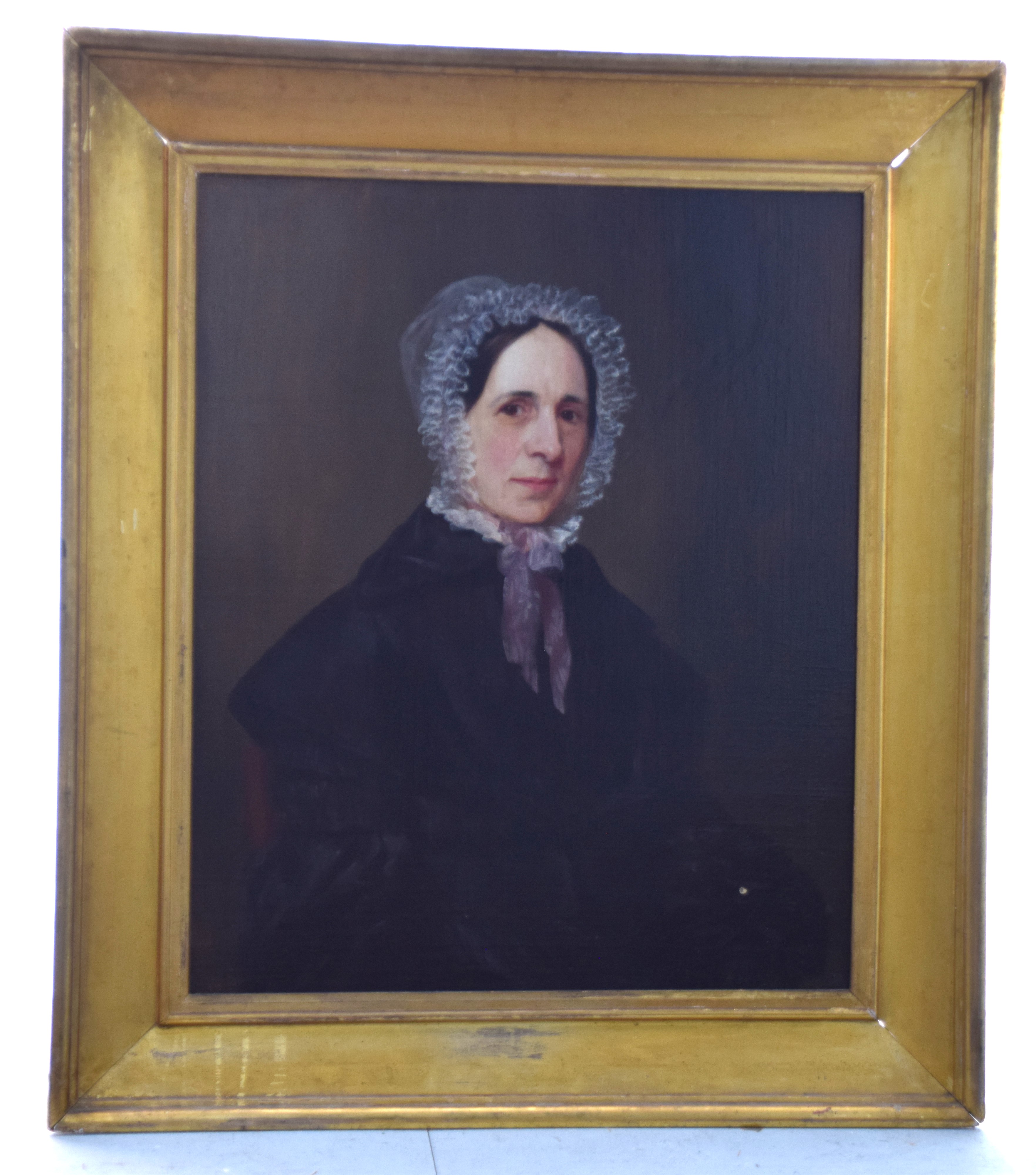 Framed 19 or late 18th Century oil on canvas painting of a women with a lace bonnet. Dimensions: 29.5″ x 24″ Image size, 39″ x 34″ Overall