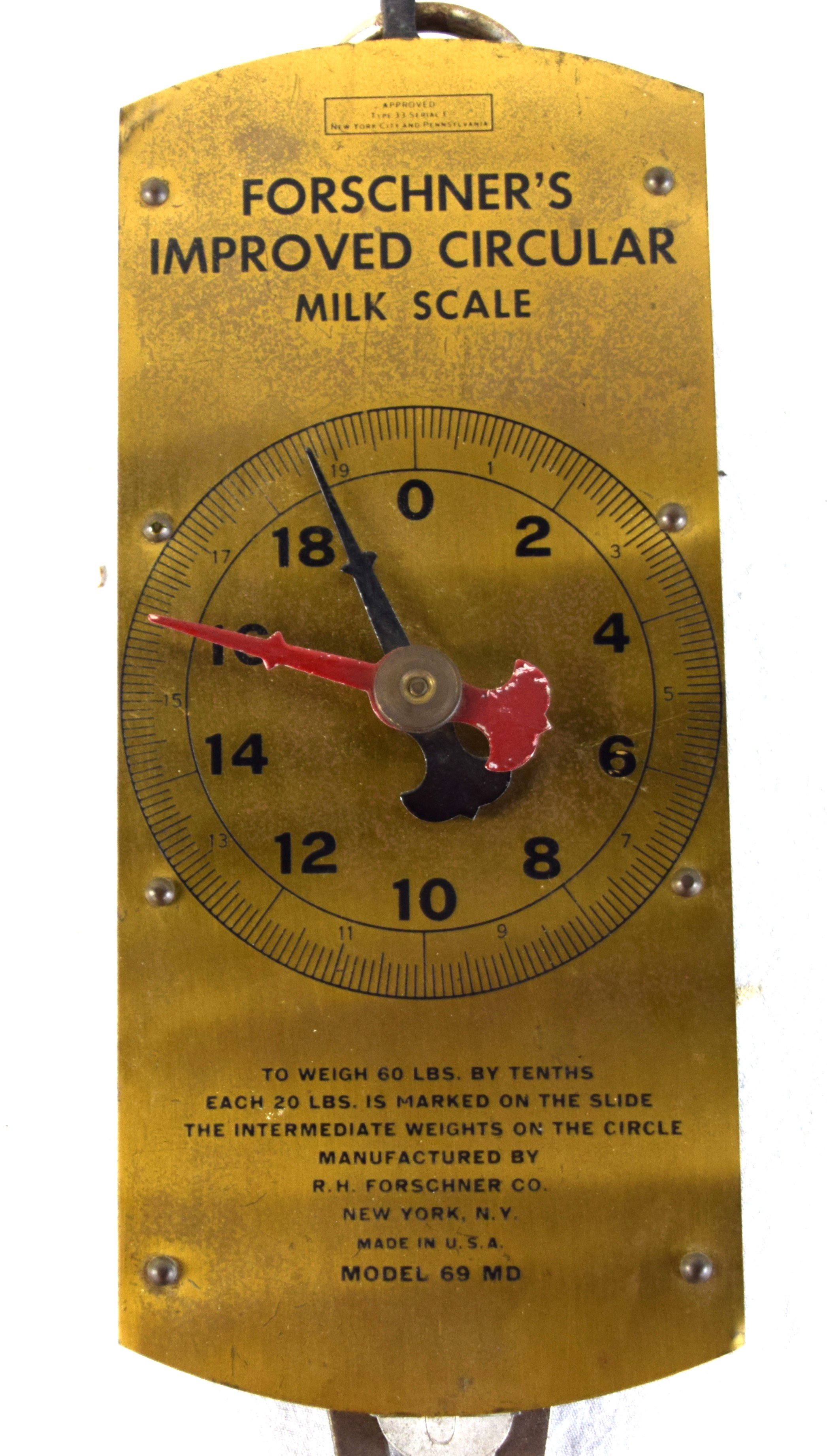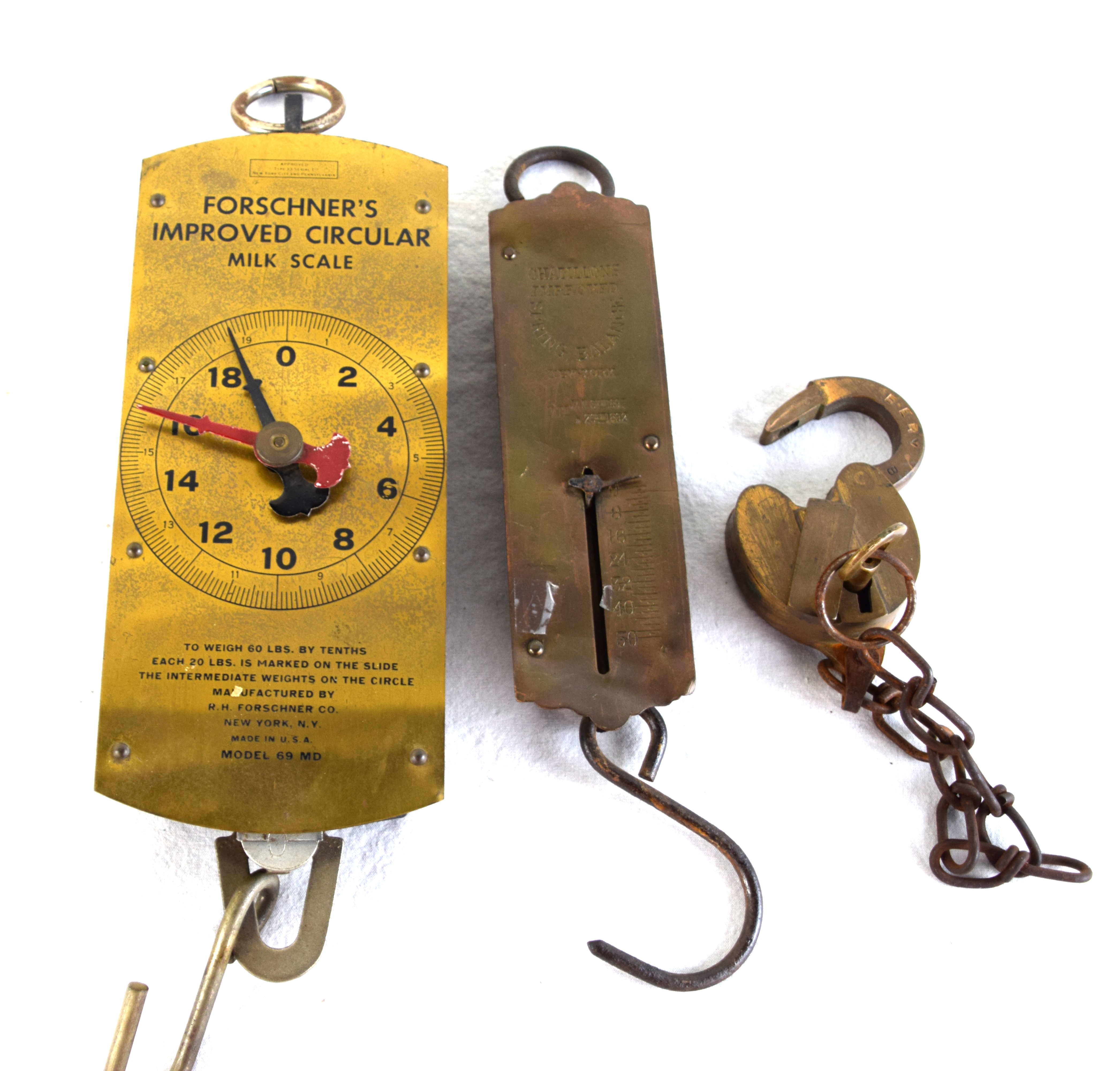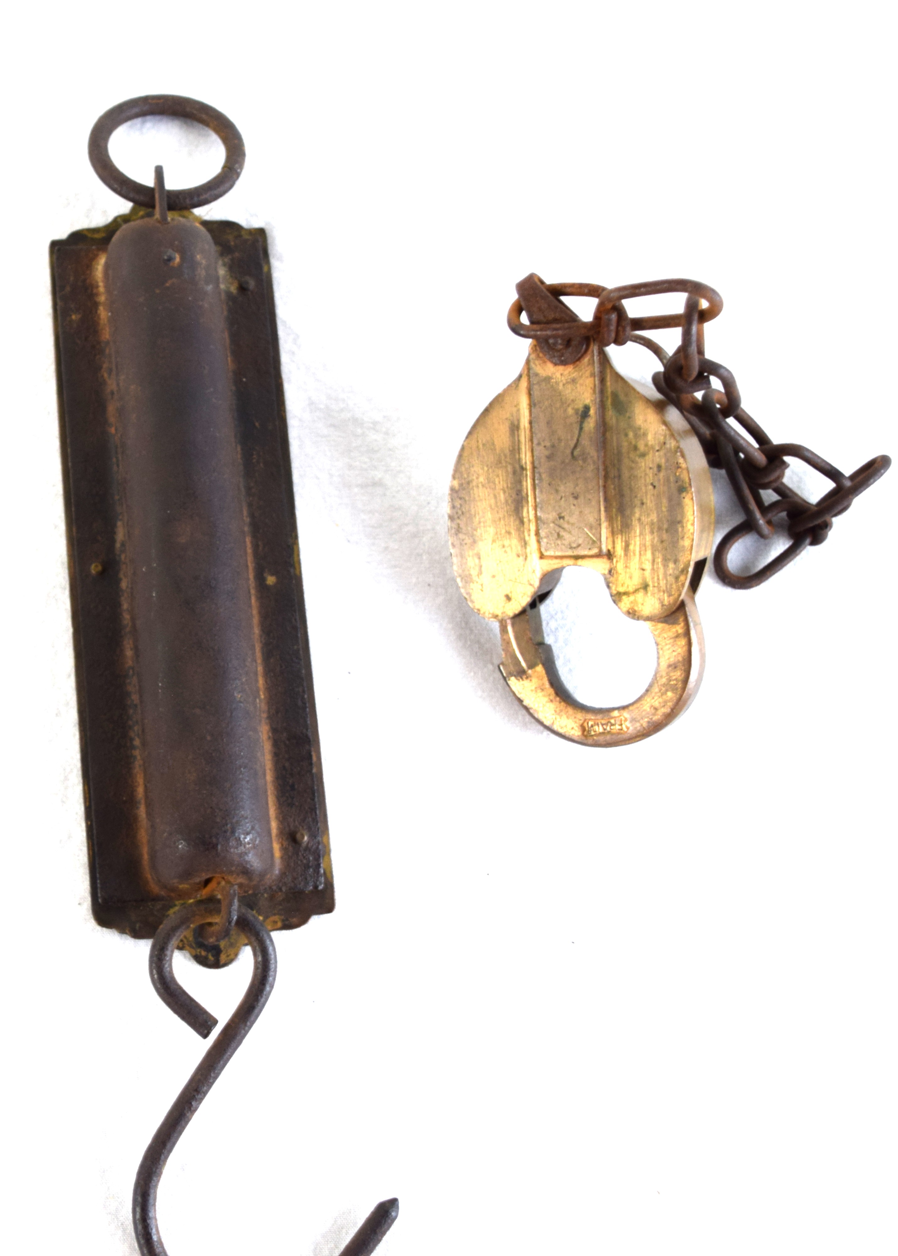 Three piece country lot to include “Chatillons Improved Spring Balance Scale” made of brass (8″), and a “Forschner’s Improved Circular Milk Scale” made of brass (11″) and a antique padlock with key.