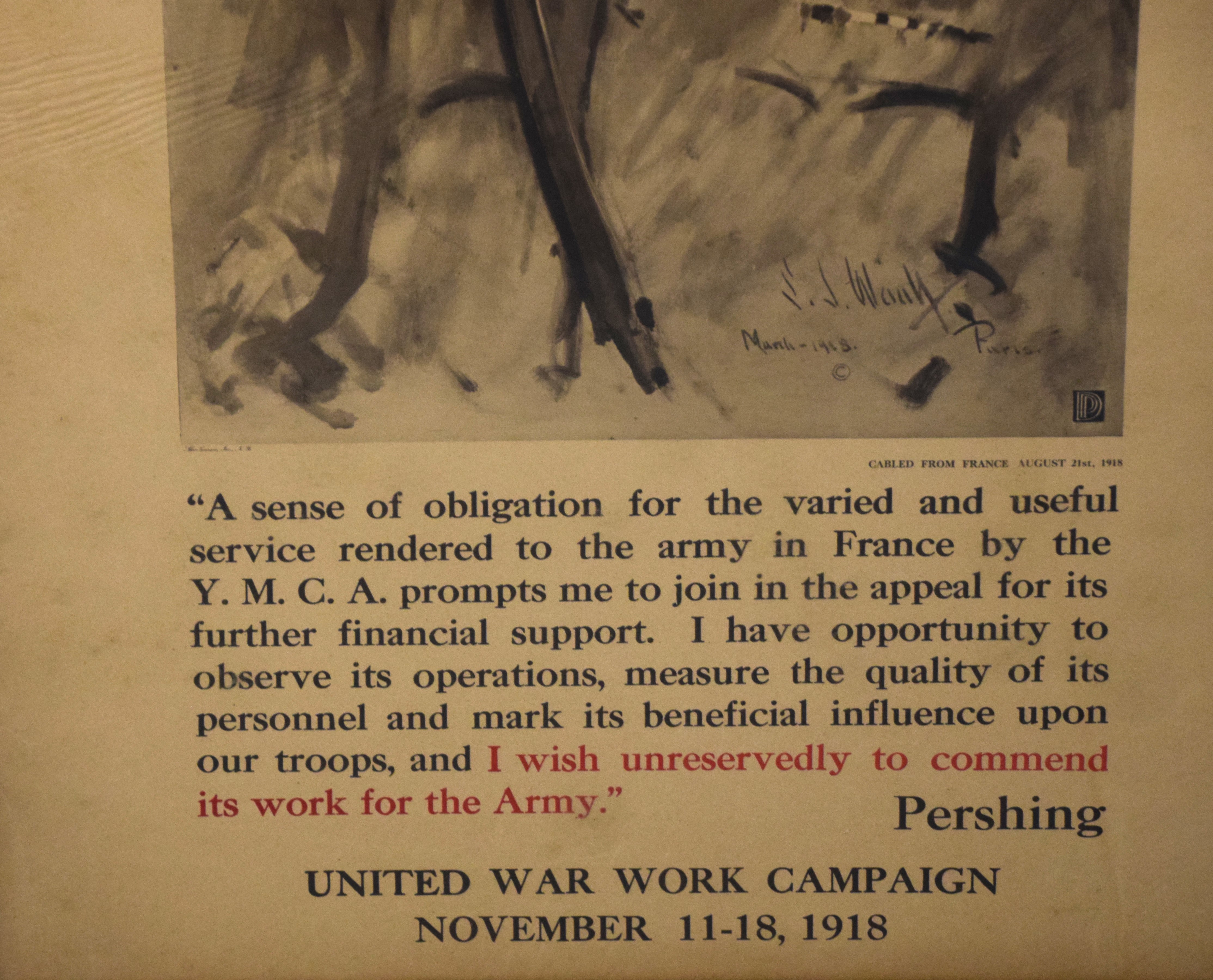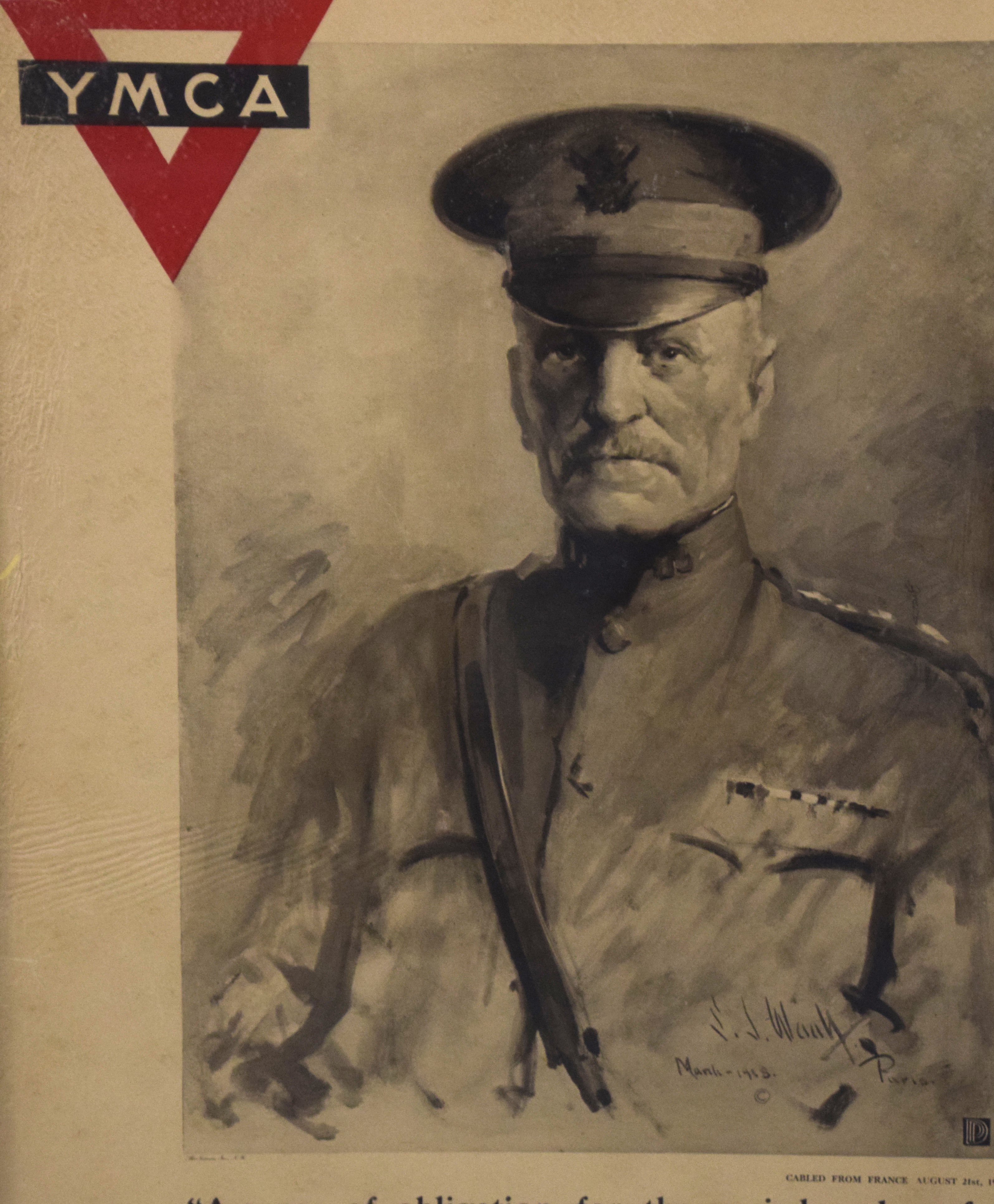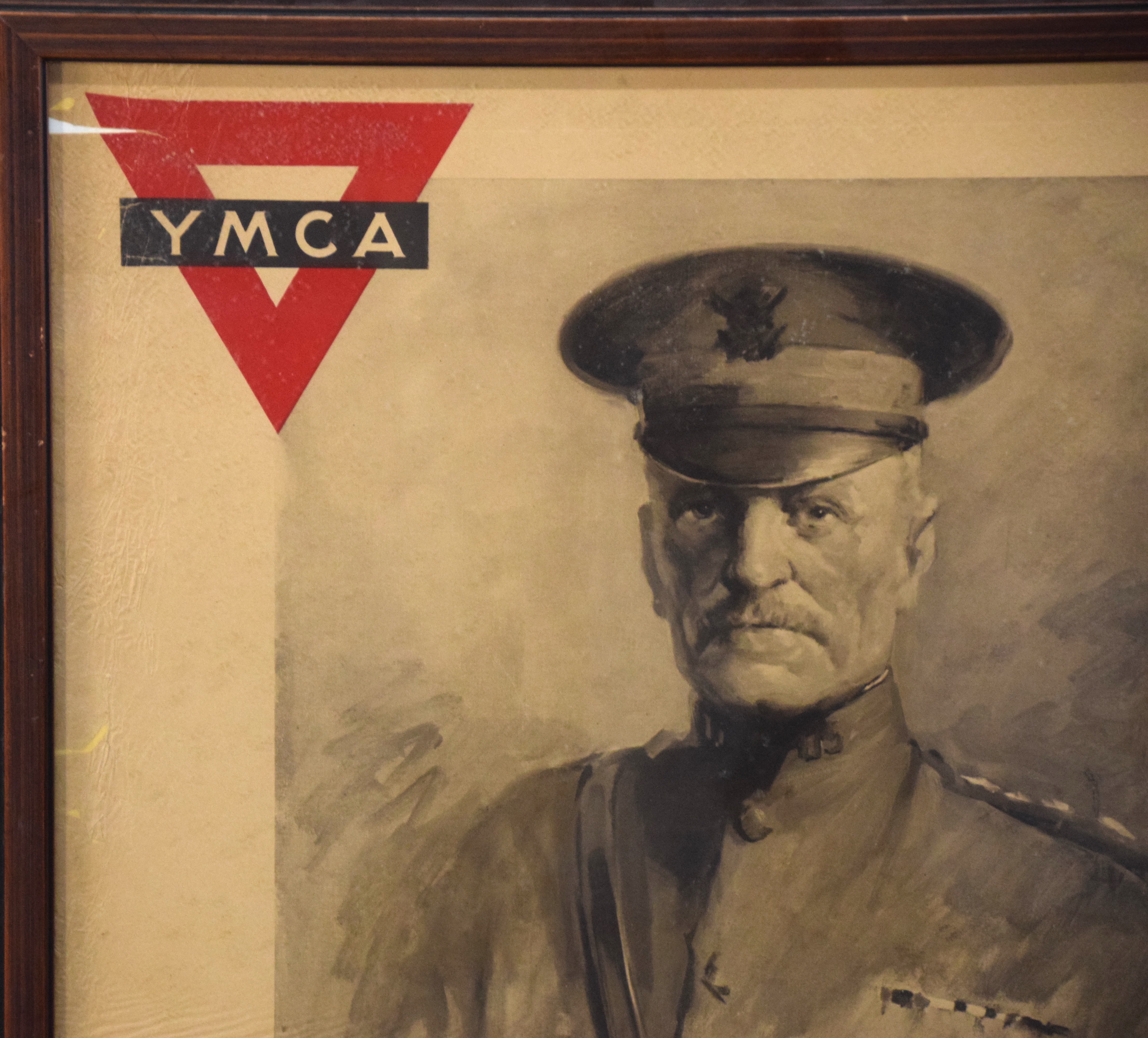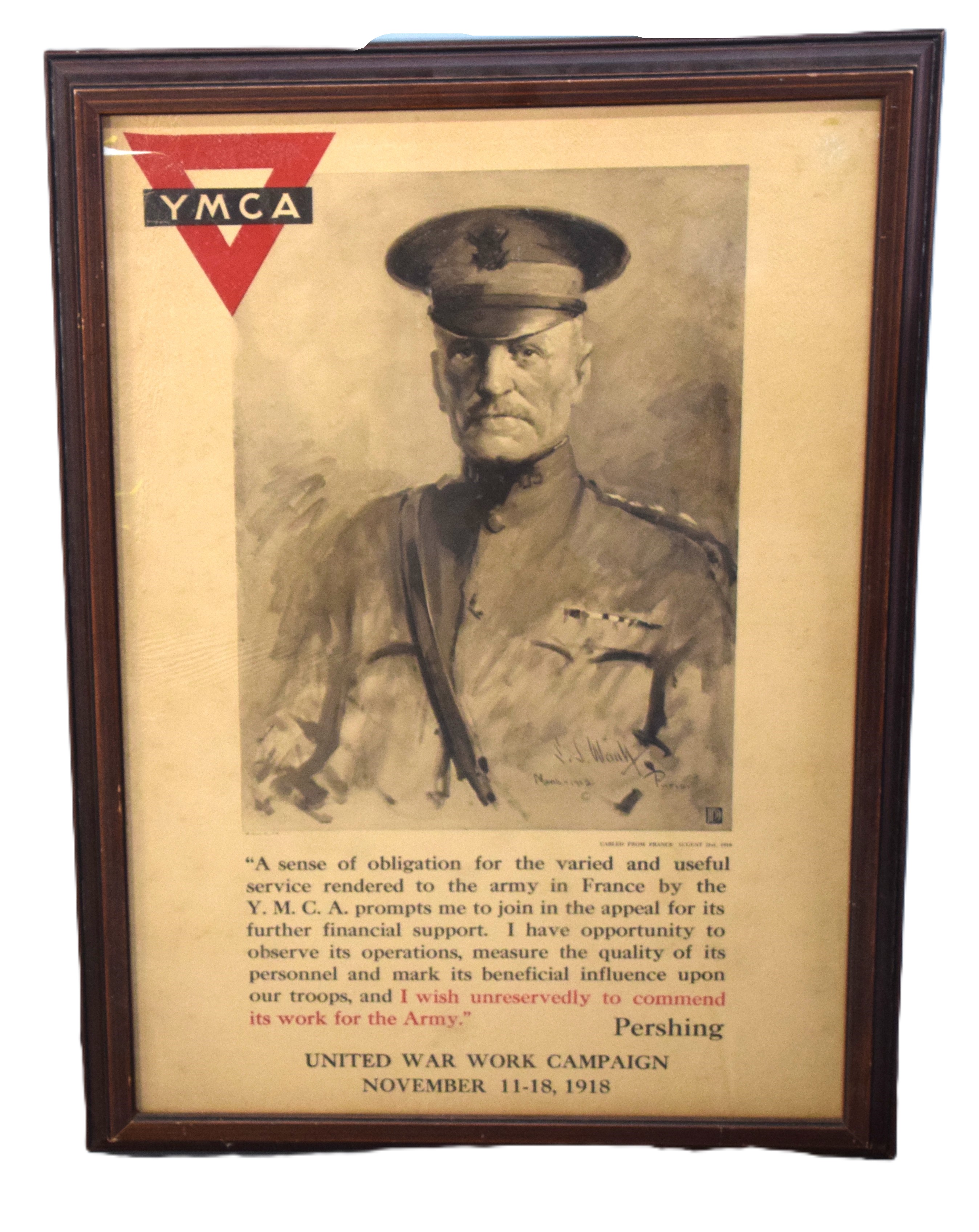 Framed 1918 YMCA finance campaign poster of General Black Jack Pershing. Dimensions: 35″ x 25″ Overall